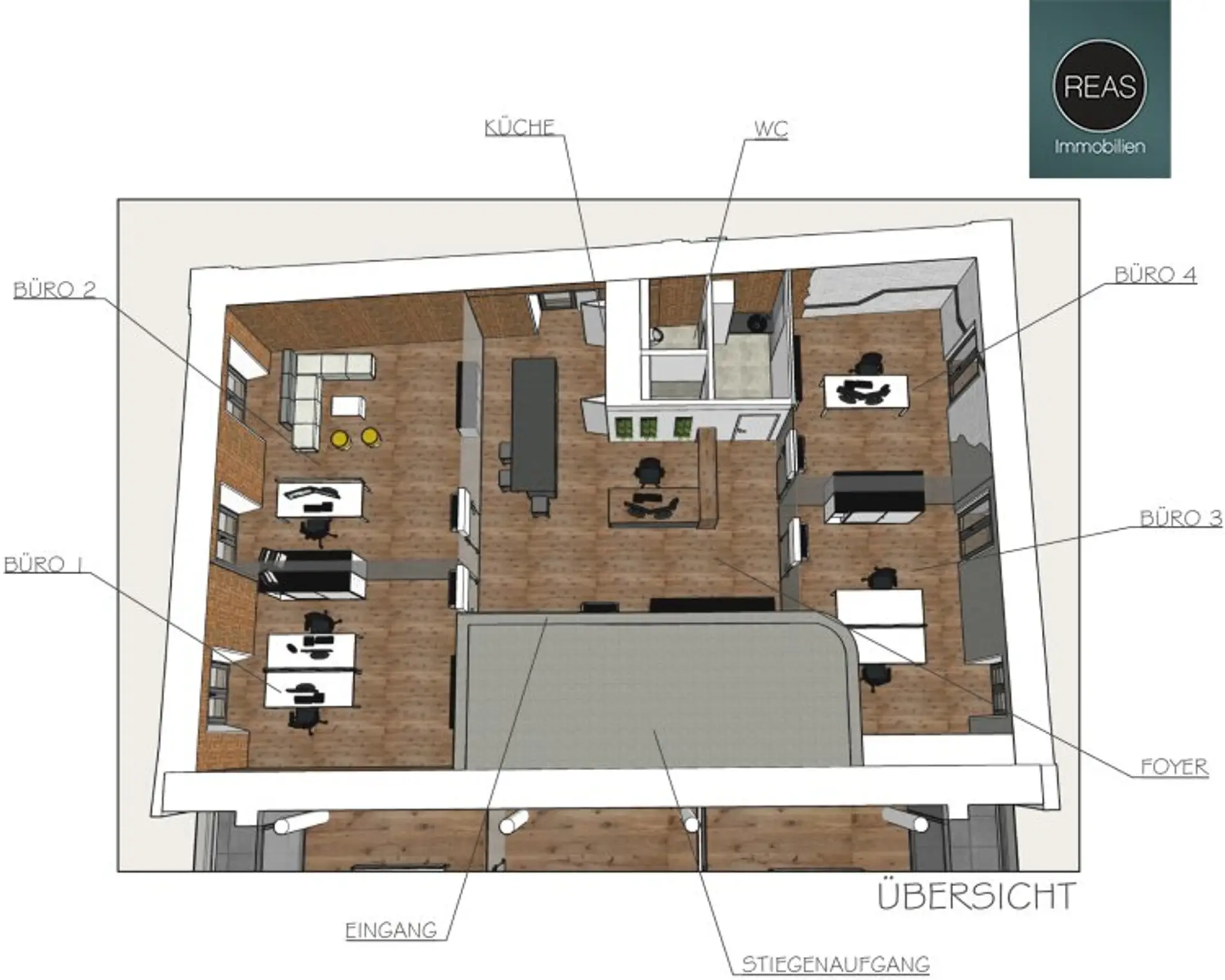 Die auf den Fotos teilweise abgebildeten Büromöbel sind nicht inkludiert.