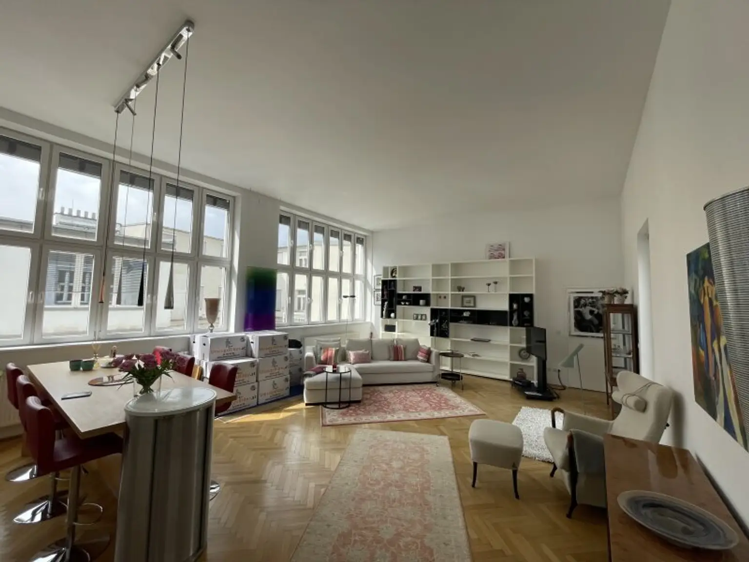 Vom Vorraum mit Garderobe gelangt man zu WC, Bad mit Wanne und Dusche, begehbarem Schrank, Schlafzimmer (14,19 m²) und in den großen und loftartigen Wohnsalon (52,07 m²) mit offener Küche.