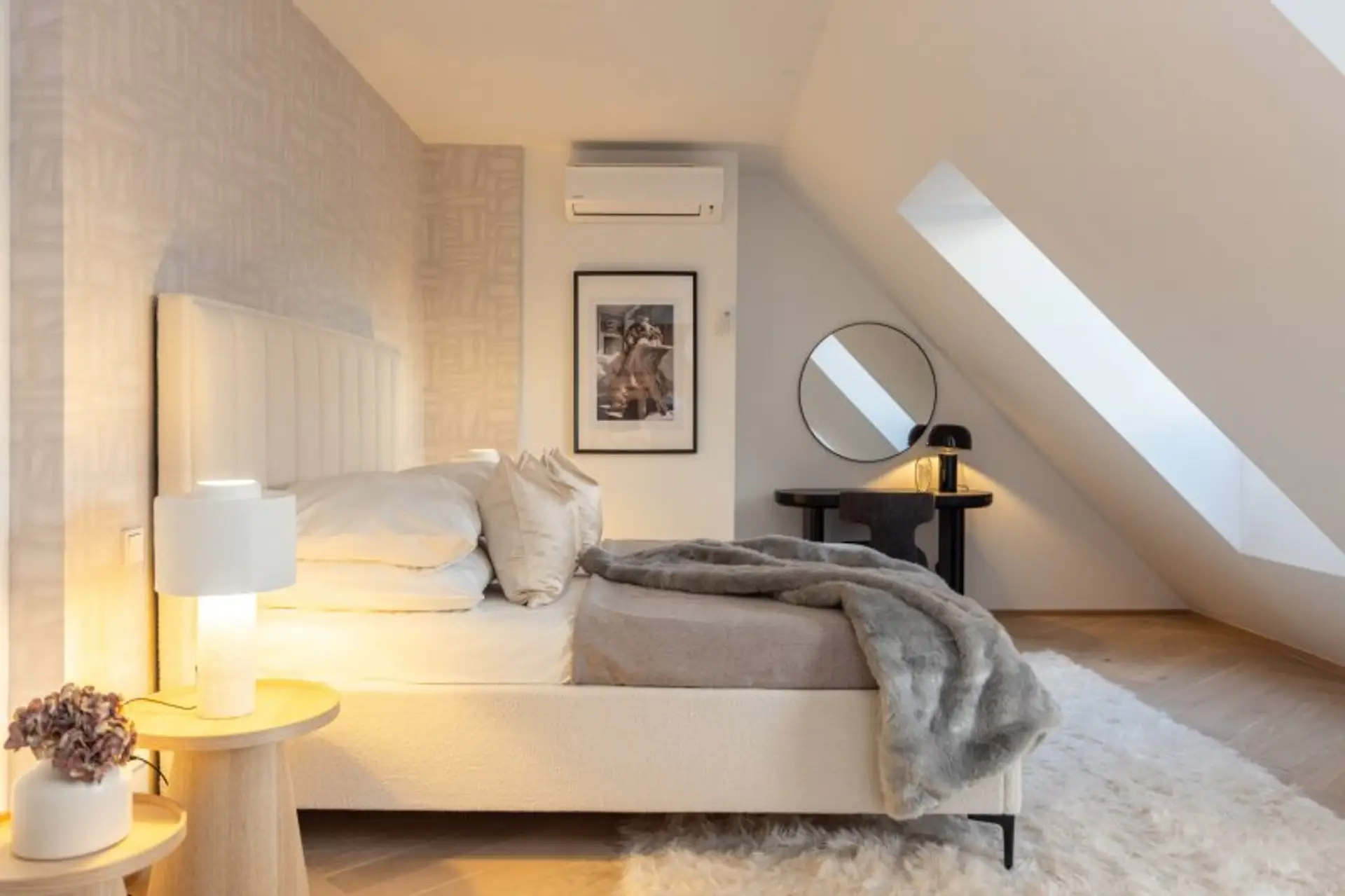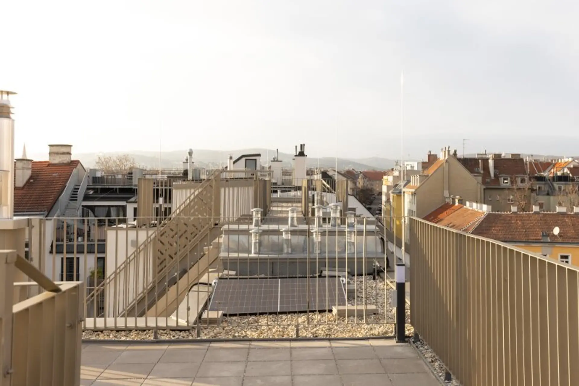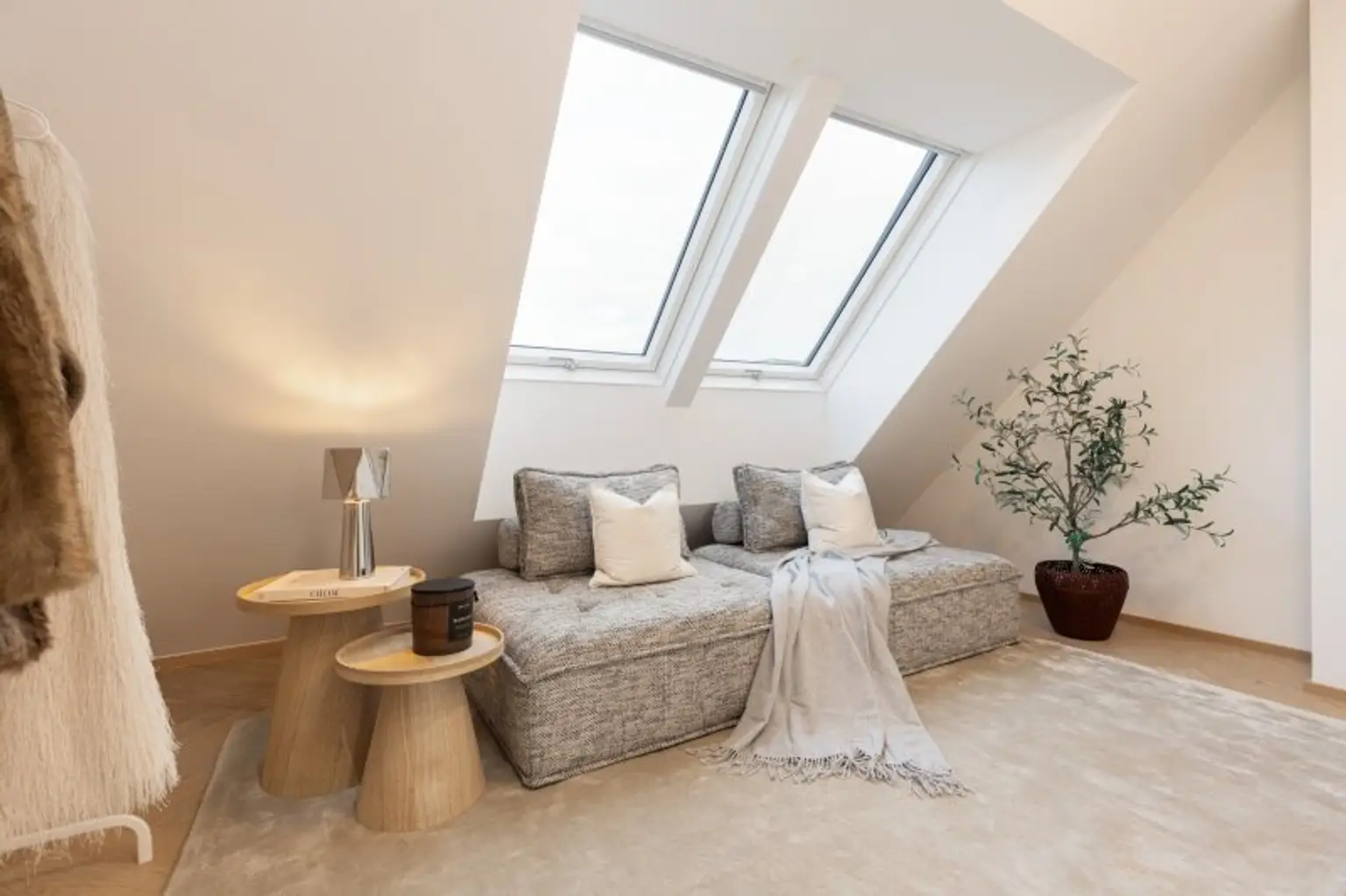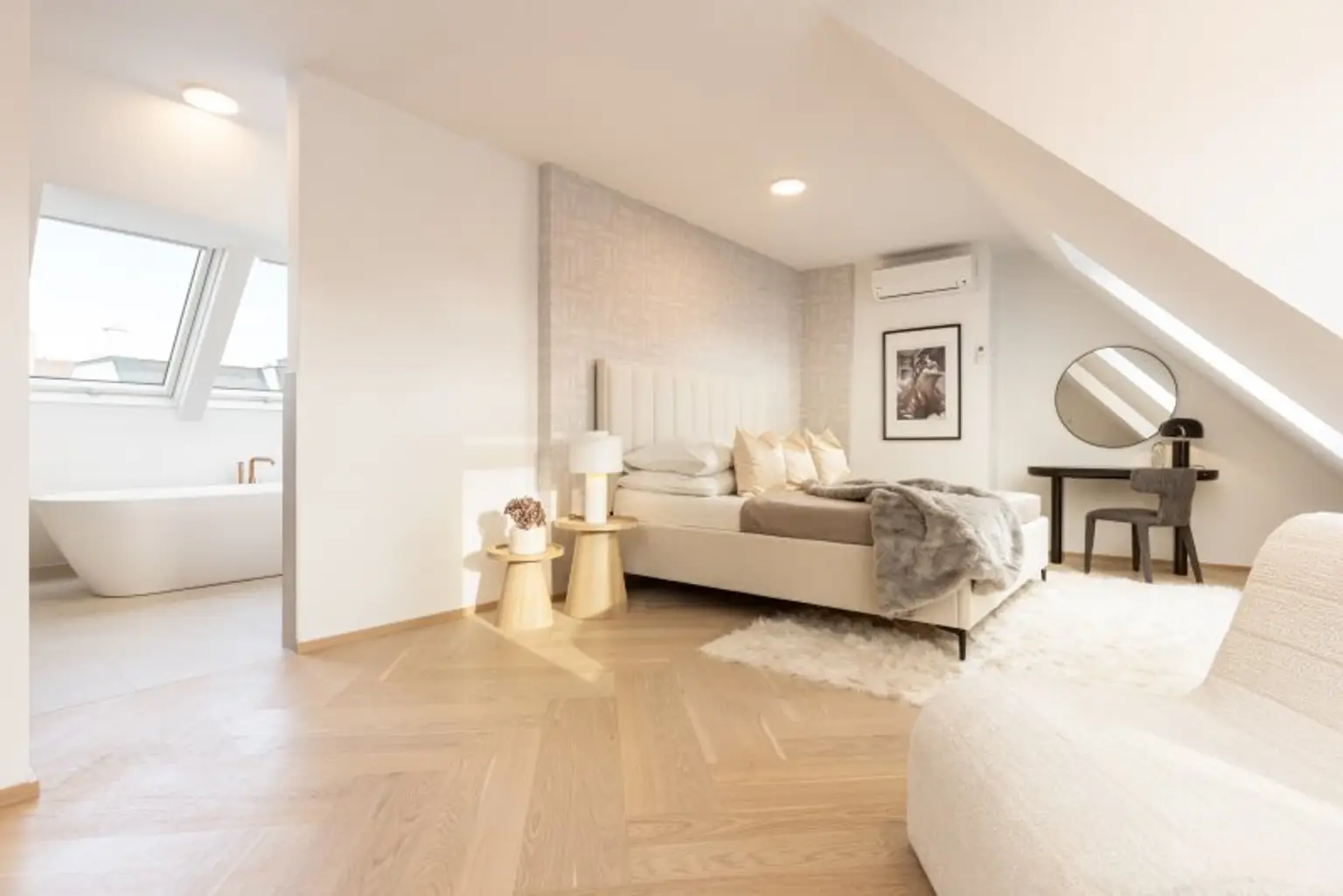 Das Schlaf- und Wellnessbereich lädt direkt zum Entspannen und Wohlfühlen ein. Durch gekonnte Raumgestaltung wurden die beiden Bereiche ideal verbunden und bieten ausreichend Platz für Stauflächen für Garderobe. Eine freistehende Badewanne, ein Doppelwaschbecken, eine Toilette (vorbereitet für eine Japanische Hygiene-Toilette) sowie eine geräumige Dusche in Verbindung mit formschönen, zeitlosen Feinsteinzeugfliesen und den uneinsichtigen Fensterflächen bilden hier das perfekte Ambiente um den Tag voller Energie zu starten oder einen gemütlichen Ausklang in der Badewanne mit Sternenhimmel-Ausblick. Direkt vom Master-Bedroom gelangt man über eine kleinere Terrasse auch auf die erhabene Dachterrasse mit Blick über die nähere Umgebung bis hin zu den Türmen des Rathauses sowie des Stephansdoms in der Innenstadt.