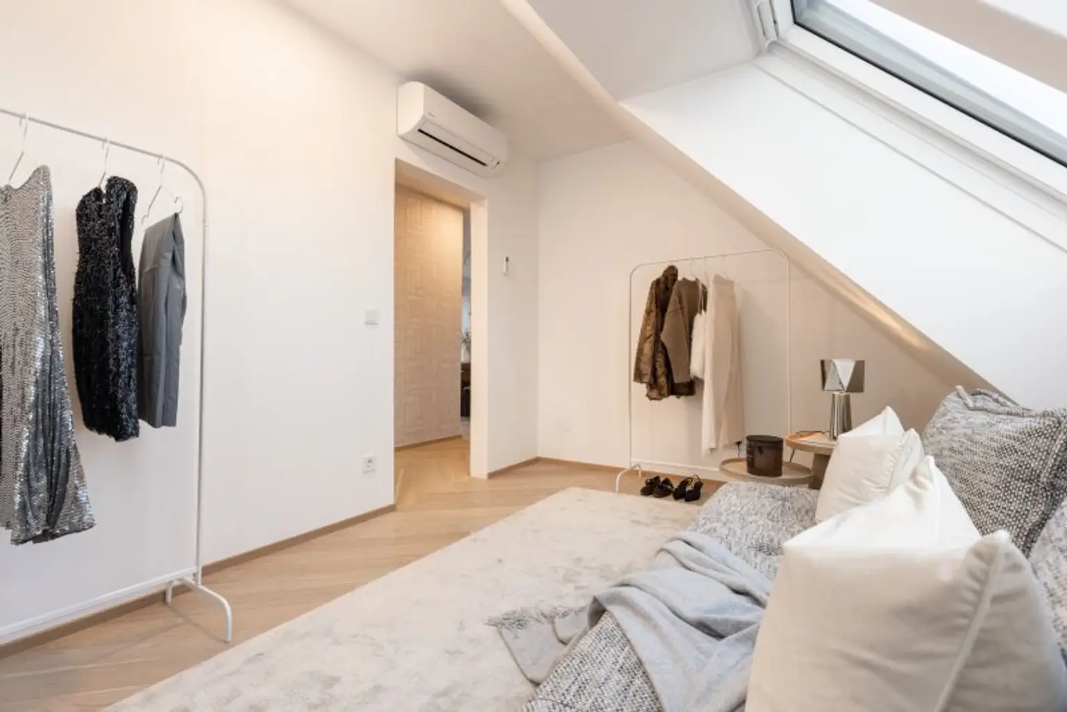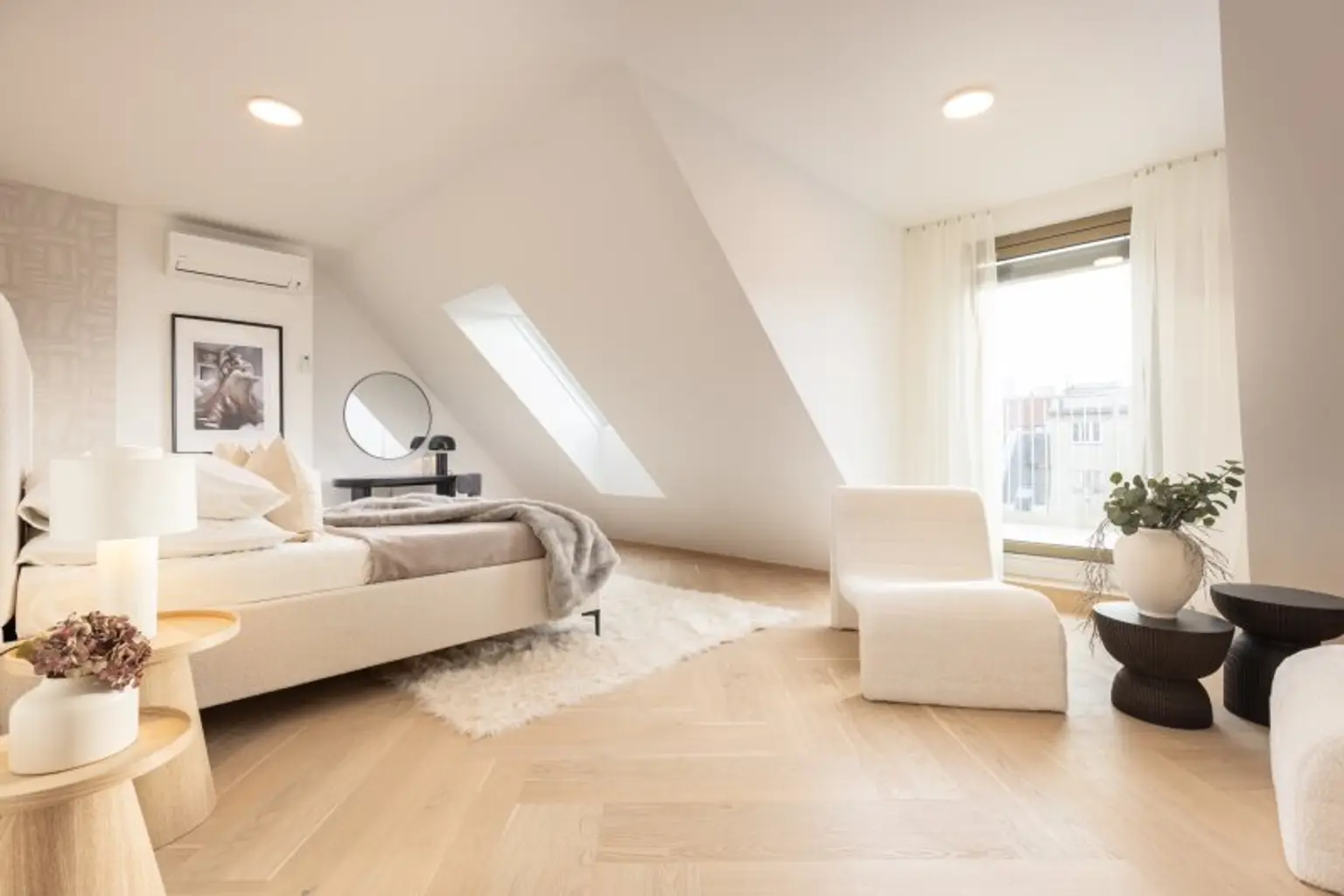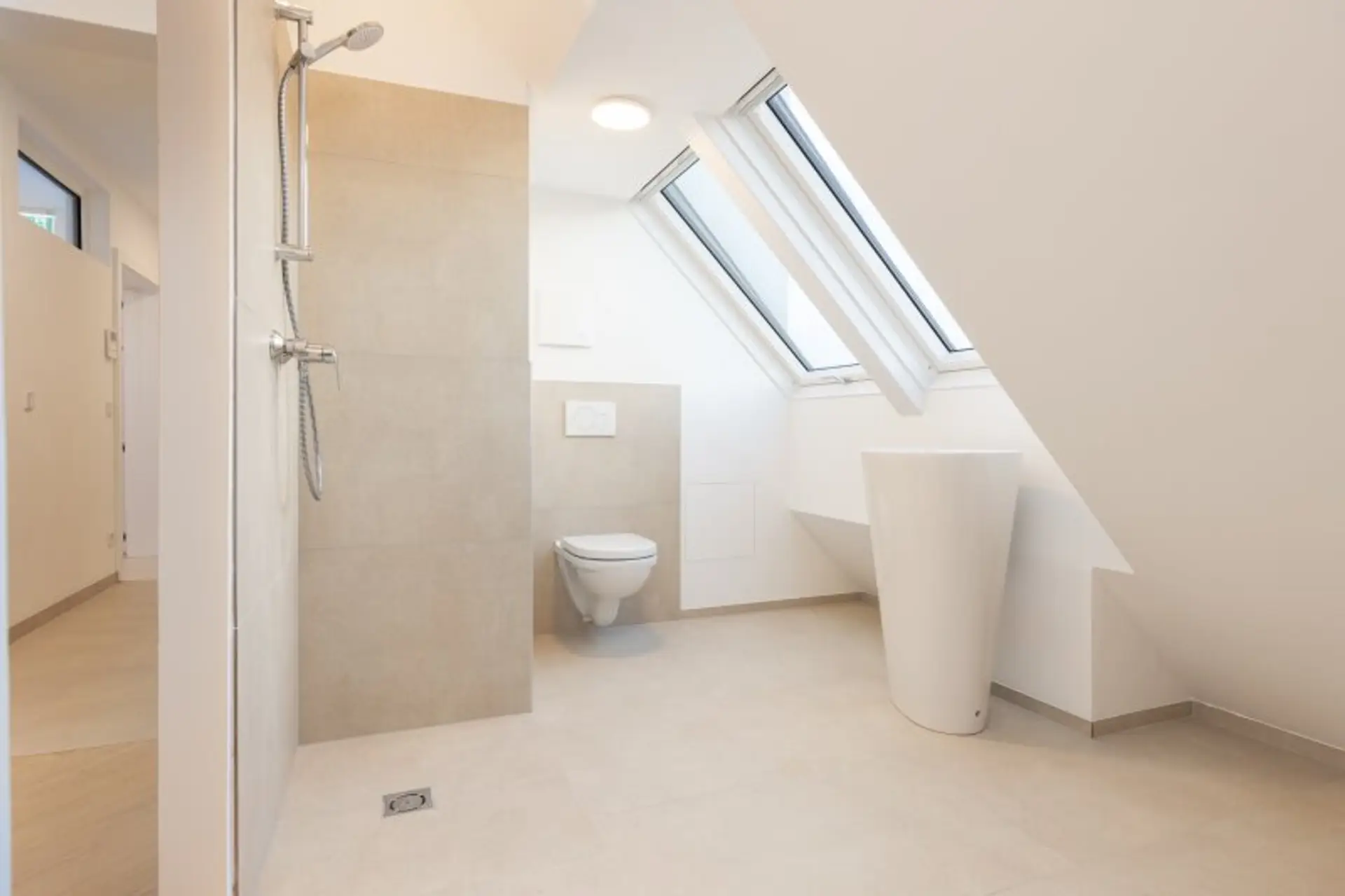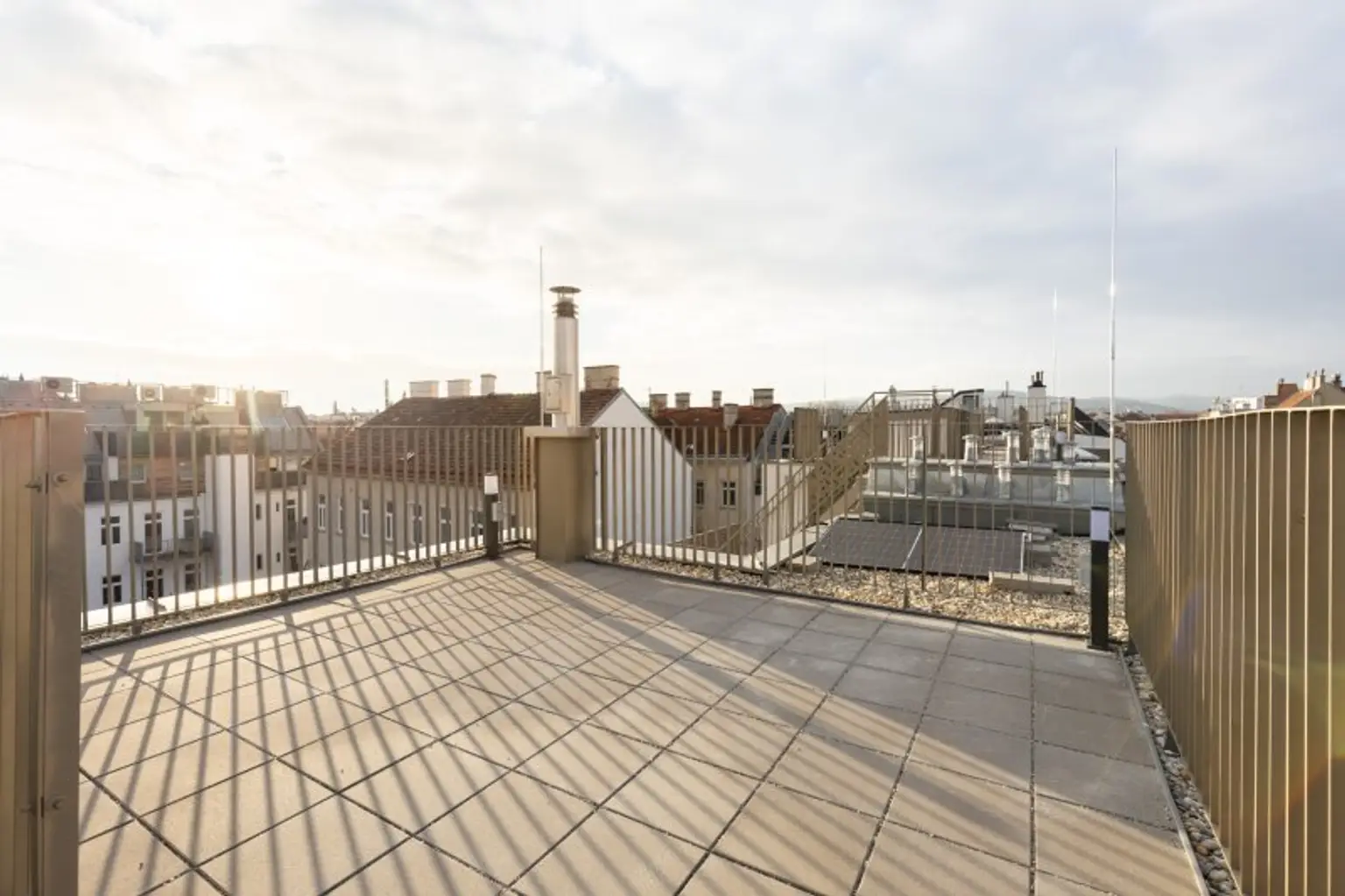 Das Schlaf- und Wellnessbereich lädt direkt zum Entspannen und Wohlfühlen ein. Durch gekonnte Raumgestaltung wurden die beiden Bereiche ideal verbunden und bieten ausreichend Platz für Stauflächen für Garderobe. Eine freistehende Badewanne, ein Doppelwaschbecken, eine Toilette (vorbereitet für eine Japanische Hygiene-Toilette) sowie eine geräumige Dusche in Verbindung mit formschönen, zeitlosen Feinsteinzeugfliesen und den uneinsichtigen Fensterflächen bilden hier das perfekte Ambiente um den Tag voller Energie zu starten oder einen gemütlichen Ausklang in der Badewanne mit Sternenhimmel-Ausblick. Direkt vom Master-Bedroom gelangt man über eine kleinere Terrasse auch auf die erhabene Dachterrasse mit Blick über die nähere Umgebung bis hin zu den Türmen des Rathauses sowie des Stephansdoms in der Innenstadt.