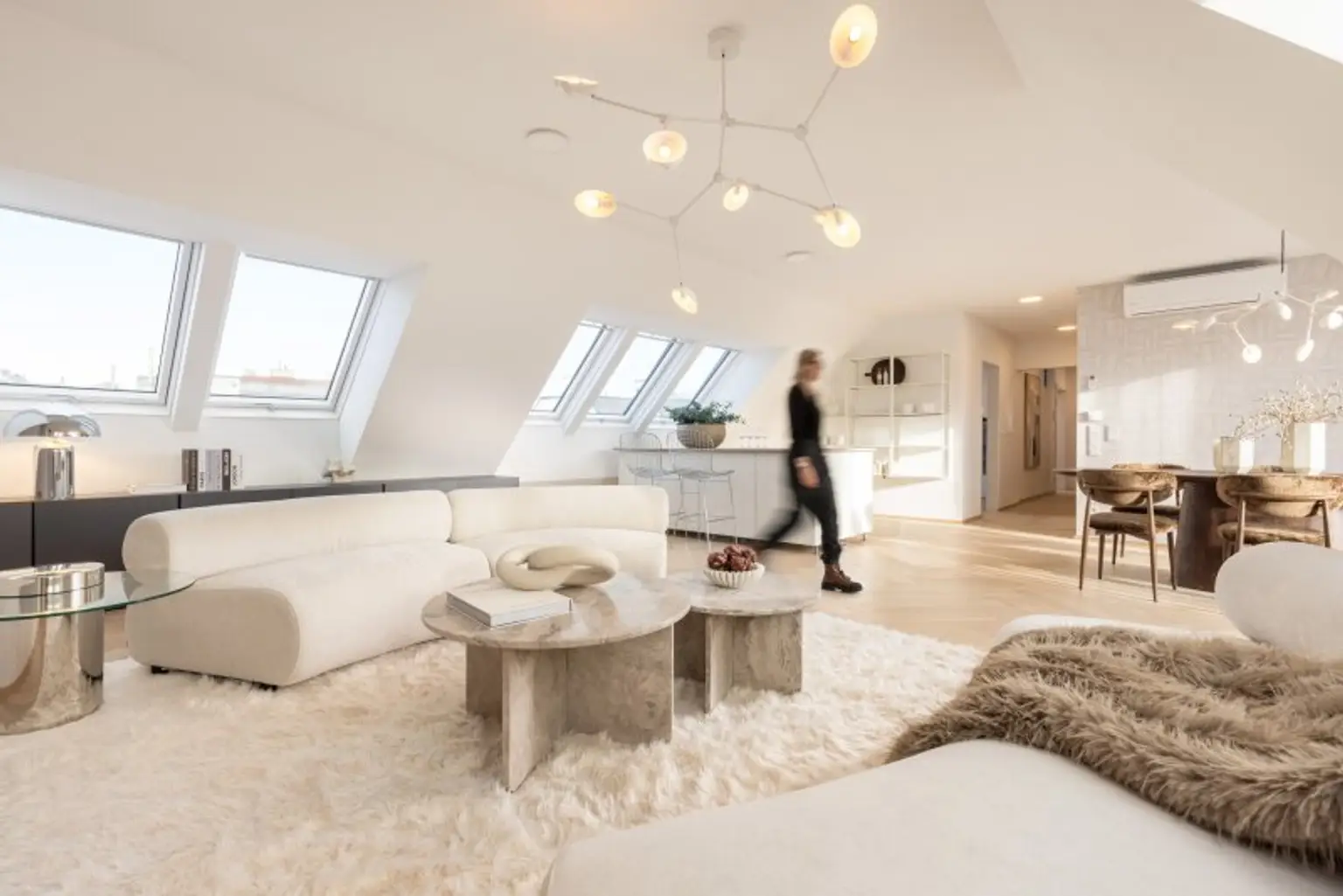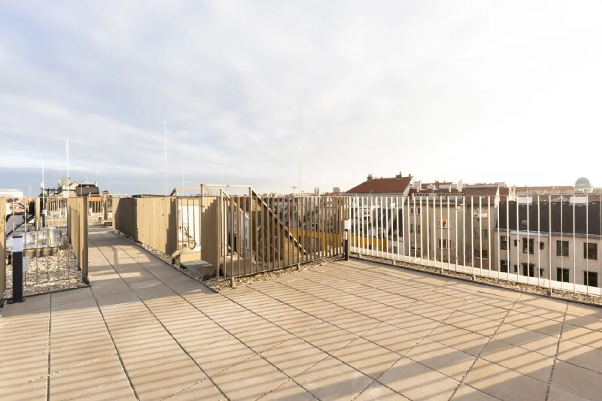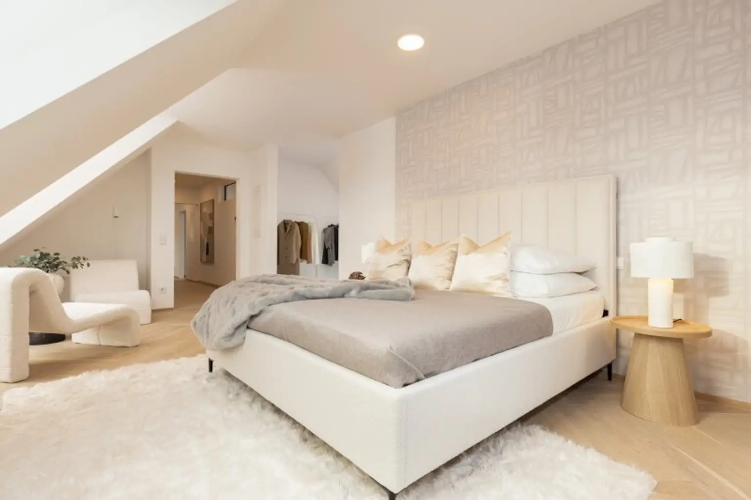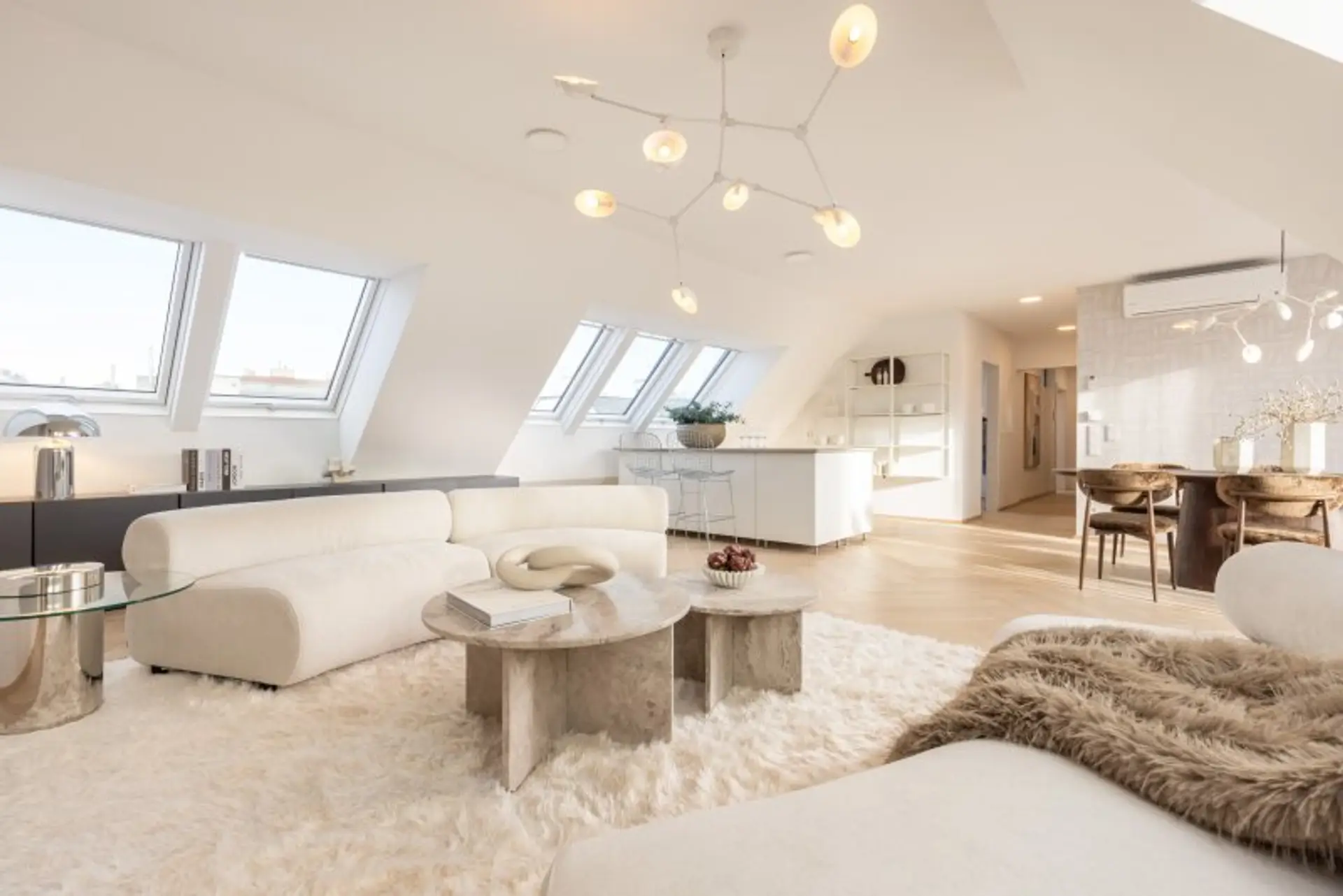 Das Schlaf- und Wellnessbereich lädt direkt zum Entspannen und Wohlfühlen ein. Durch gekonnte Raumgestaltung wurden die beiden Bereiche ideal verbunden und bieten ausreichend Platz für Stauflächen für Garderobe. Eine freistehende Badewanne, ein Doppelwaschbecken, eine Toilette (vorbereitet für eine Japanische Hygiene-Toilette) sowie eine geräumige Dusche in Verbindung mit formschönen, zeitlosen Feinsteinzeugfliesen und den uneinsichtigen Fensterflächen bilden hier das perfekte Ambiente um den Tag voller Energie zu starten oder einen gemütlichen Ausklang in der Badewanne mit Sternenhimmel-Ausblick. Direkt vom Master-Bedroom gelangt man über eine kleinere Terrasse auch auf die erhabene Dachterrasse mit Blick über die nähere Umgebung bis hin zu den Türmen des Rathauses sowie des Stephansdoms in der Innenstadt.