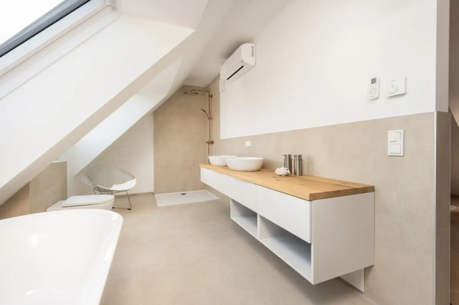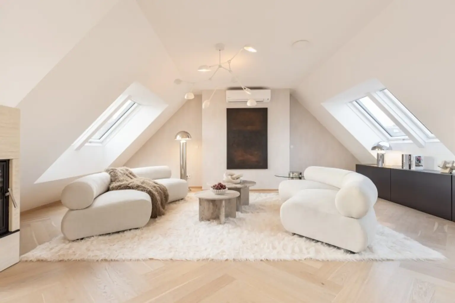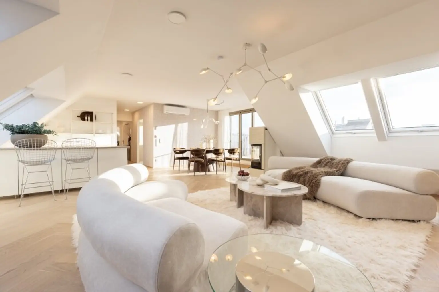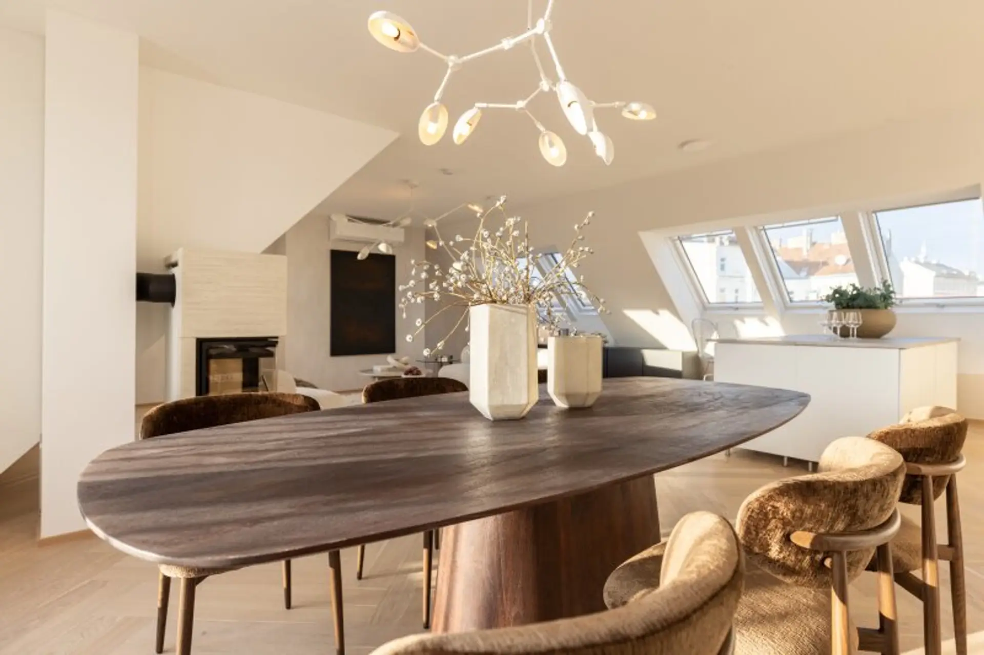 Das Schlaf- und Wellnessbereich lädt direkt zum Entspannen und Wohlfühlen ein. Durch gekonnte Raumgestaltung wurden die beiden Bereiche ideal verbunden und bieten ausreichend Platz für Stauflächen für Garderobe. Eine freistehende Badewanne, ein Doppelwaschbecken, eine Toilette (vorbereitet für eine Japanische Hygiene-Toilette) sowie eine geräumige Dusche in Verbindung mit formschönen, zeitlosen Feinsteinzeugfliesen und den uneinsichtigen Fensterflächen bilden hier das perfekte Ambiente um den Tag voller Energie zu starten oder einen gemütlichen Ausklang in der Badewanne mit Sternenhimmel-Ausblick. Direkt vom Master-Bedroom gelangt man über eine kleinere Terrasse auch auf die erhabene Dachterrasse mit Blick über die nähere Umgebung bis hin zu den Türmen des Rathauses sowie des Stephansdoms in der Innenstadt.