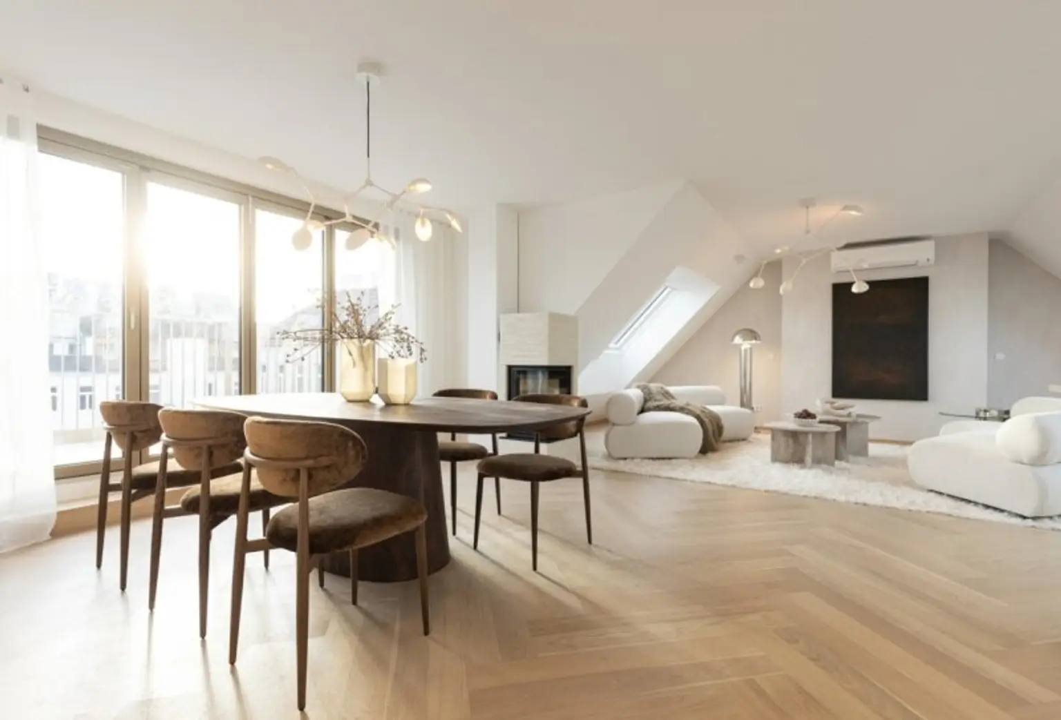 Ein besonderes Ambiente bietet der großzügig gestaltete Wohnbereich, der durch seinen integrierten Kamin, die formschöne Falttür zur Terrasse sowie die integrierte Küche, welche sich stilsicher gestalten lässt und ebenfalls über zahlreiche Fensterflächen verfügt. Sowohl Morgens als auch Abends taucht das Sonnenlicht diesen Raum in magisches Licht und lässt das anspruchsvolle Herz höher schlagen. Die vorgelagerte Terrasse führt natürlich ebenfalls direkt auf die Dachterrasse ohne direktem Gegenüber.