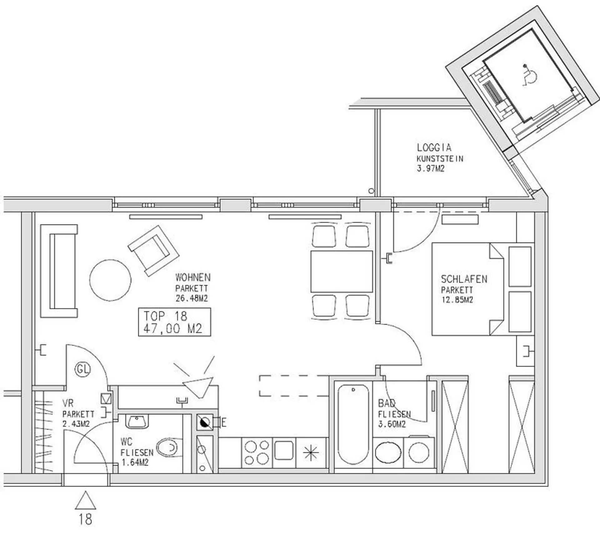 Vorraum, Wohnküche, Schlafzimmer, Bad, separates WC, Loggia