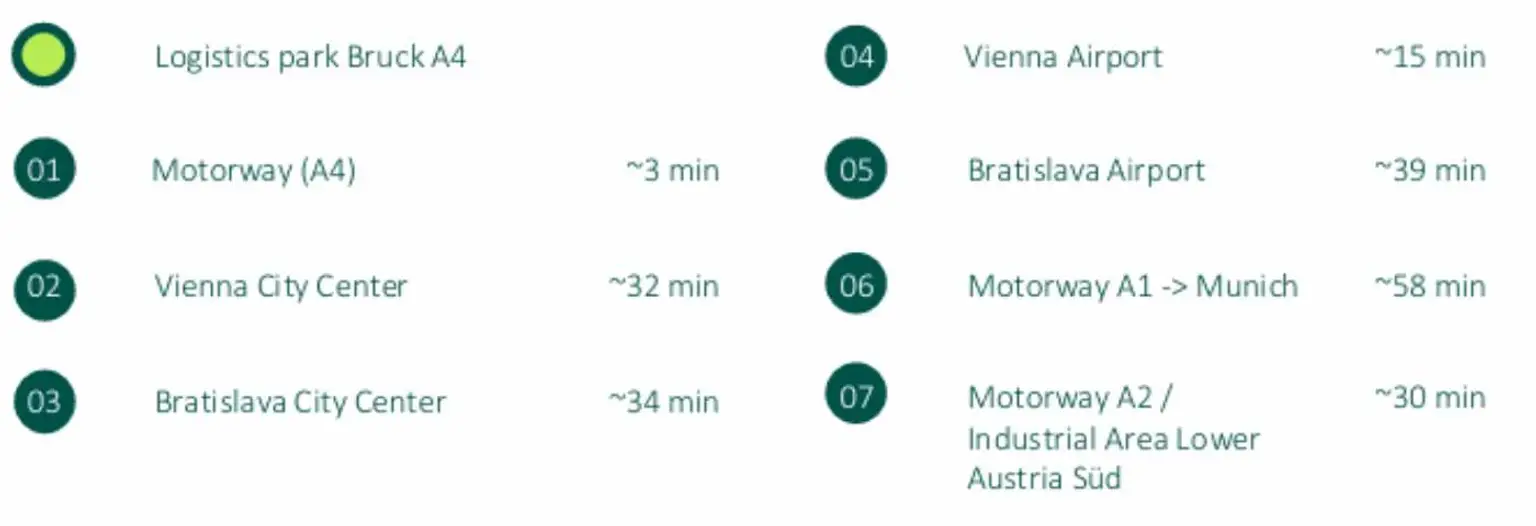 Zentren: Die Wiener Innenstadt ist in ca. 32 Minuten erreichbar, Bratislava in ca. 34 Minuten.