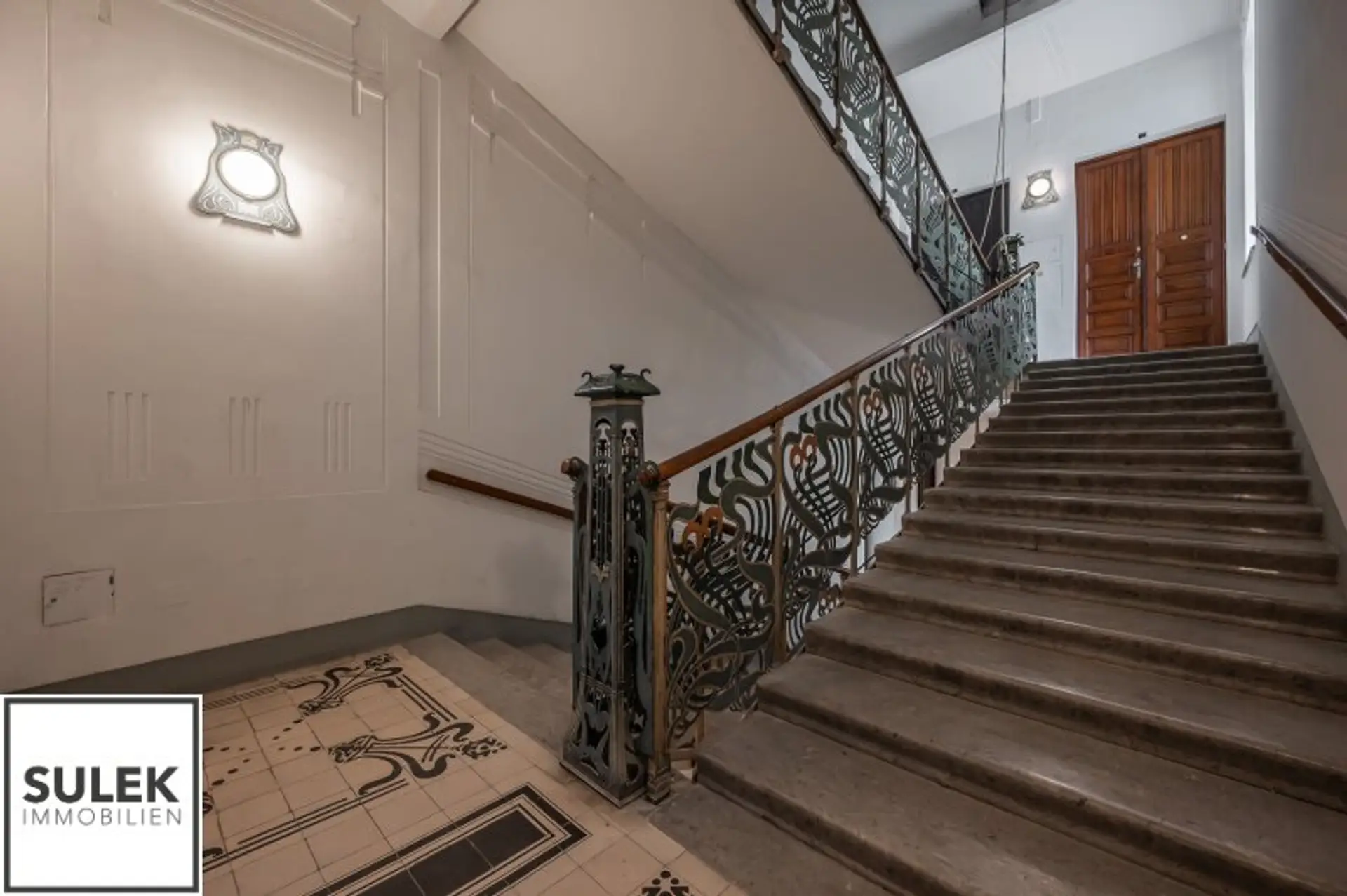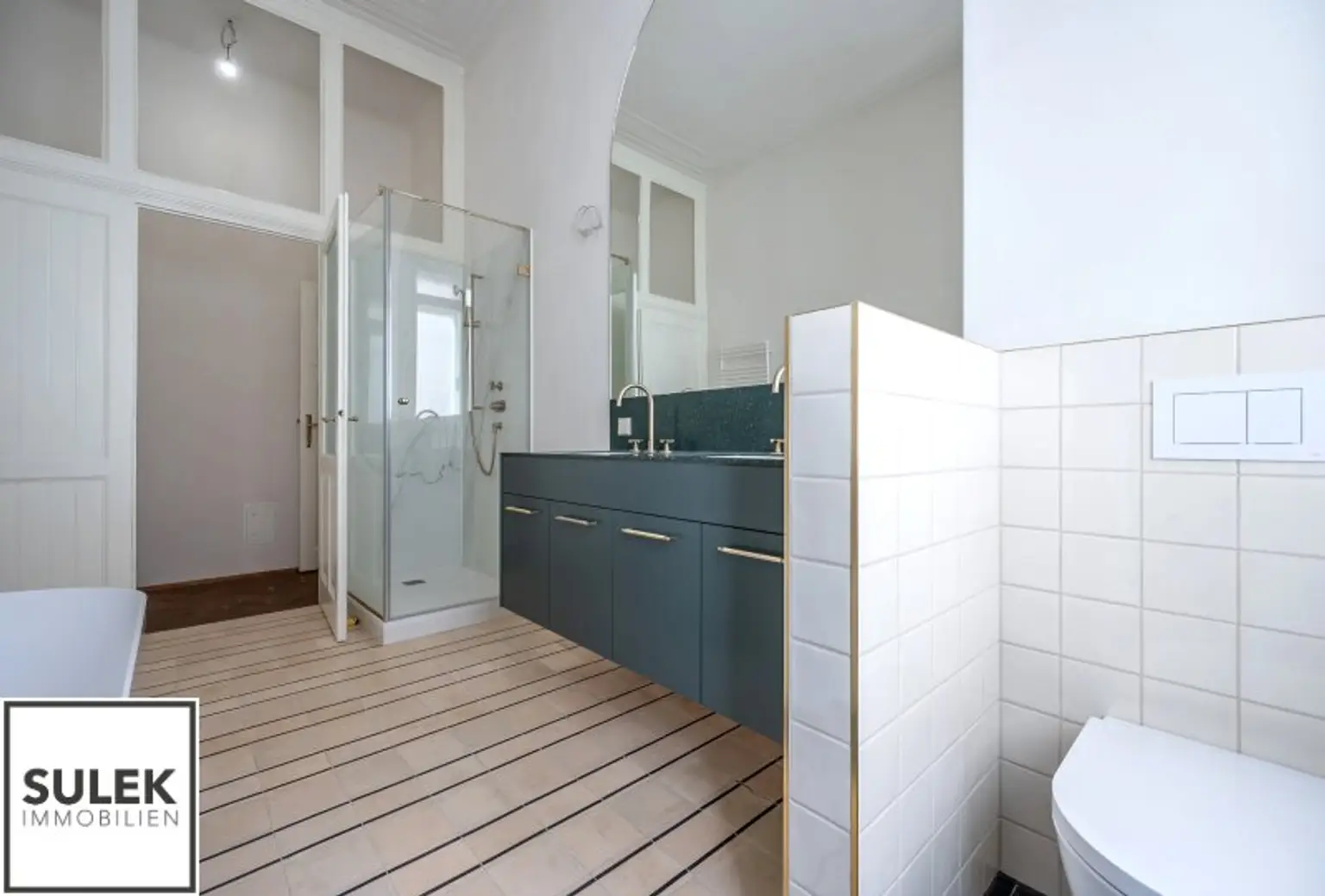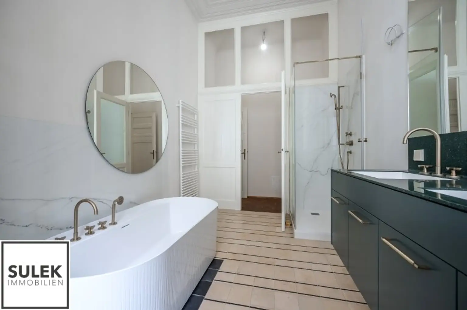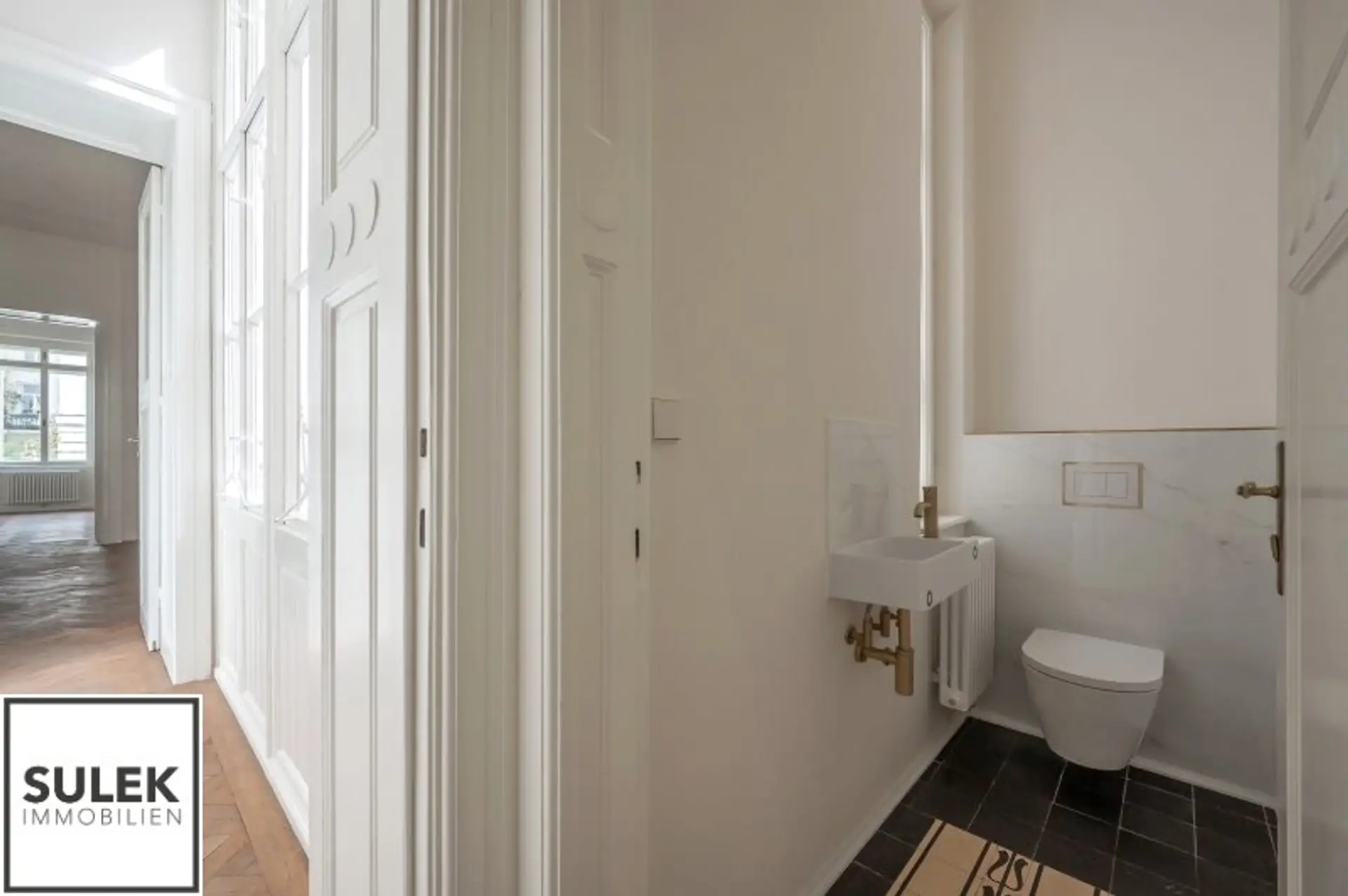 * Hohe helle Räume, Stuck verzierte Decken und Doppelflügeltüren, Natursteinplatten, goldfarbene Armaturen, originale Jugendstil Fliesen u.v.m.