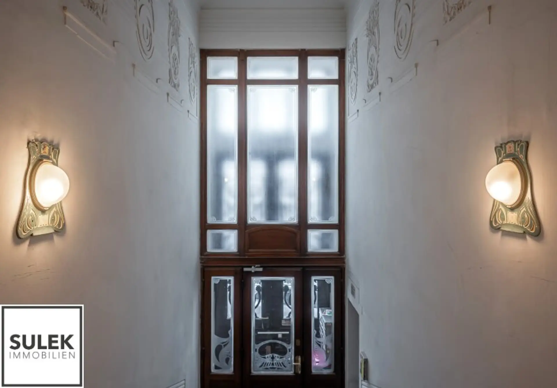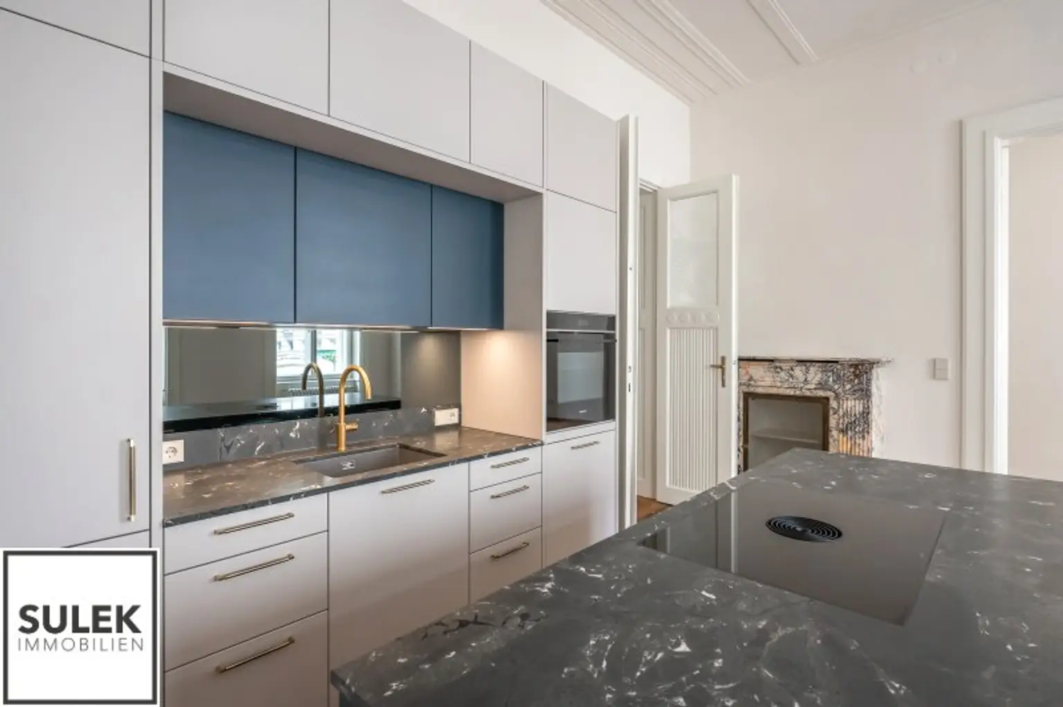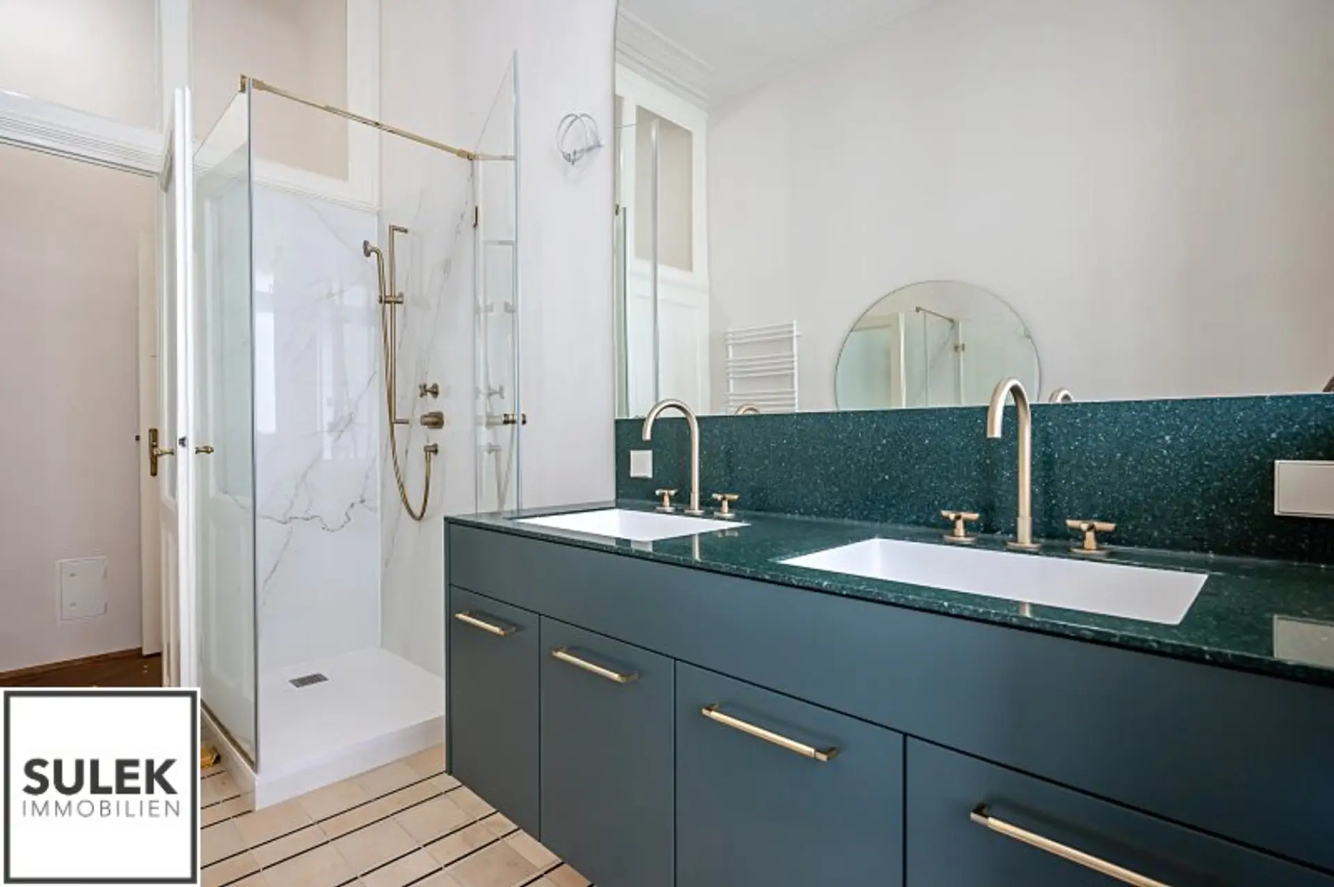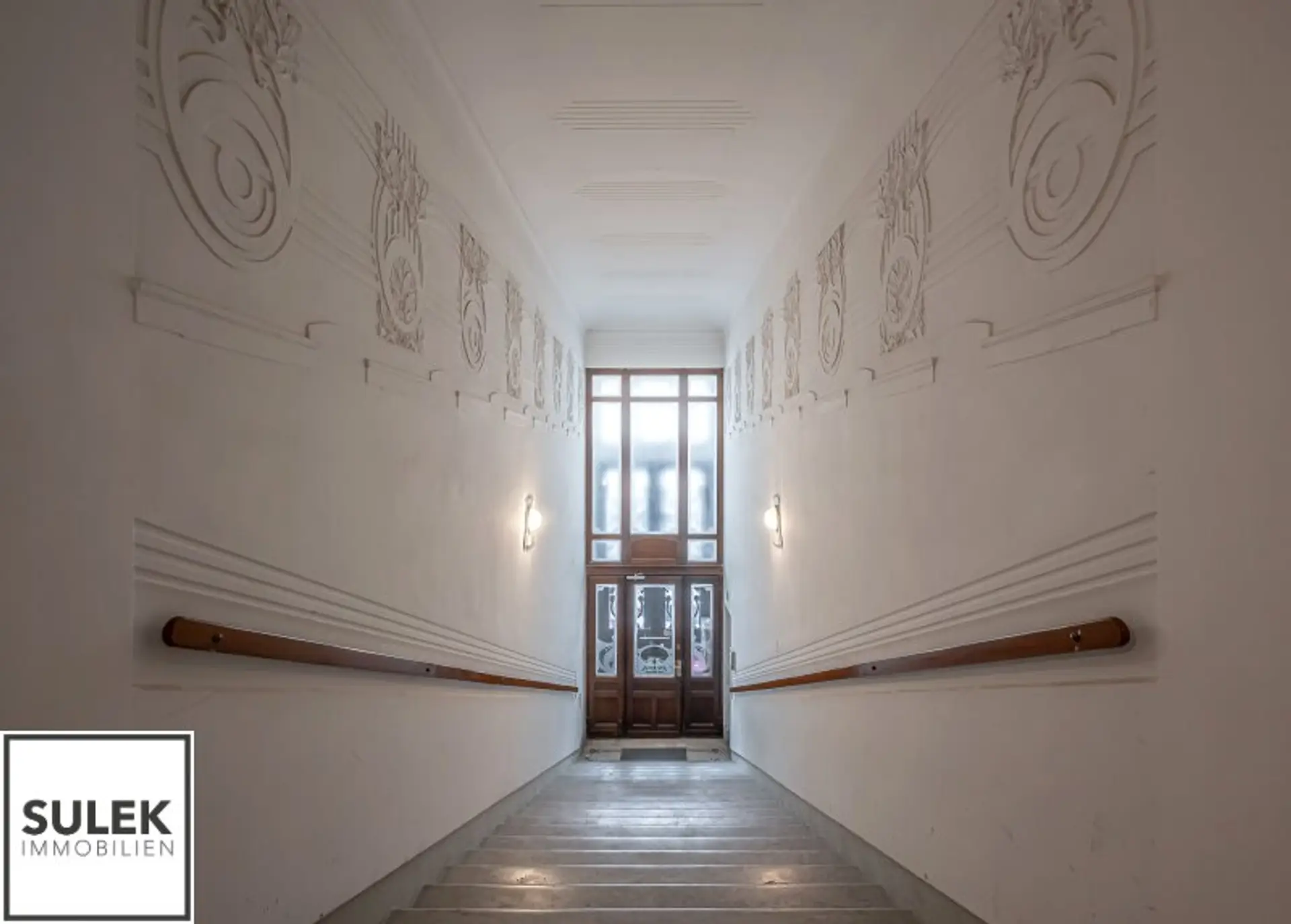 * Hohe helle Räume, Stuck verzierte Decken und Doppelflügeltüren, Natursteinplatten, goldfarbene Armaturen, originale Jugendstil Fliesen u.v.m.