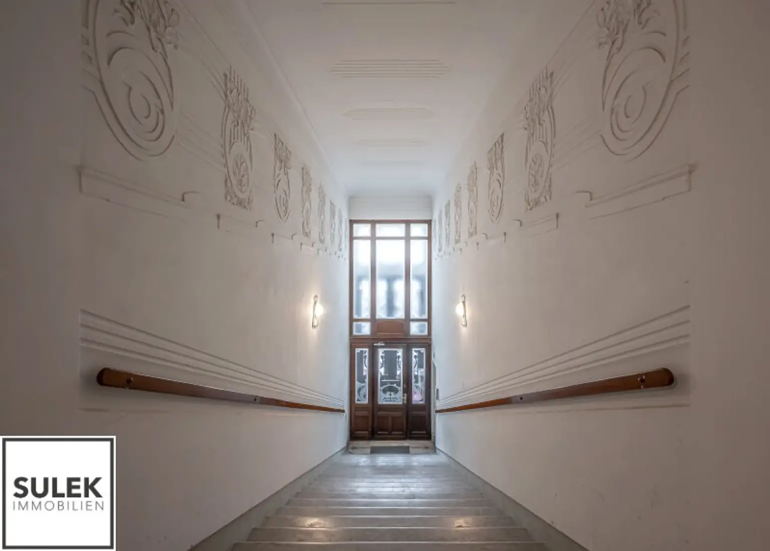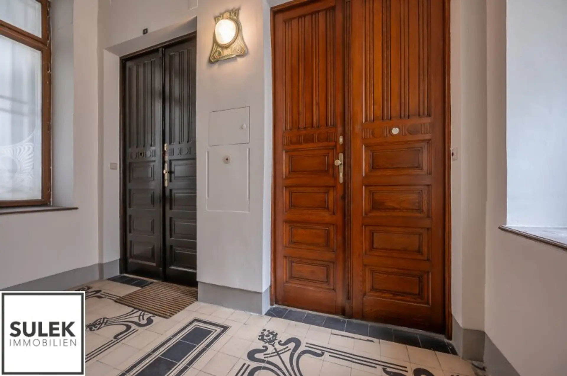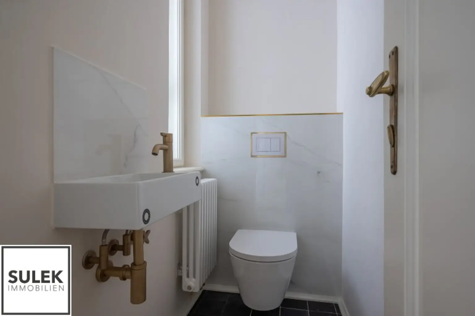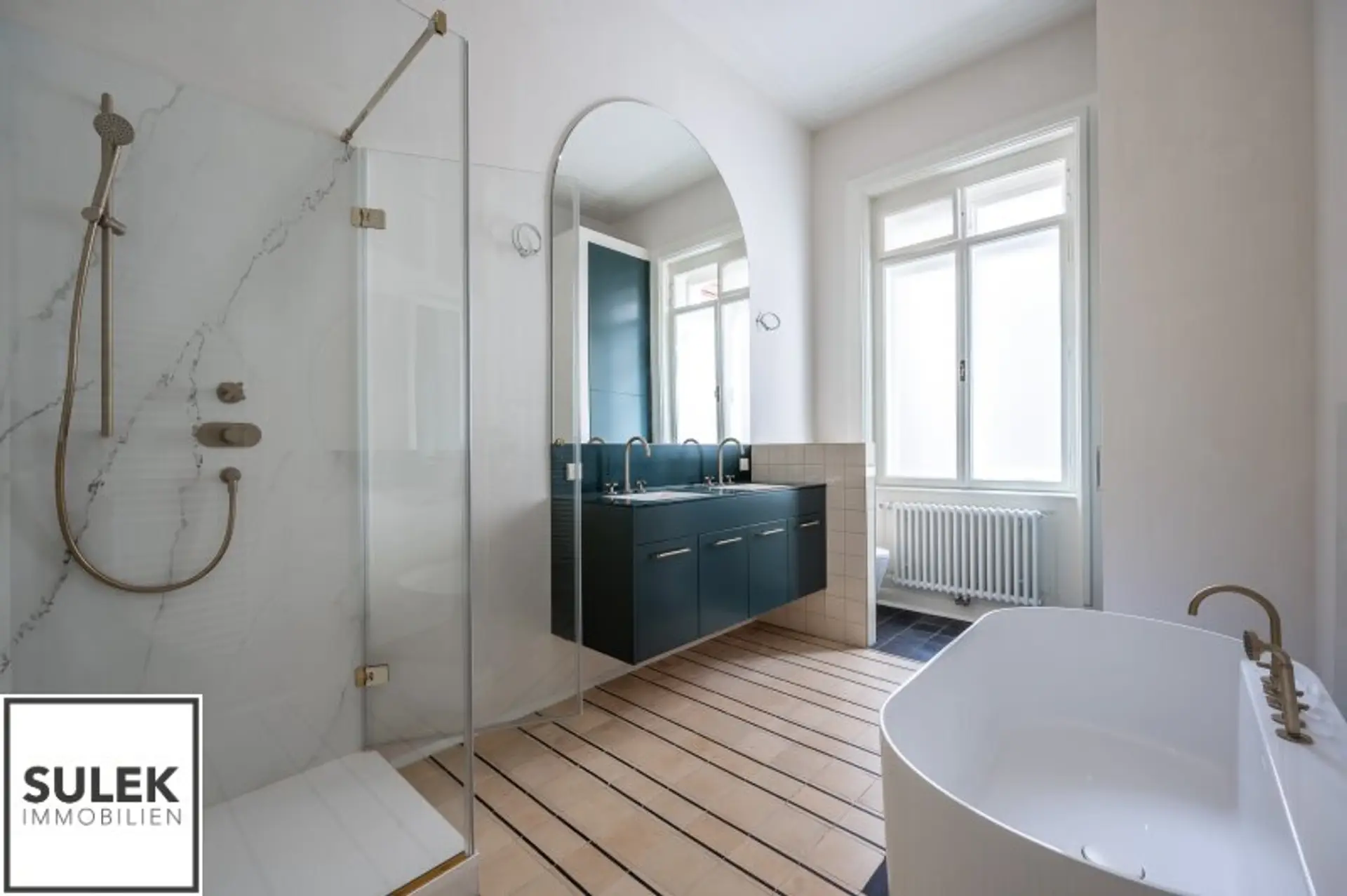 * Hohe helle Räume, Stuck verzierte Decken und Doppelflügeltüren, Natursteinplatten, goldfarbene Armaturen, originale Jugendstil Fliesen u.v.m.