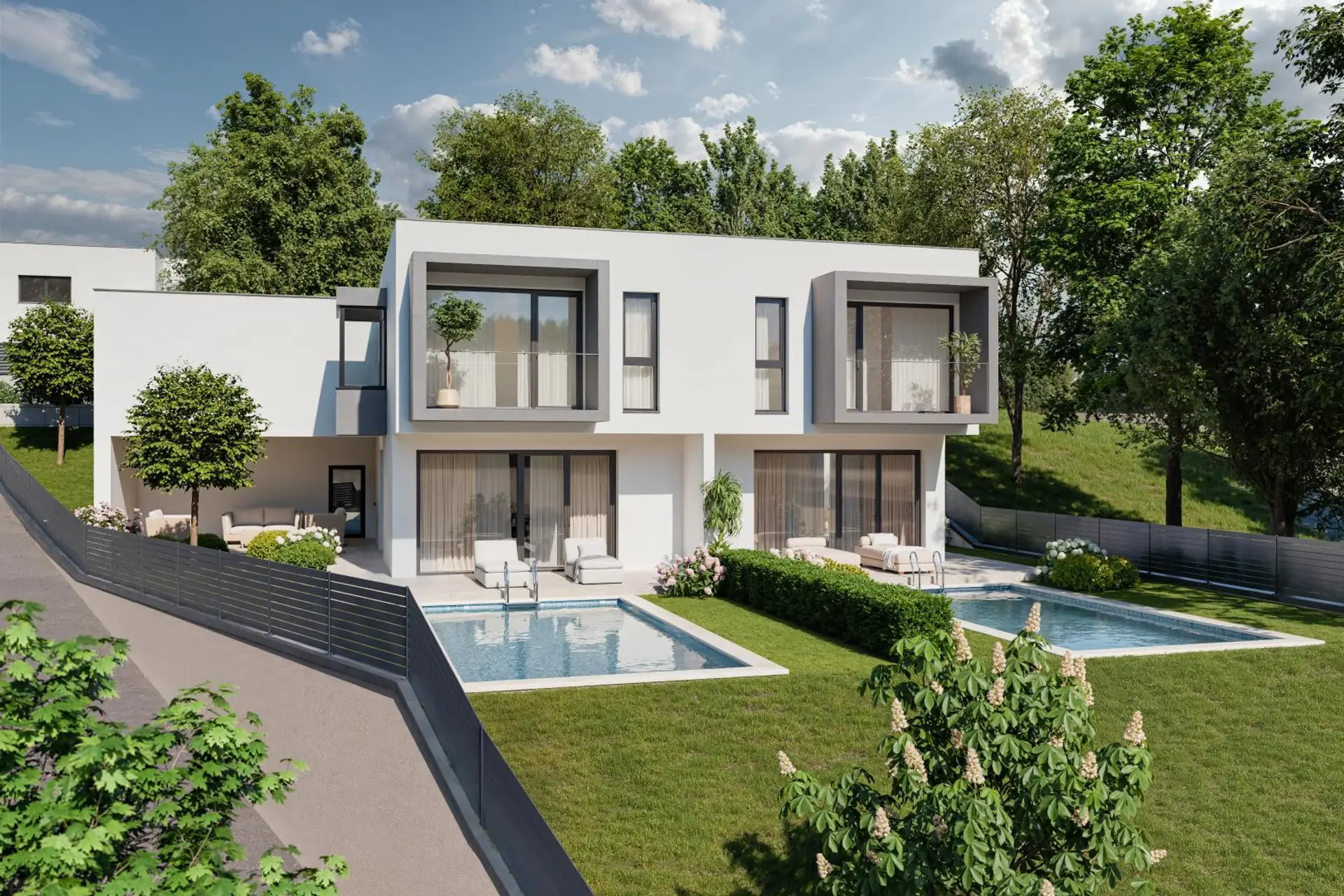 In spektakulärer Hanglage von Altenberg entstehen zwei exklusive Doppelhaushälften, die ab Mai 2026 bezugsfertig sind. Jede Einheit bietet ca. 130 m² Wohnfläche, großzügige Glasfronten, hochwertige Ausstattung und einen privaten Außenbereich mit Pool und Terrasse – mit unverbaubarem Weitblick über ganz Linz.
