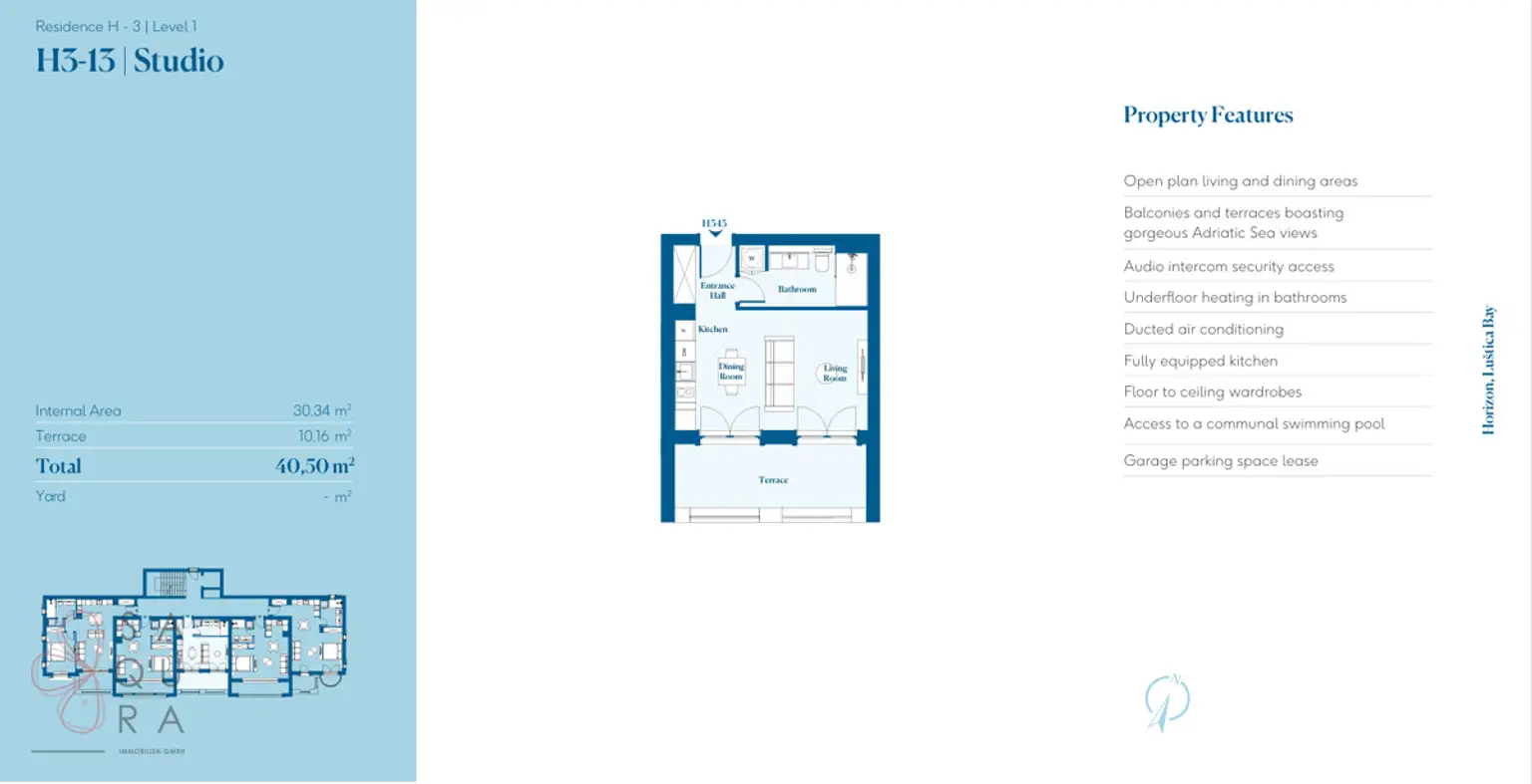 Horizon bietet eine Vielzahl von Immobilientypen, von Studios bis hin zu Drei-Zimmer-Wohnungen, die unterschiedlichen Lebensstilen gerecht werden. Die offenen Wohnbereiche, bodentiefe Fenster und hochwertige Ausstattungen sorgen für ein elegantes und einladendes Ambiente. Die Bewohner profitieren zudem von exklusiven Annehmlichkeiten wie privaten Stränden, einem 5-Sterne-Hotel und einem praktischen Shuttle-Service, der sie mit der lebendigen Gemeinschaft von Luštica Bay verbindet.