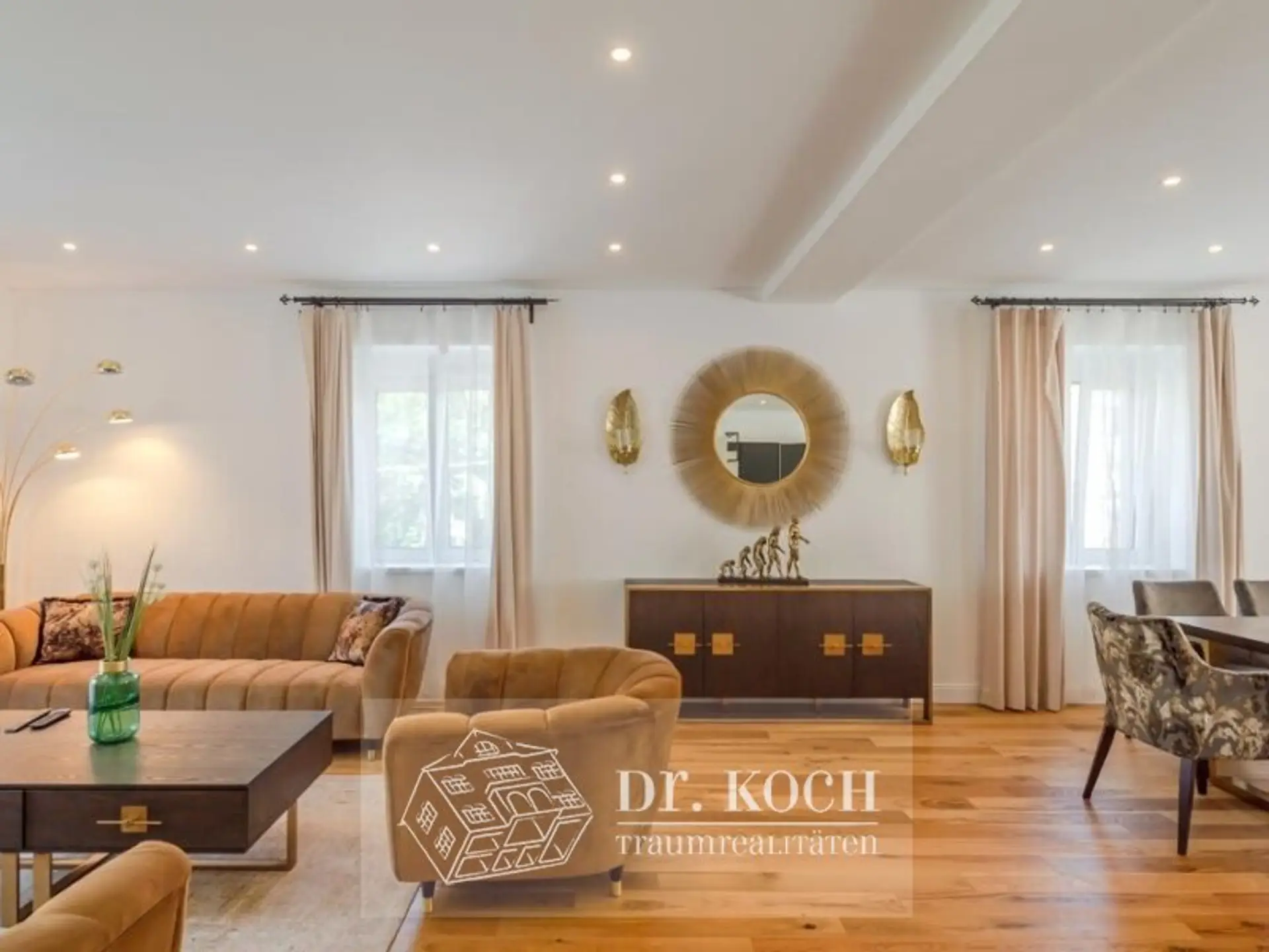 The spacious living-dining area with an open design kitchen impresses with stylish furnishings and first-class equipment. Large windows flood the rooms with light, creating a cozy atmosphere.