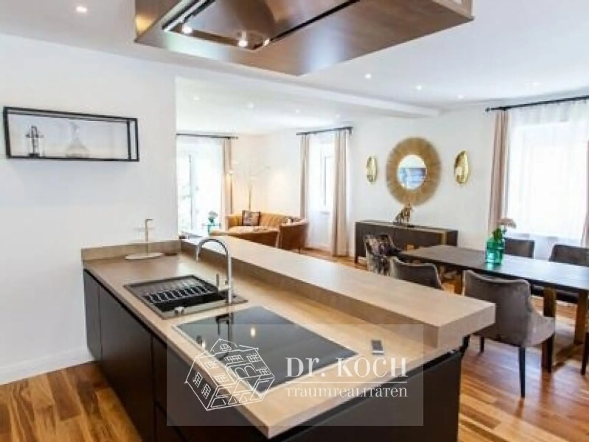 Der weitläufige Wohn-Essbereich mit offener Designküche beeindruckt mit stilvoller Möblierung und erstklassiger Ausstattung. Großflächige Fenster durchfluten die Räume mit Licht und schaffen ein behagliches Ambiente.
