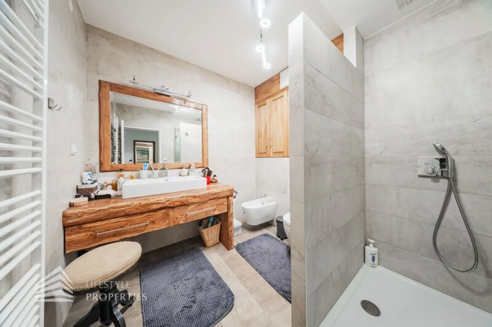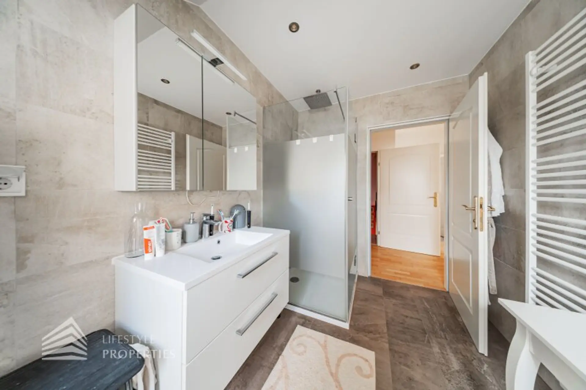 Im Untergeschoss befinden sich eine Garage mit elektrischem Tor und direktem Zugang ins Haus, ein großzügiger Partyraum, ein teilweise abgetrennter Fitnessbereich sowie ein behaglicher Raum mit stilvollem Ambiente – ideal zum Entspannen, für private Momente oder auch als Cigar-Lounge nutzbar. Zusätzlich ist ein vorbereiteter Raum für eine Sauna mit vorhandenem Abgasanschluss vorhanden, ergänzt durch ein Duschbad und ein separates WC. Drei Abstellräume sowie ein Heiz- und Technikraum mit integriertem Waschbereich runden diese Ebene ab. Über eine Sicherheitstür führt der Ausgang direkt auf Straßenniveau in den Eingangsbereich des Grundstücks.