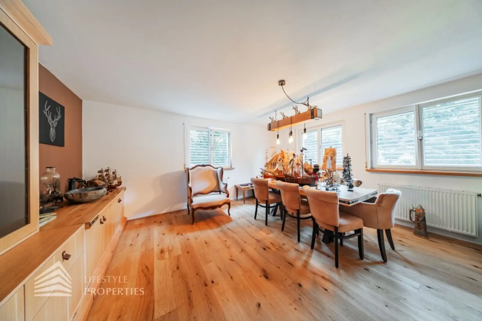 Beim Betreten des Erdgeschosses empfängt Sie ein helles Entrée mit Garderobenbereich, von dem Sie in den großzügigen Wohnsalon gelangen. Große Fensterflächen sorgen für lichtdurchflutete Räume und verbinden das Interieur mit der umliegenden Natur. Angrenzend befindet sich der elegante Essbereich, von dem aus Sie direkt auf die Terrasse treten können, ideal für Frühstück oder entspannte Stunden im Grünen. Eine separate, vollständig ausgestattete Küche, ein flexibel nutzbares zusätzliches Zimmer (derzeit als Garderobe und Waschküche verwendet), ein Badezimmer mit WC sowie ein weiteres separates Gäste-WC und ein praktischer Abstellraum runden das Erdgeschoss ab.