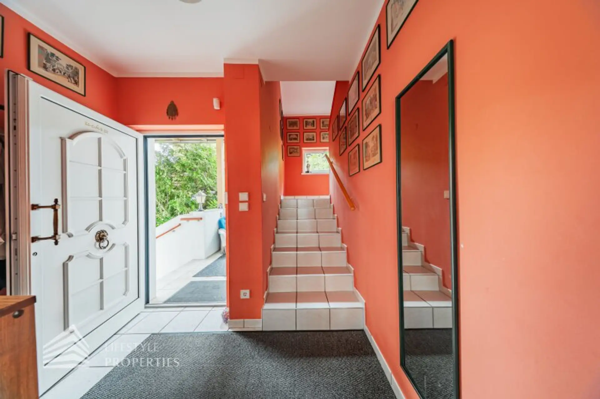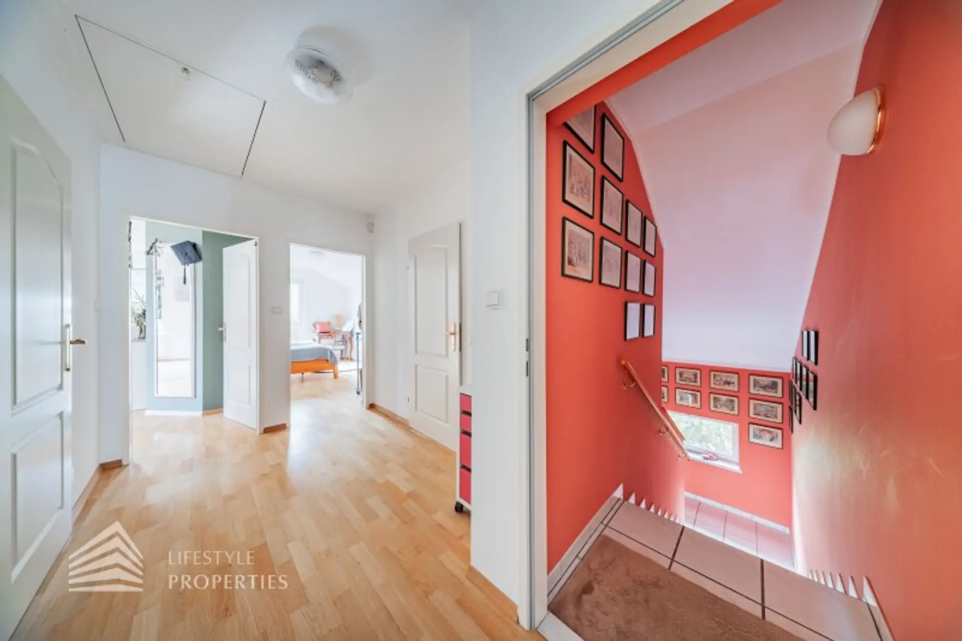 Im Obergeschoss befinden sich drei helle Schlafzimmer, zwei davon mit Zugang zu einer Terrasse, das dritte mit Zugang zum Balkon. Eine der Terrassen bietet einen traumhaften Blick auf den gepflegten Garten und den Waldrand. Ein großflächiges Wohnzimmer, ebenfalls mit Zugang zum Balkon, ist ebenso auf dem Geschoss zu finden. Ein zentrales Badezimmer, ein separates WC mit Fenster und mit Waschmaschinenanschluss, eine kleine Küche und eine Speisekammer bieten zusätzlichen Komfort für Familien oder Gäste.