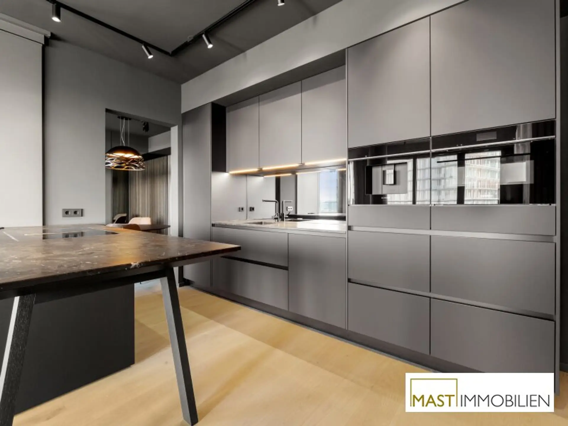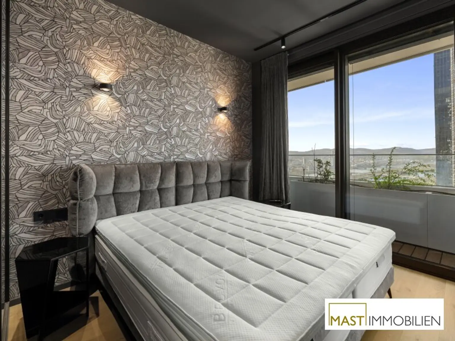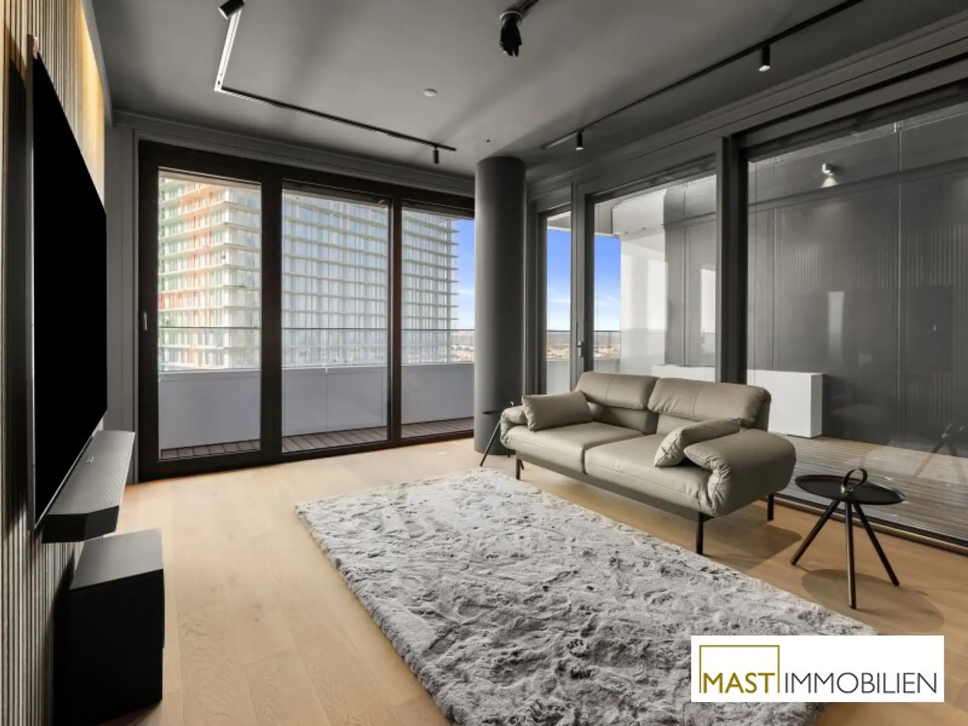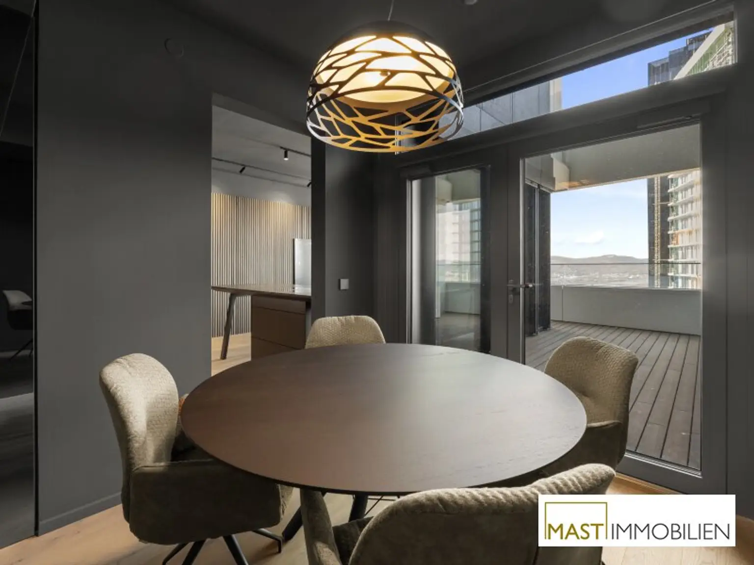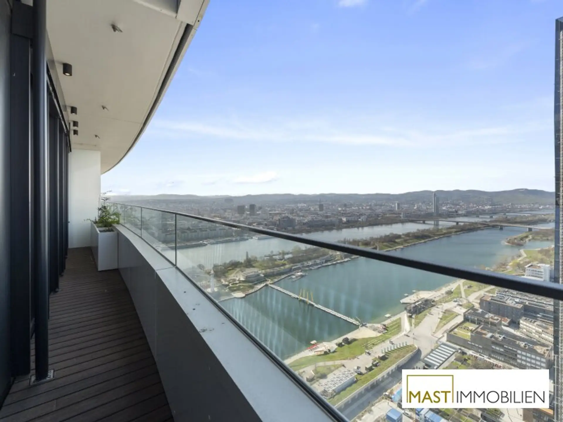 Diese außergewöhnliche, voll möblierte Wohnung im 40. Stock der DANUBEFLATS bietet ein Wohnerlebnis auf internationalem Niveau. Auf einer Wohnfläche von 66,95 m² mit einer 11,51 m² großen Loggia sowie einem 8,35 m² großen Balkon eröffnet sich ein spektakulärer Panoramablick auf die Donau und den Kahlenberg.