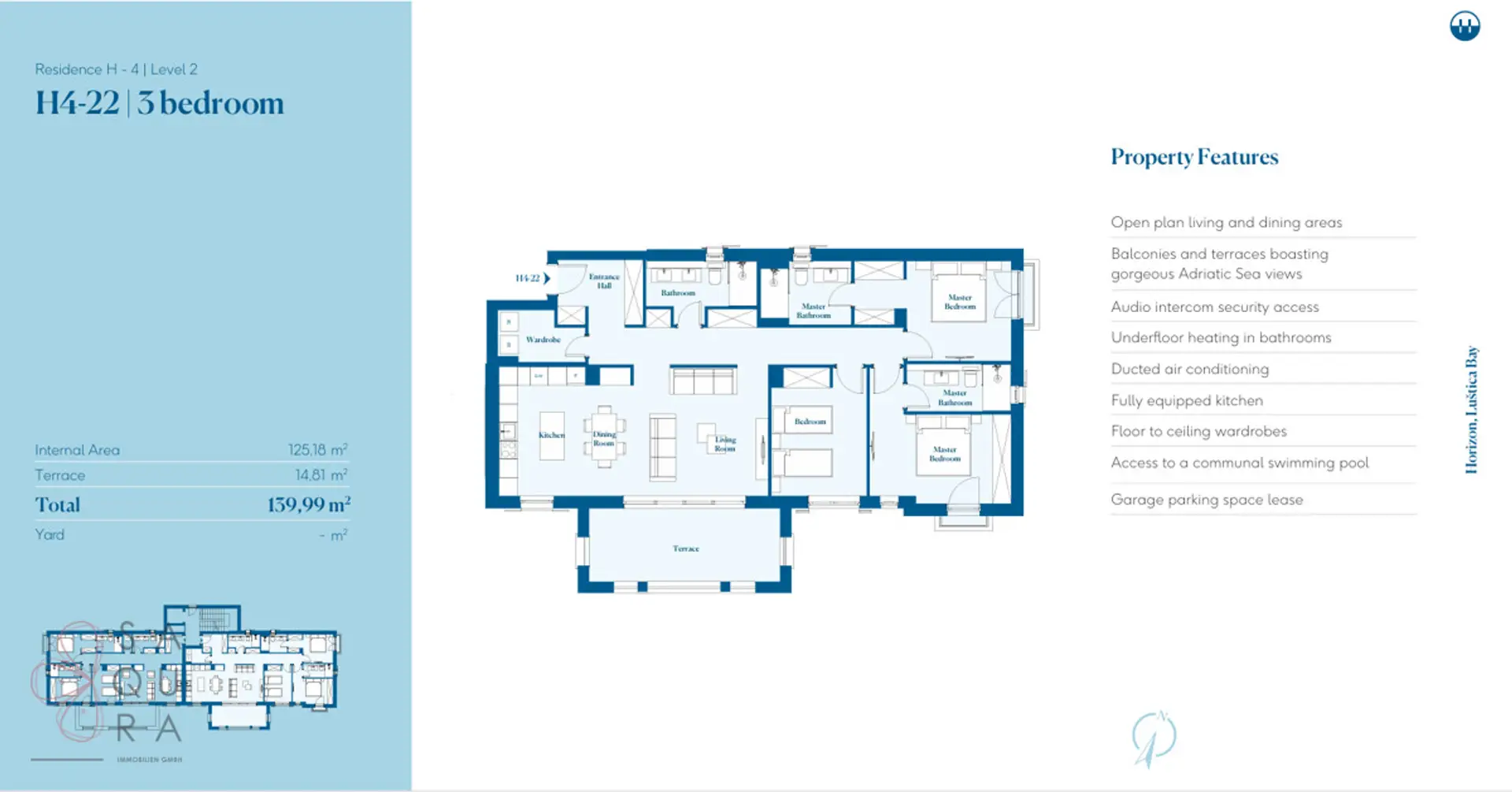 Horizon bietet eine Vielzahl von Immobilientypen, von Studios bis hin zu Drei-Zimmer-Wohnungen, die unterschiedlichen Lebensstilen gerecht werden. Die offenen Wohnbereiche, bodentiefe Fenster und hochwertige Ausstattungen sorgen für ein elegantes und einladendes Ambiente. Die Bewohner profitieren zudem von exklusiven Annehmlichkeiten wie privaten Stränden, einem 5-Sterne-Hotel und einem praktischen Shuttle-Service, der sie mit der lebendigen Gemeinschaft von Luštica Bay verbindet.