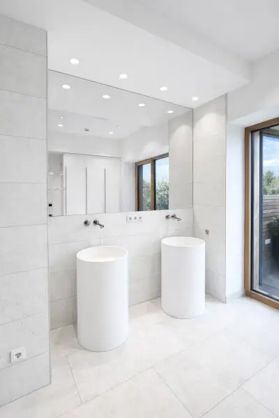 A mosaic rain shower with heated seating, steam bath preparation and an integrated Swiss stone pine sauna create a spa-quality environment within your own residence.