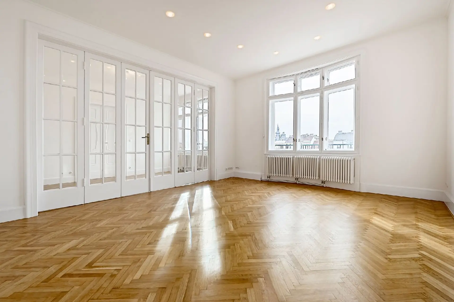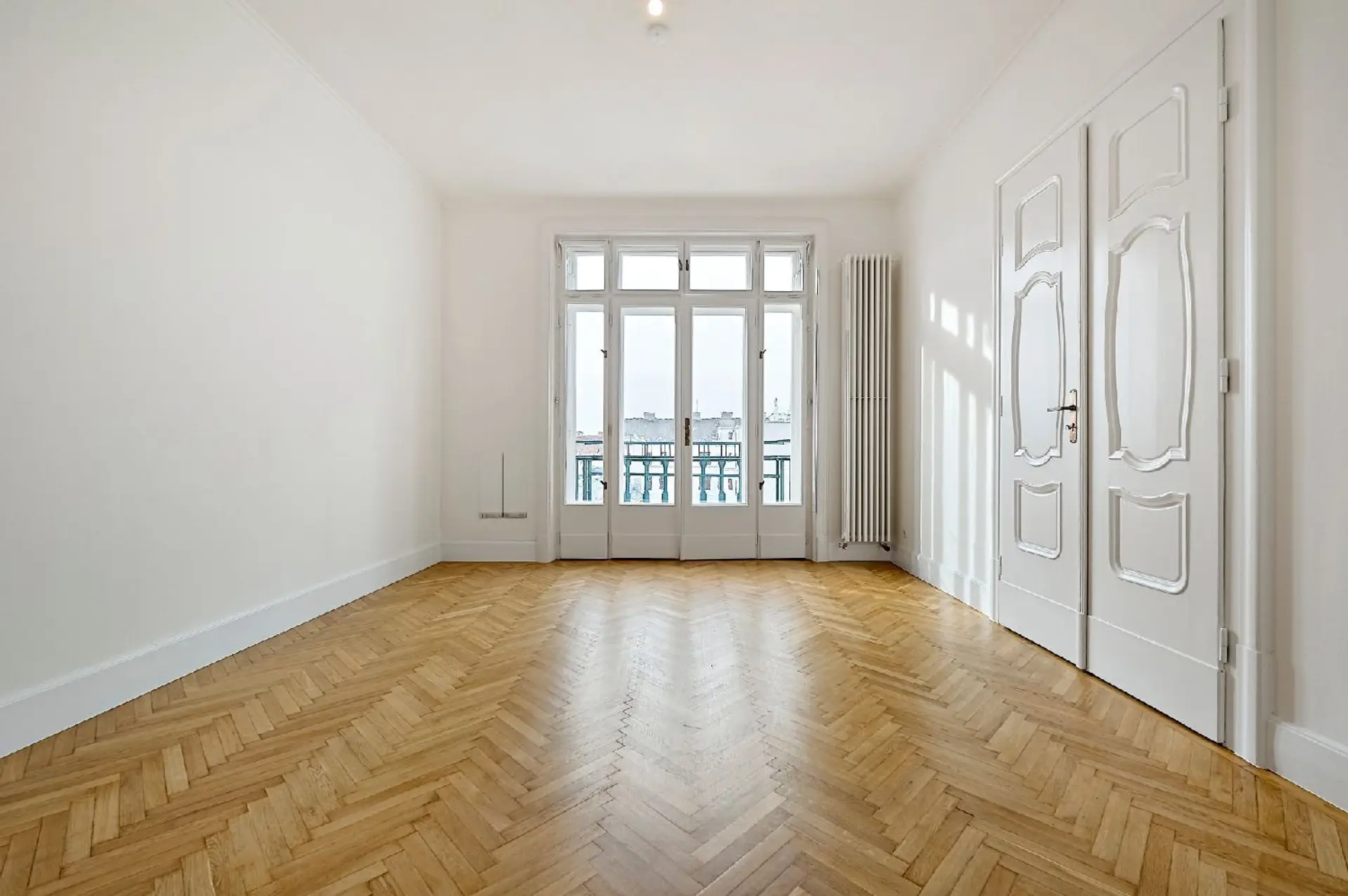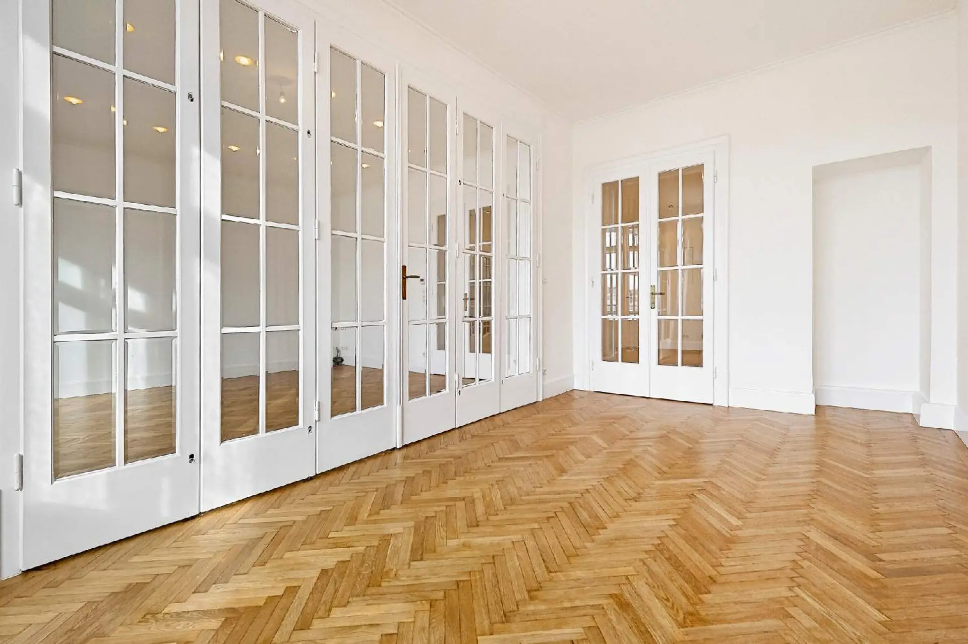 Edler Fischgrätparkett, einzigartige Türvertäfelungen, großflächige Glastüren mit Facettenschliff, sowie großzügige Fensterflächen und unverbauter Ausblick schaffen ein lichtdurchflutetes, stilvolles Ambiente und unterstreichen den unverwechselbaren Charakter dieser charmanten Altbauresidenz aus dem Fin de Siecle.