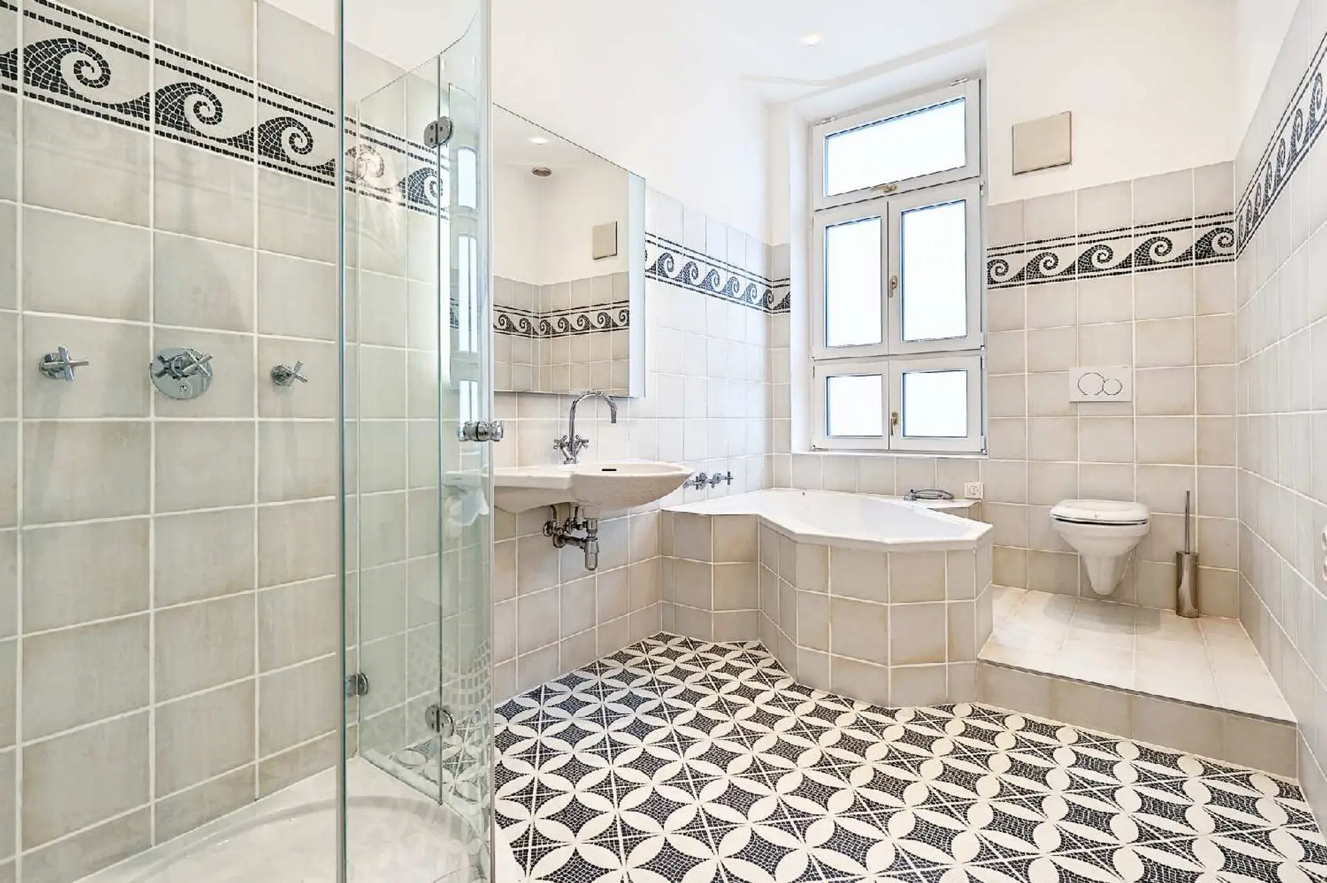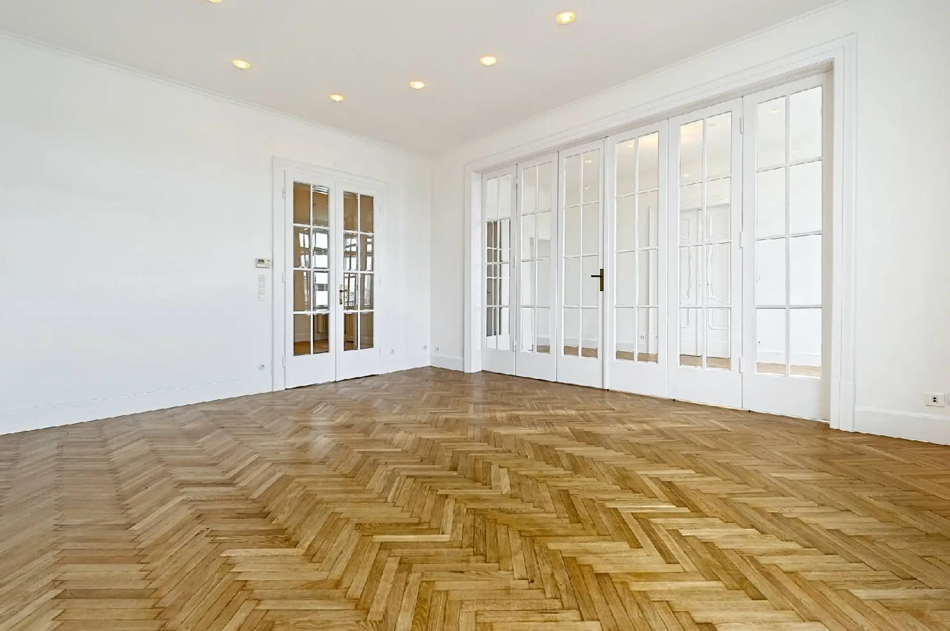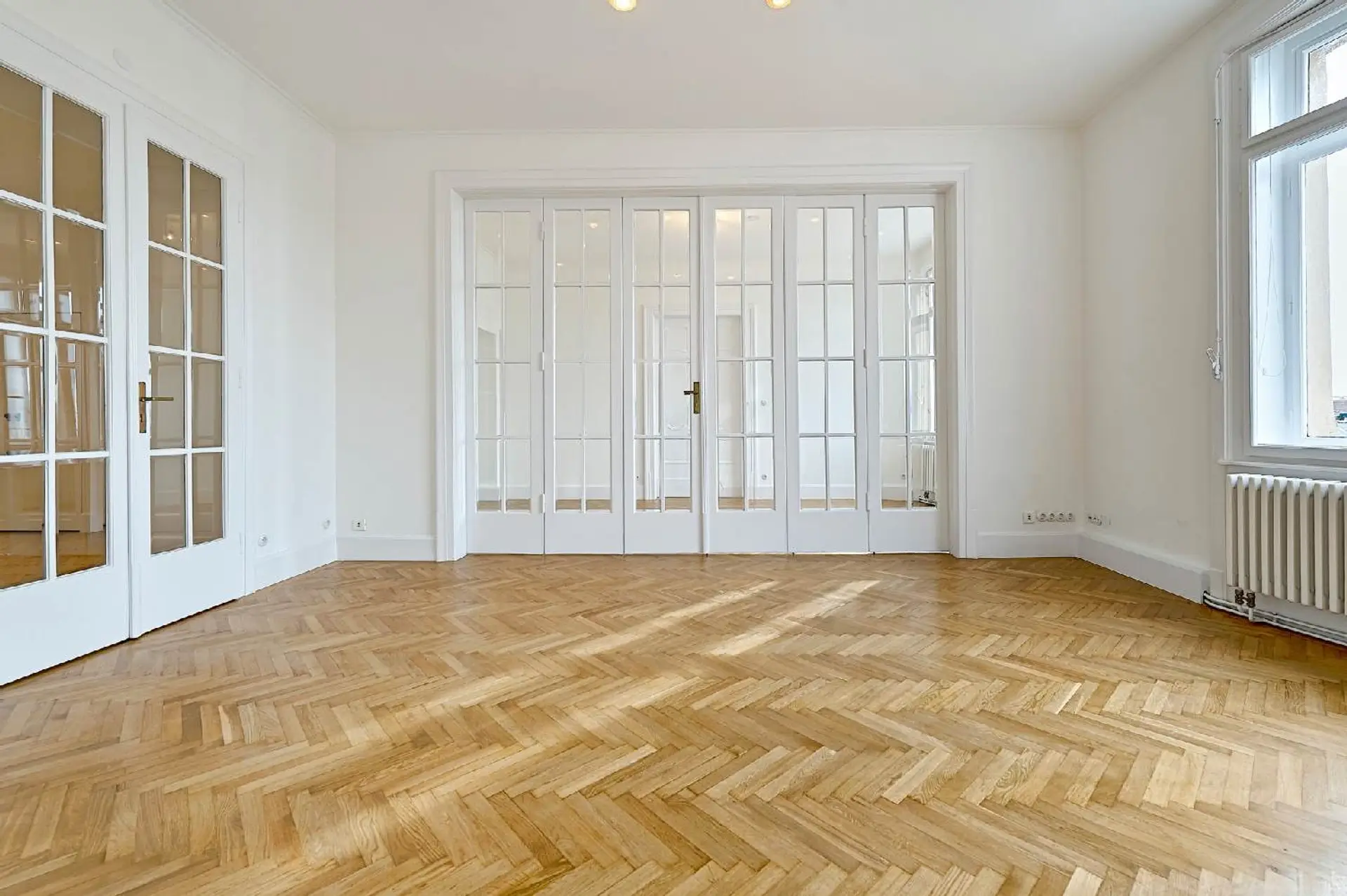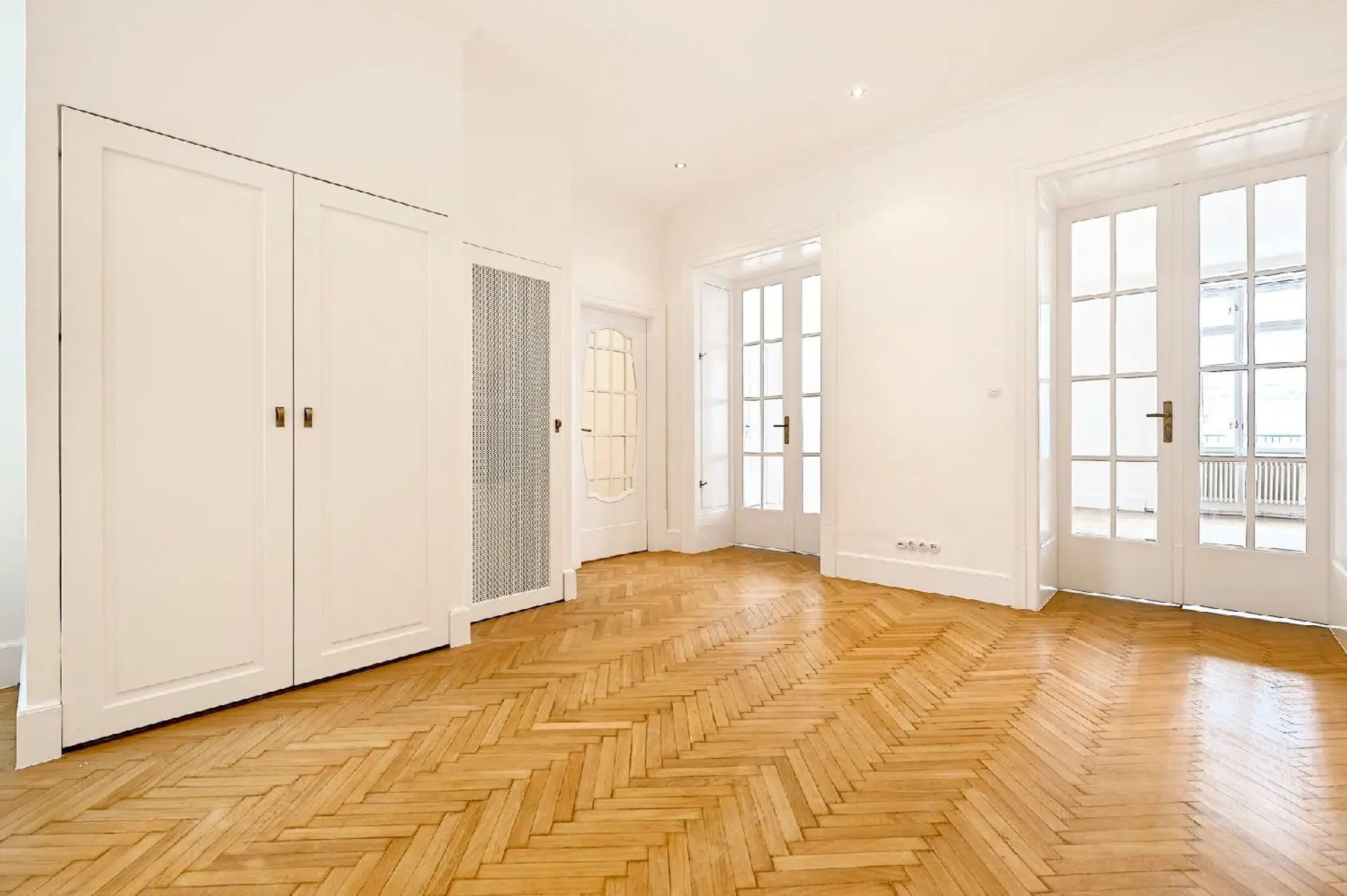 Edler Fischgrätparkett, einzigartige Türvertäfelungen, großflächige Glastüren mit Facettenschliff, sowie großzügige Fensterflächen und unverbauter Ausblick schaffen ein lichtdurchflutetes, stilvolles Ambiente und unterstreichen den unverwechselbaren Charakter dieser charmanten Altbauresidenz aus dem Fin de Siecle.