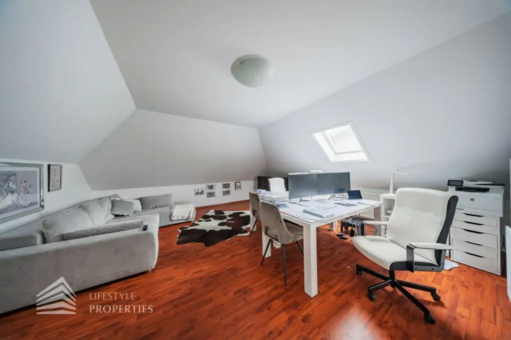 Die Villa erstreckt sich über drei Etagen. Im Kellergeschoss befinden sich ein stilvoll gestalteter Whiskey- und Zigarrenraum, ein Büro, ein Waschraum mit Dusche und WC, ein Abstellraum sowie eine kleine Werkstatt. Eine elegante Holztreppe führt in das Erdgeschoss, das zwei Schlafzimmer, eine moderne und im Kaufpreis inbegriffene Küche, ein separates Esszimmer sowie ein großzügiges Wohnzimmer mit rund 35 m² umfasst. Vom Wohnzimmer aus gelangt man direkt auf eine rund 23 m² große Terrasse, die zum Verweilen einlädt. Ein Windfang sowie eine praktische Speisekammer runden das Erdgeschoss ab. Im Obergeschoss befinden sich drei weitere Schlafzimmer, eine offene Galerie sowie ein helles Badezimmer mit WC.