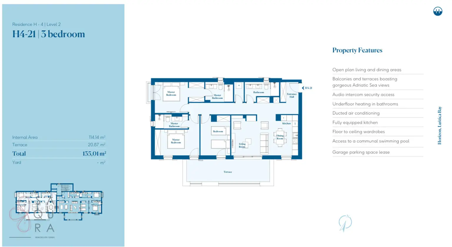 Horizon, najnovije naselje na brdu u Luštica Bay-u, nudi savršenu kombinaciju mira i sofisticiranog života. Smešten visoko na brdu s pogledom na blistavo Jadransko more, Horizon pruža stanovnicima prostrane terase, bujne vrtove i infinity bazene sa zadivljujućim pogledom. Svaka rezidencija ima arhitekturu inspirisanu Mediteranom, koja besprekorno kombinuje tradicionalni šarm sa modernim udobnostima.
