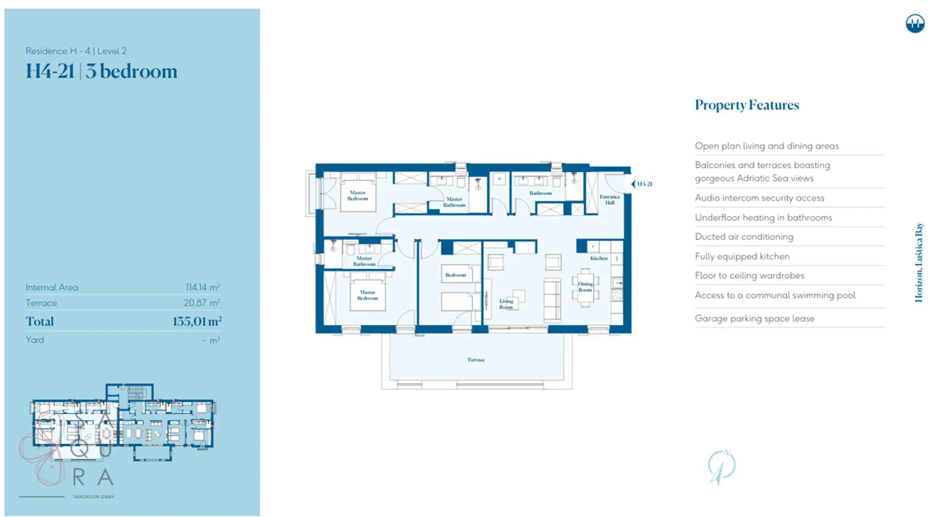 Horizon nudi različite tipove nekretnina, od studija do trosobnih apartmana, koji odgovaraju različitim stilovima života. Otvoreni prostori za život, prozori od poda do plafona i visokokvalitetni završni radovi osiguravaju elegantno i privlačno okruženje. Stanovnici takođe imaju koristi od ekskluzivnih pogodnosti, kao što su privatne plaže, hotel sa 5 zvezdica i praktičan shuttle servis koji ih povezuje sa živahnom zajednicom Luštica Bay-a.