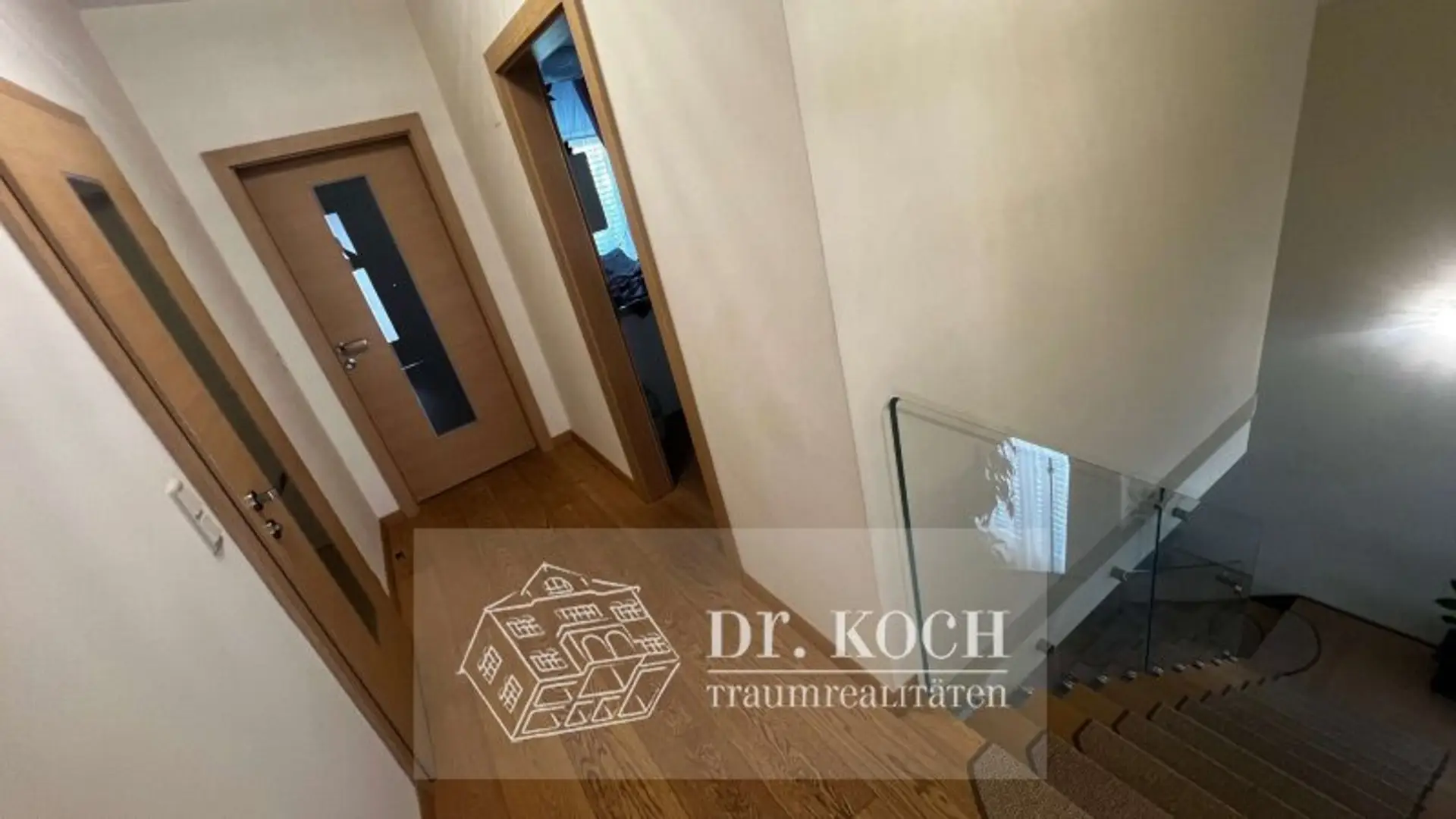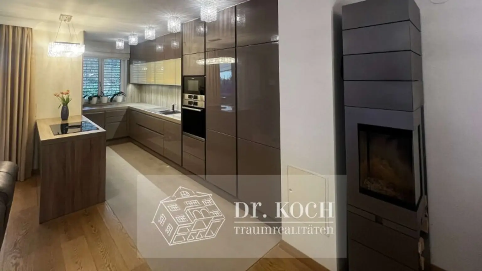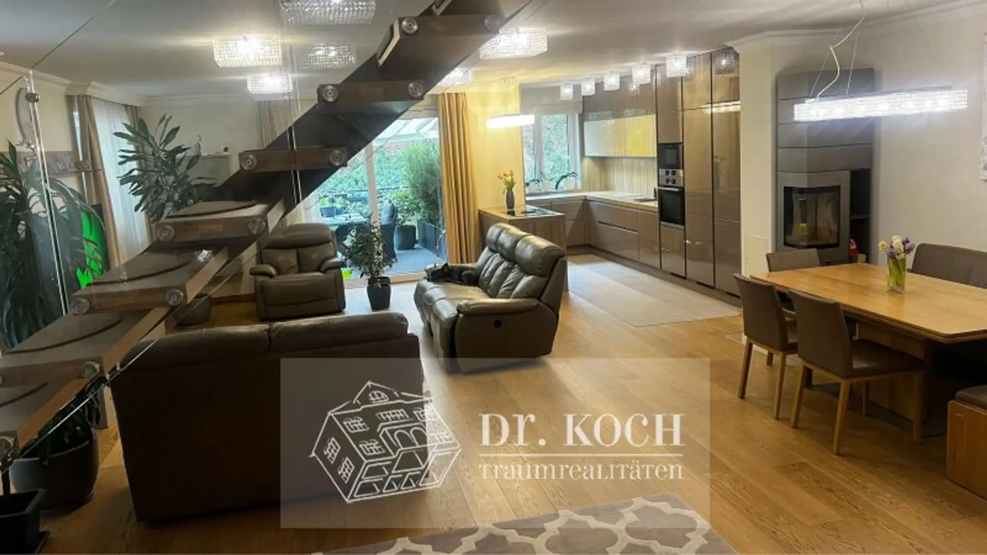 Fußbodenheizung, Massivparkett, Designer-Beleuchtung aus Italien, eine italienische Treppe sowie eine hochwertige Dan Küche mit Einbaugeräten von Bosch.
