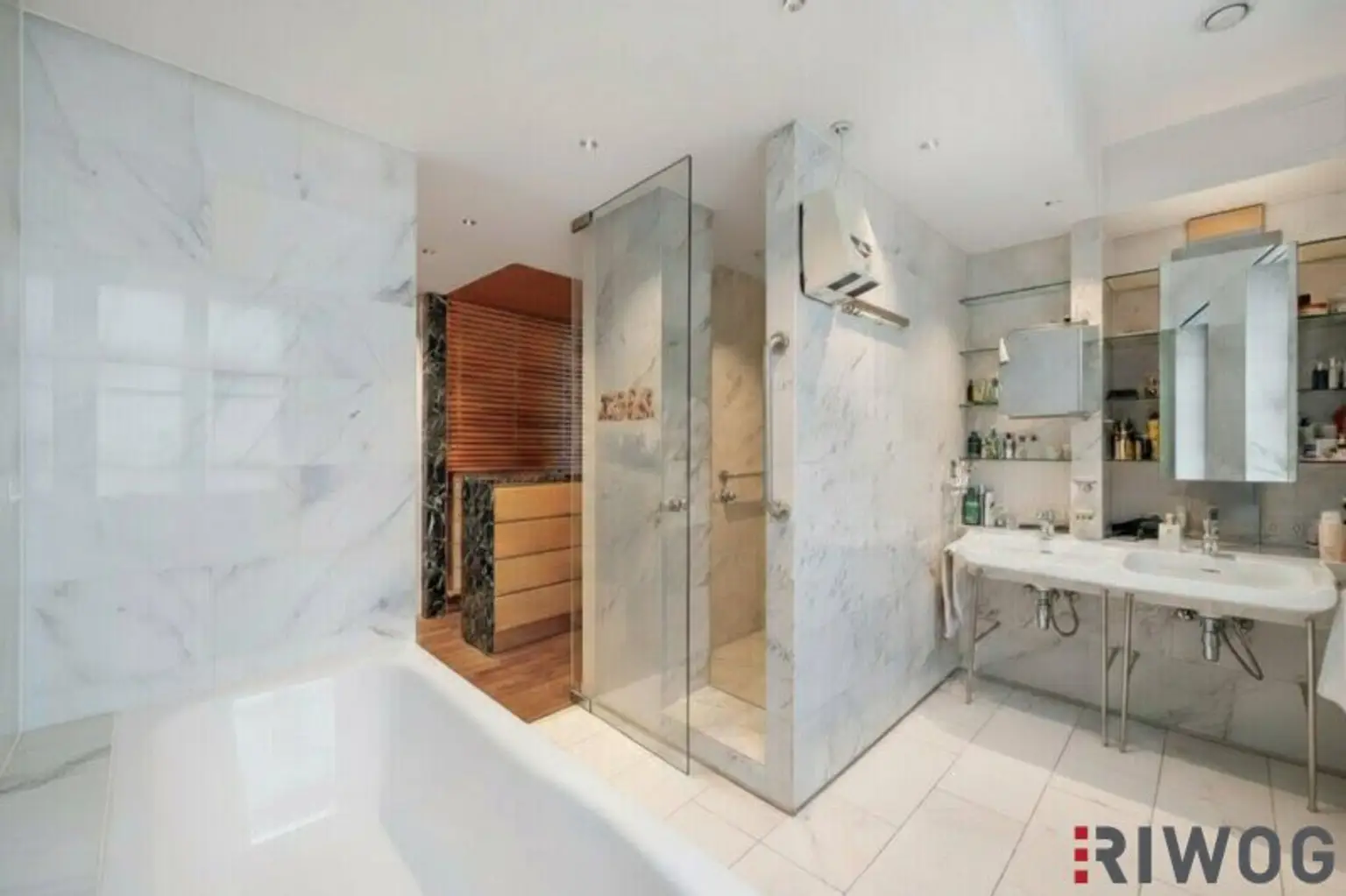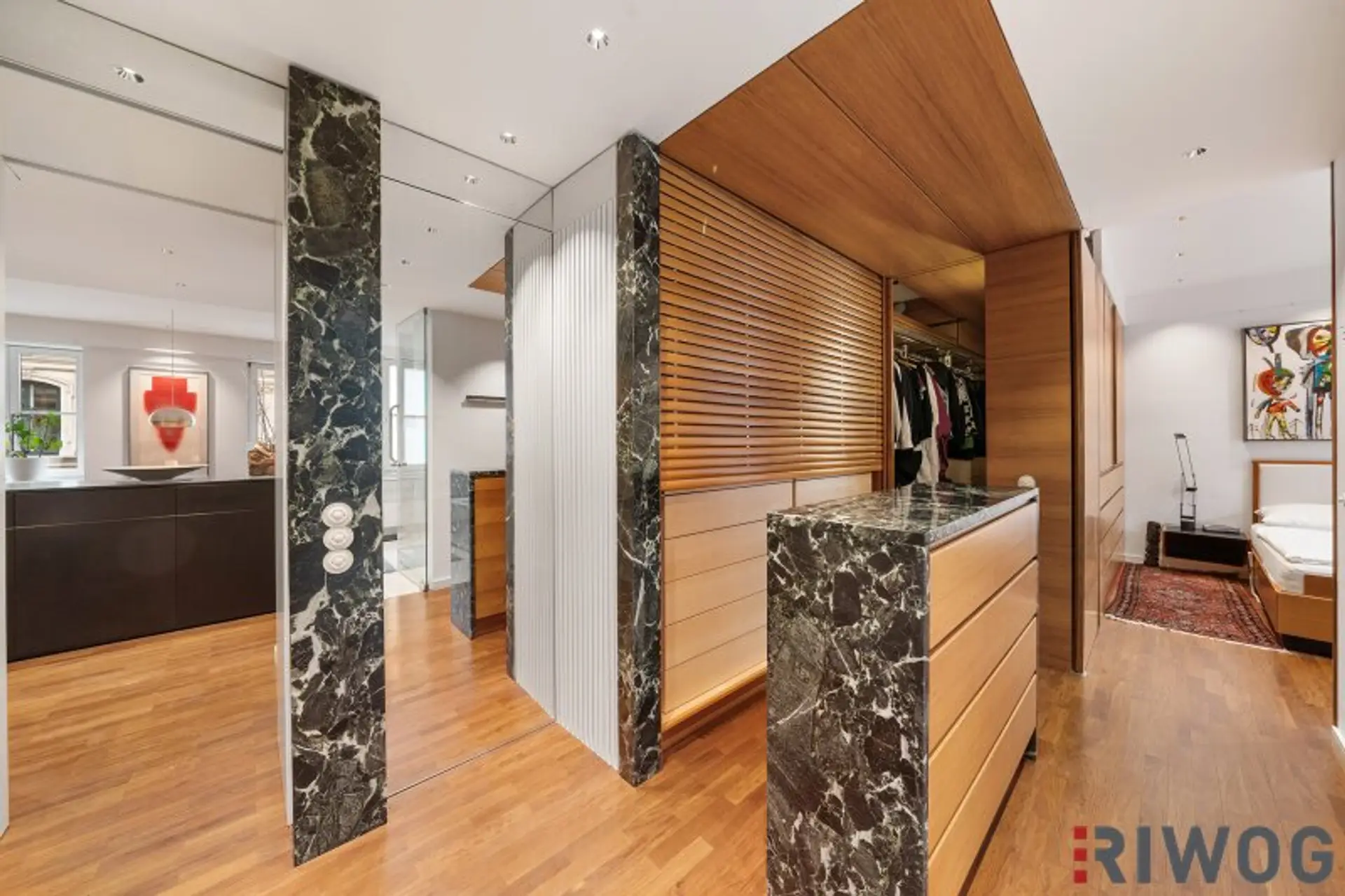Die Wohnung bietet 2 Schlafzimmer mit 2 Bädern und begehbaren Kleiderschank sowie Garderobe. Eine Küche mit Siemens und Gaggenau Geräten. Eine Waschküche. Eine Süd-Loggia mit ca. 5m² und einen Stephansdom Blick und einen Wohn- und Essbereich mit einem Kamin. Es wurde sehr viel Marmor und Edelhölzer verbaut und Technische Spielerreien wie elektrische Türen und Kommoden.