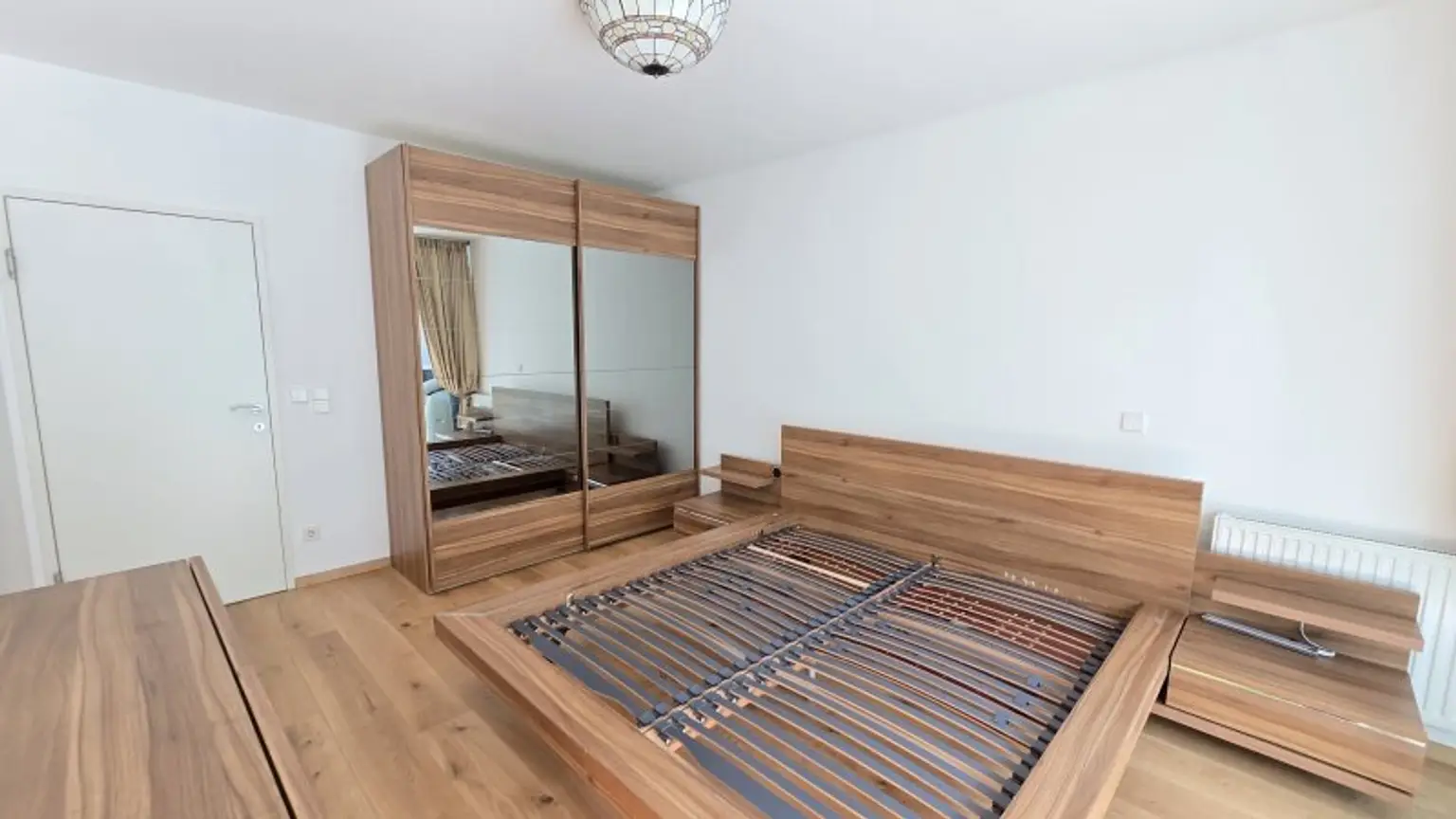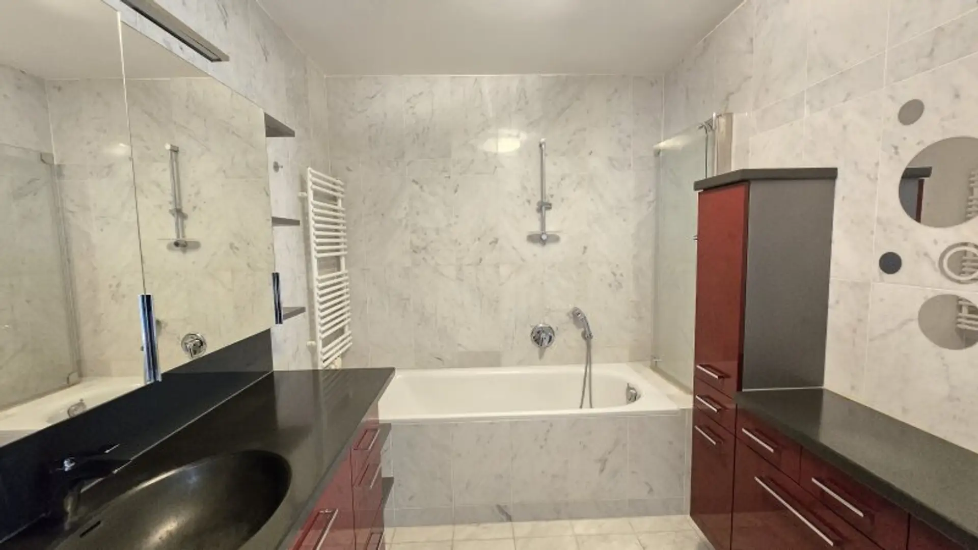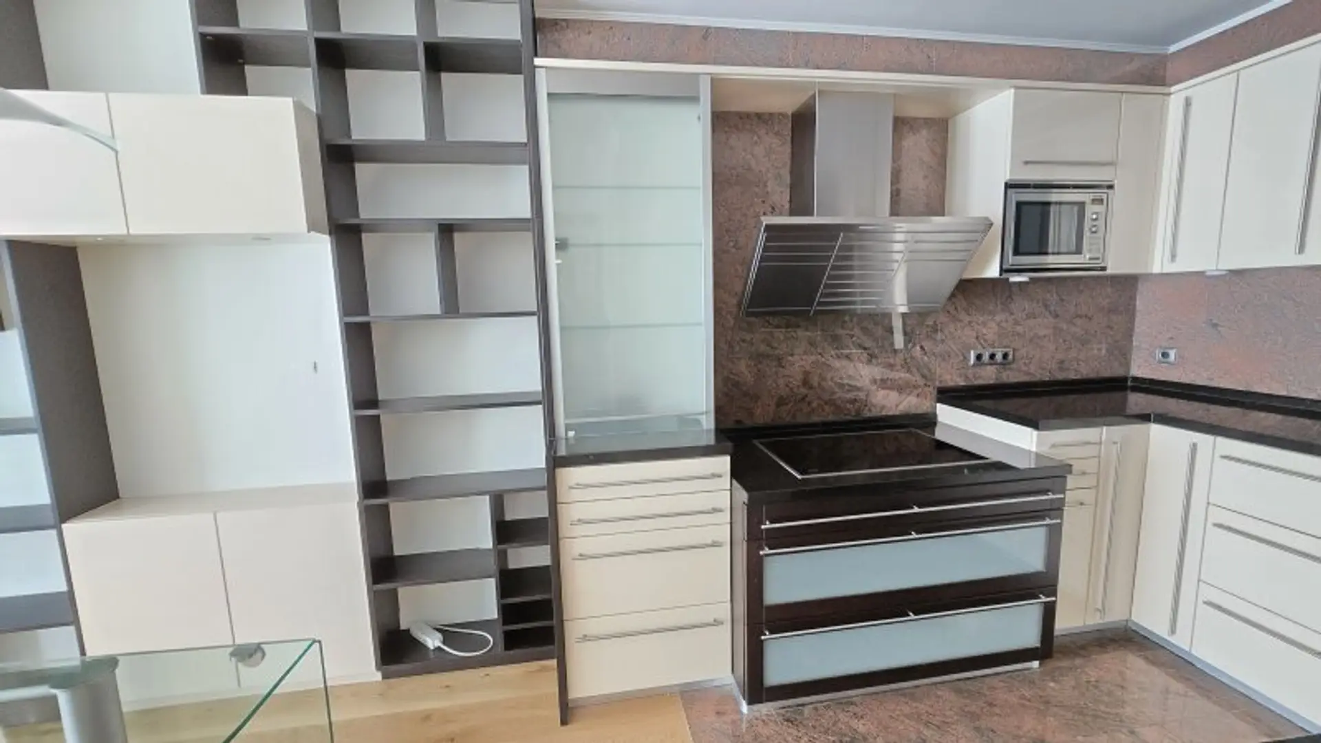 Die Wohnung ist mit Eiche Parkettböden, Fußbodenheizung, Mobile Klimaanlage mit Fernbedienung, Hauszentralheizung, 3-fach verglaste Frontglas Fenster, die Topmodernen und erlesenen Badezimmer mit Wanne, Spiegel, hochwertige Fliesen, Marken Sanitärausstattung, Waschmaschine, Handtuchtrockner,