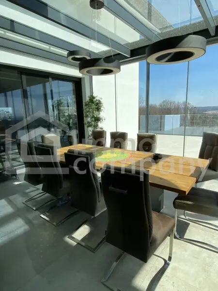 EG: großer Wohn- und Essbereich, Gastro-Edelstahlküche, Kühl- und Gefrierraum, überdachte Terrasse, Wintergarten, WC, Lift u.a.