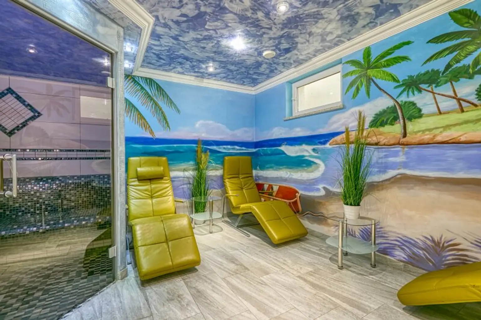 * Stilvolle Details wie Wandmalereien und Designerbeleuchtung