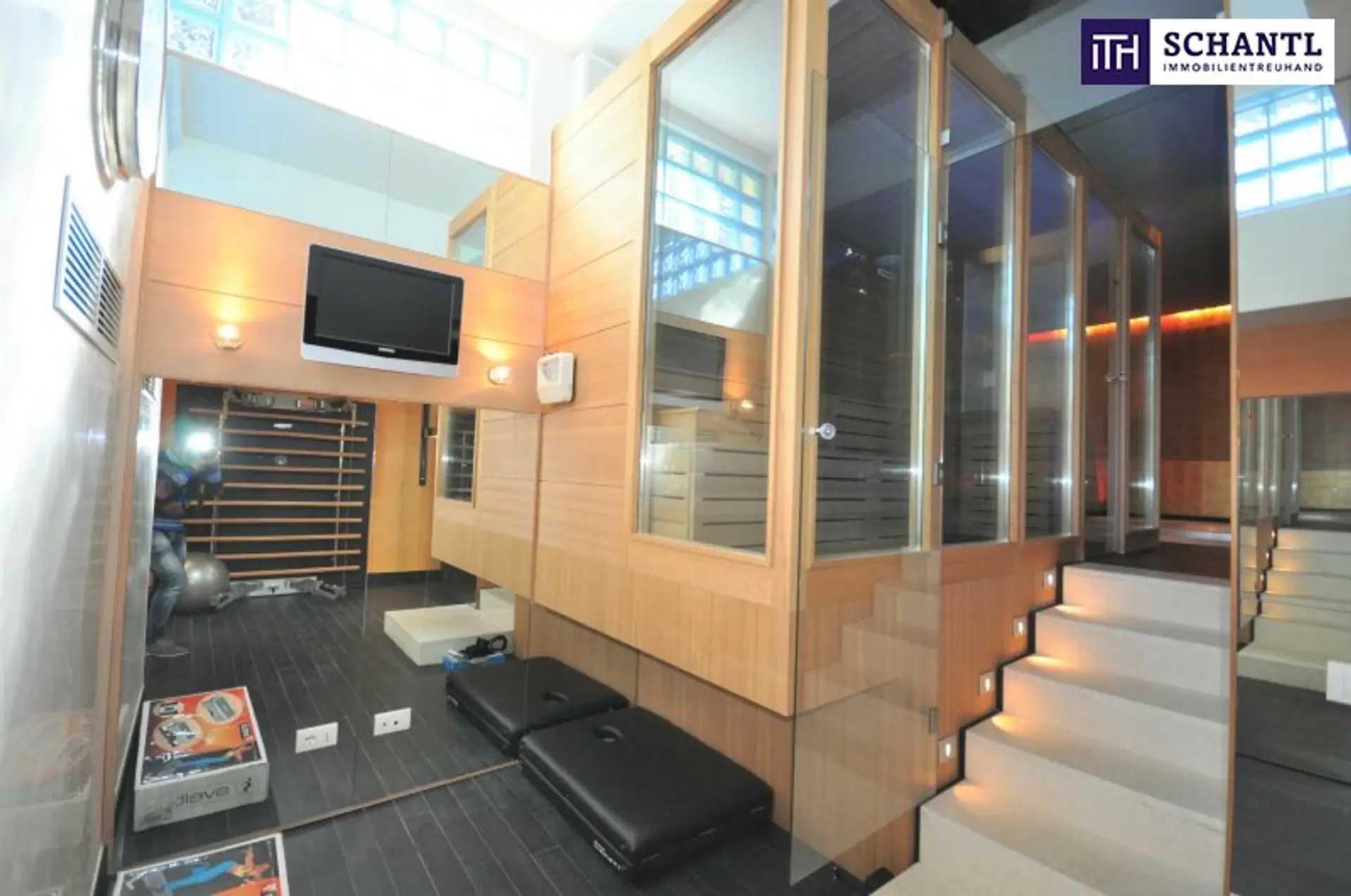 Das Untergeschoss der Villa ist der Entspannung und Freizeit gewidmet, ein wirklich exklusiver Wellnessbereich mit verglaster Sauna, einem türkischen Bad, einem Whirlpool für 6 Personen, einer Erlebnisdusche und einem Fitnessraum. Ebenfalls befindet sich hier die Waschküche, eine prächtige Taverne mit Kamin, welche mit eleganter Holzvertäfelung ausgestattet wurde, sowie der Weinkeller welcher ebenfalls mit geschnitztem Kiefernholz verkleidet wurde, die Serviertheke und der Zapfhahn für Bier und Wein.