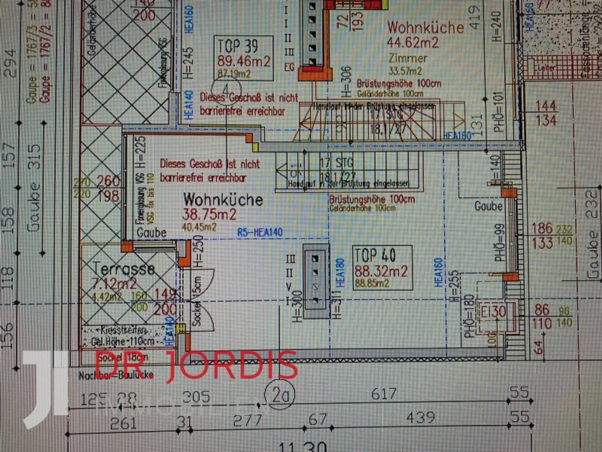ein Vorzimmer, ein Schlafzimmer (Fenster gehen nach hinten in den Hof), einem weiterem Zimmer, ein Bad mit Dusche und Badewanne, einer schönen Holztreppe, die in die Mansarde führt. Dort befinden sich ein Wohnraum mit direktem Ausgang auf die etwa 10 m² große Terrasse (Panorama-Terrassentüre), Wienblick und einem Wohnbereich. Die Küche (39 m²) ist als offene Küche eingerichtet und komplett (Bosch) ausgestattet. Die Wohn und Schlafbereiche sind mit hochwertigen Bogen und Bahnenparketten ausgelegt, die Nassräume mit Feinsteinzeug. Dieser Wohnung ist ein Kellerabteil zugeteilt. Im Haus befindet sich ein Lift. Diese Wohnung wird möbliert übergeben.