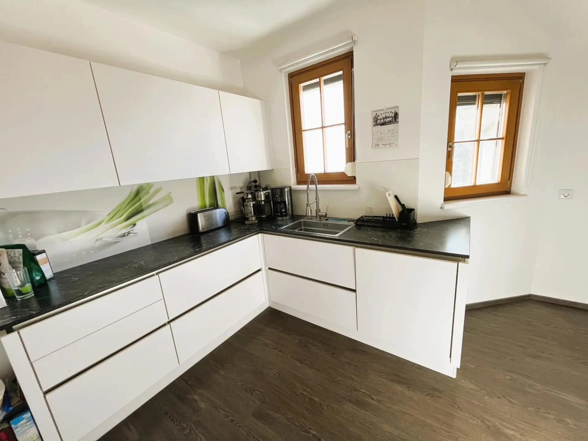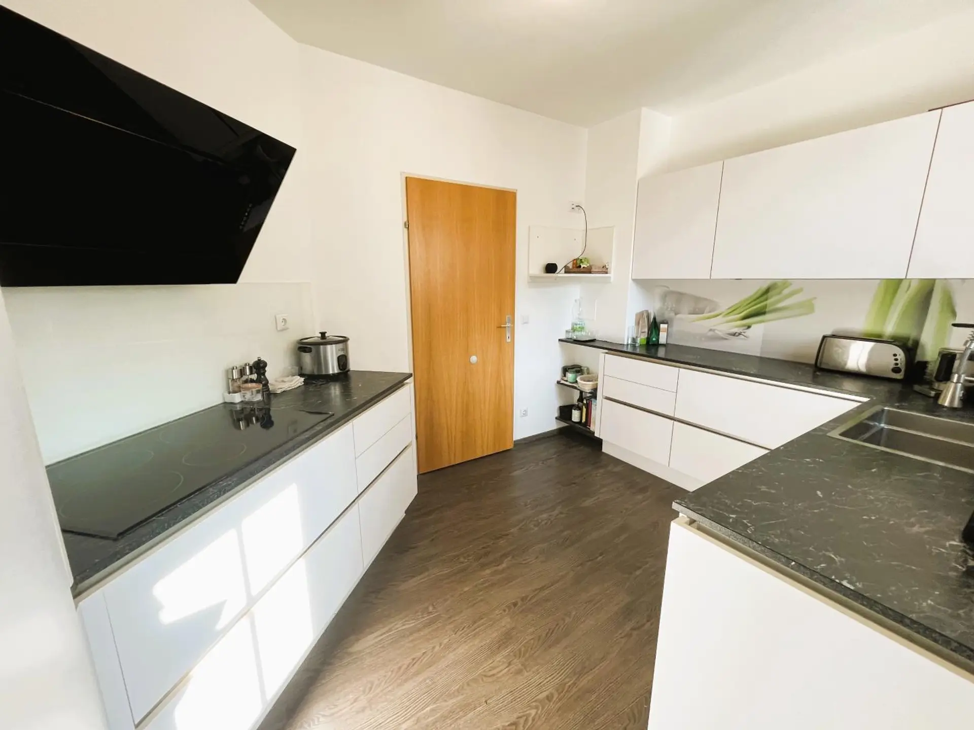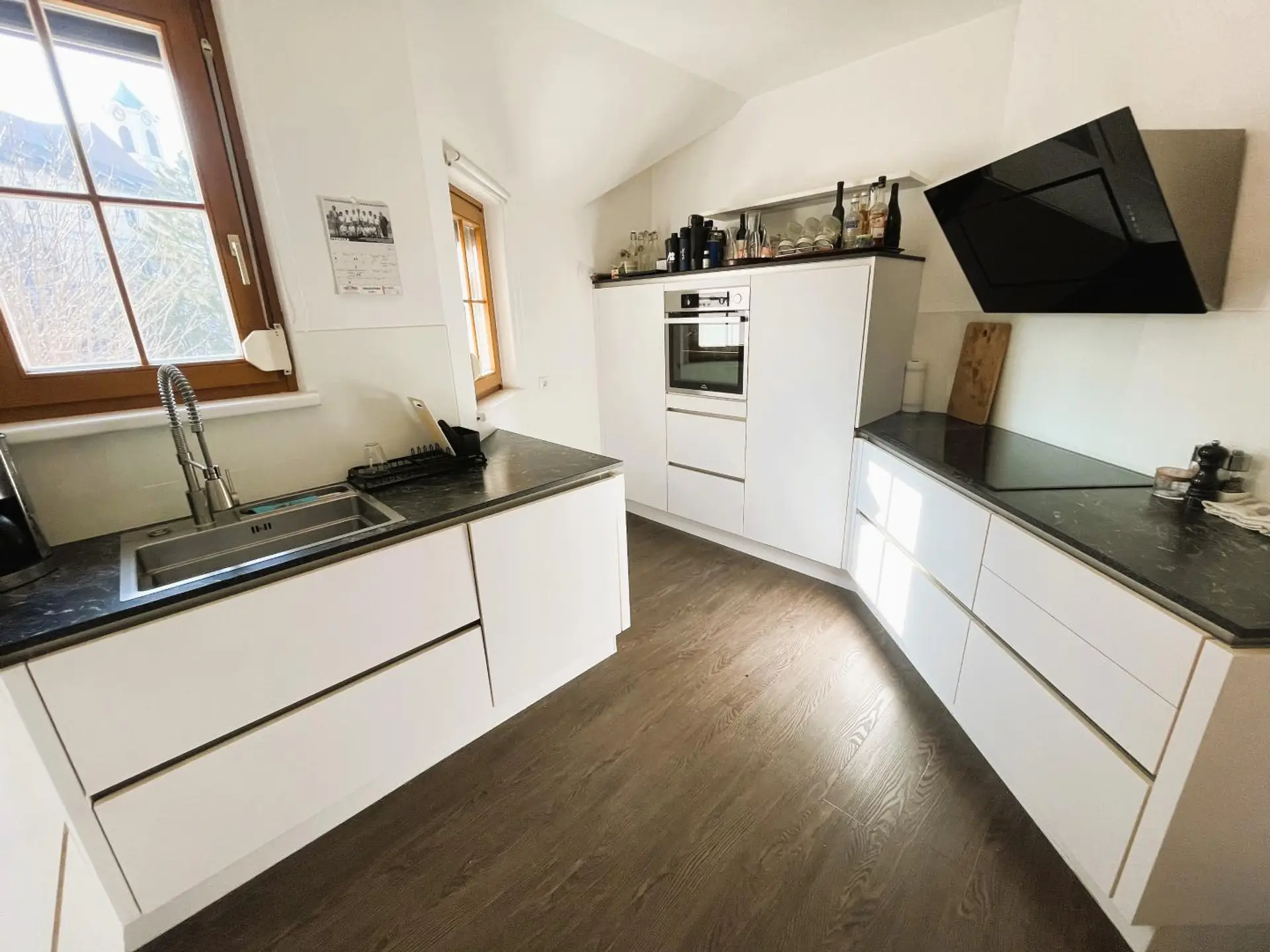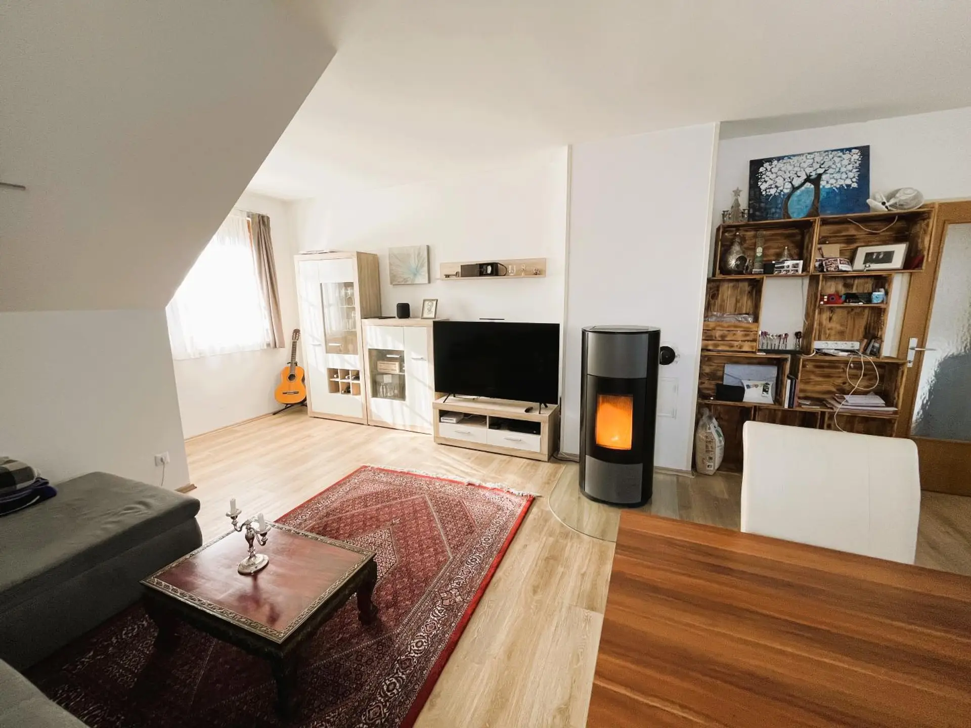 Herzstück der Wohnung ist ein großzügiger Wohnraum mit einem Pelletofen, der angenehme Wärme durch den Raum strömen lässt. Der Raum ist lichtdurchflutet und bietet ein modernes, kommunikatives Wohnen.