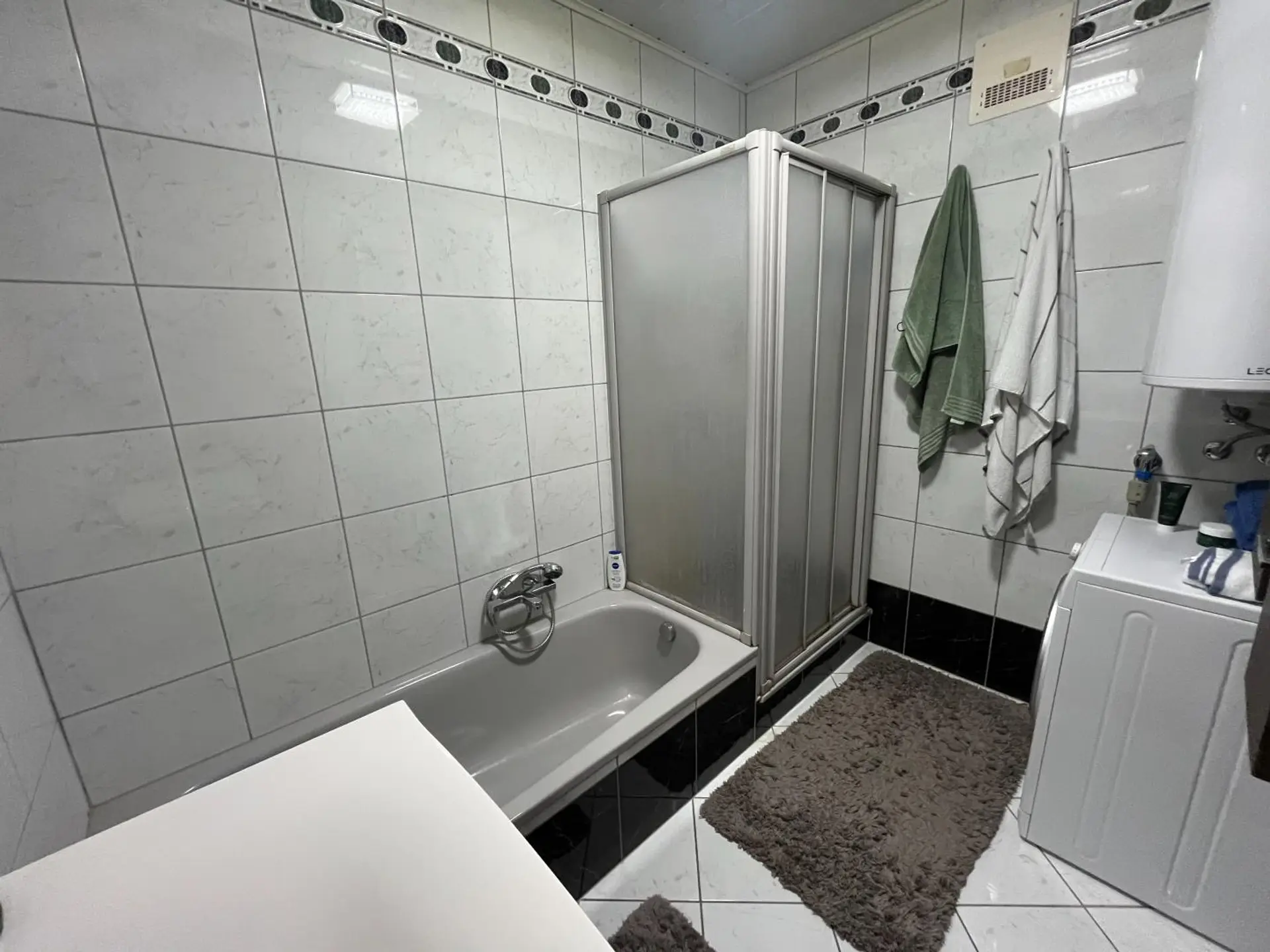 > Badezimmer mit Badewanne, Dusche und Waschmaschinenanschluss