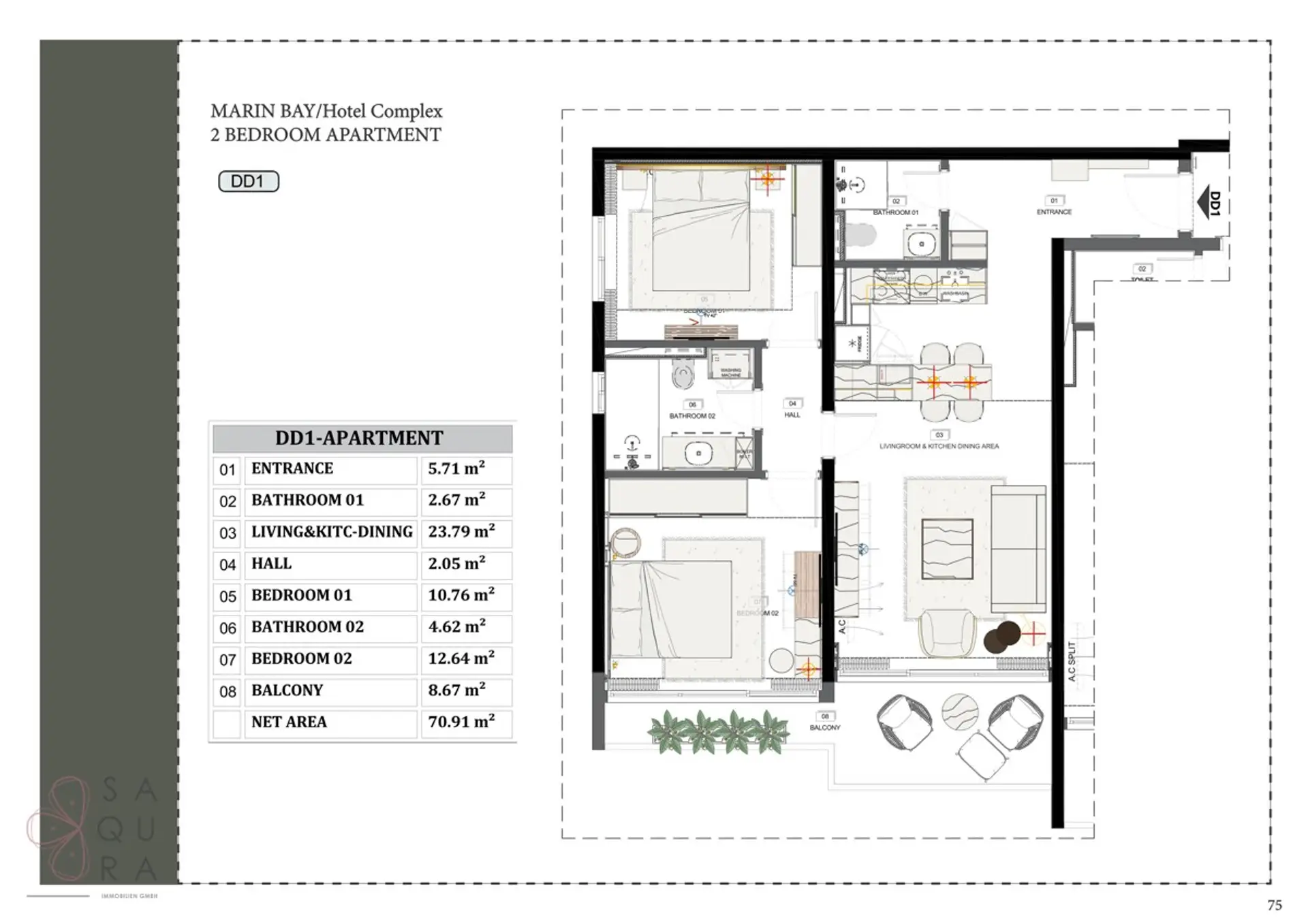 Apartment DD1 – 2 Bedrooms | approx. 70.91 m²