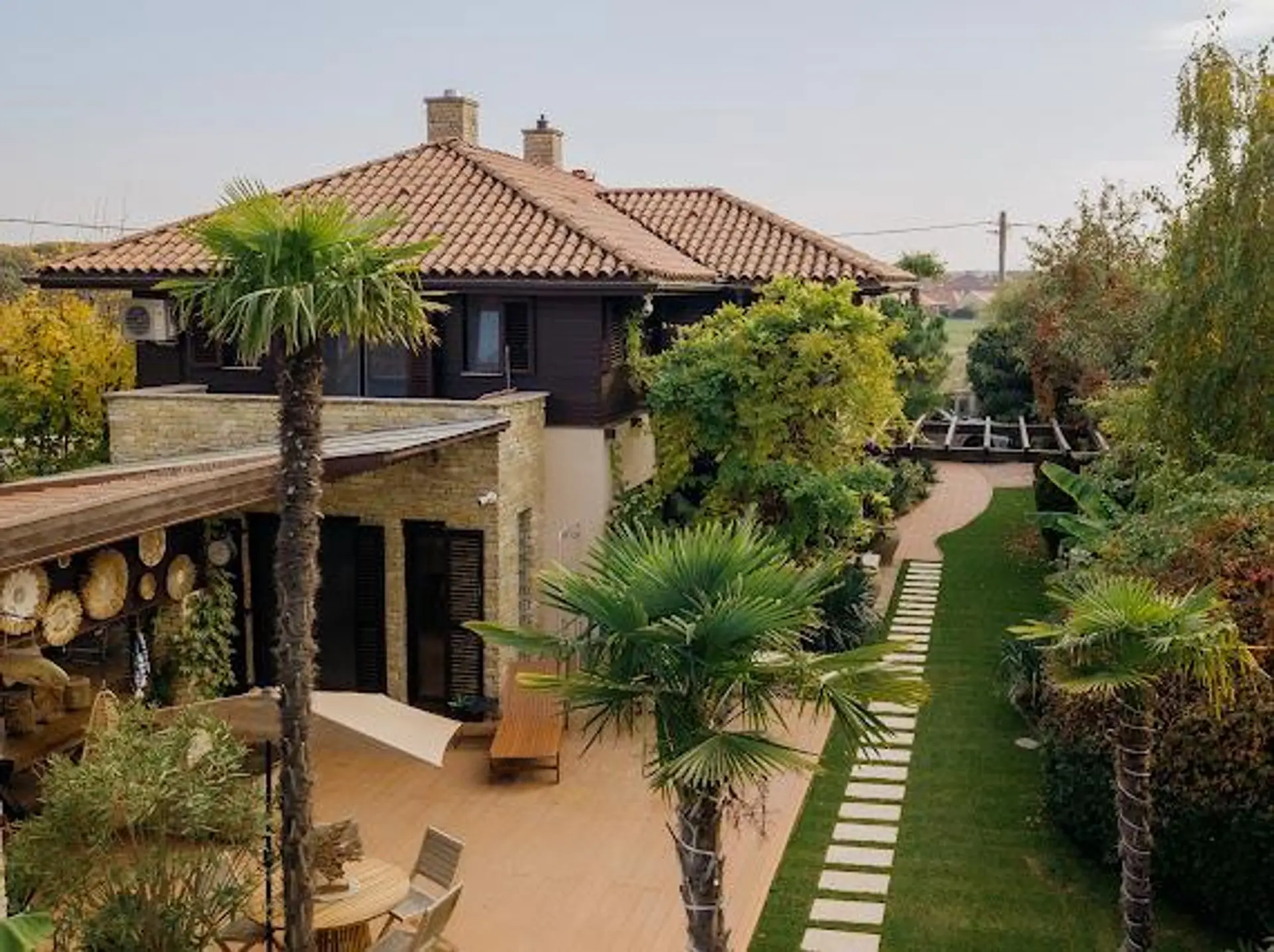 Bereits beim Betreten des Anwesens spürt man die besondere Handschrift: Warme Erdtöne, Naturstein-Elemente, mediterrane Dachziegel und sorgfältig ausgewählte Palmen-und besondere Pflanzen schaffen eine Atmosphäre wie in Norditalien oder an der Adriaküste.