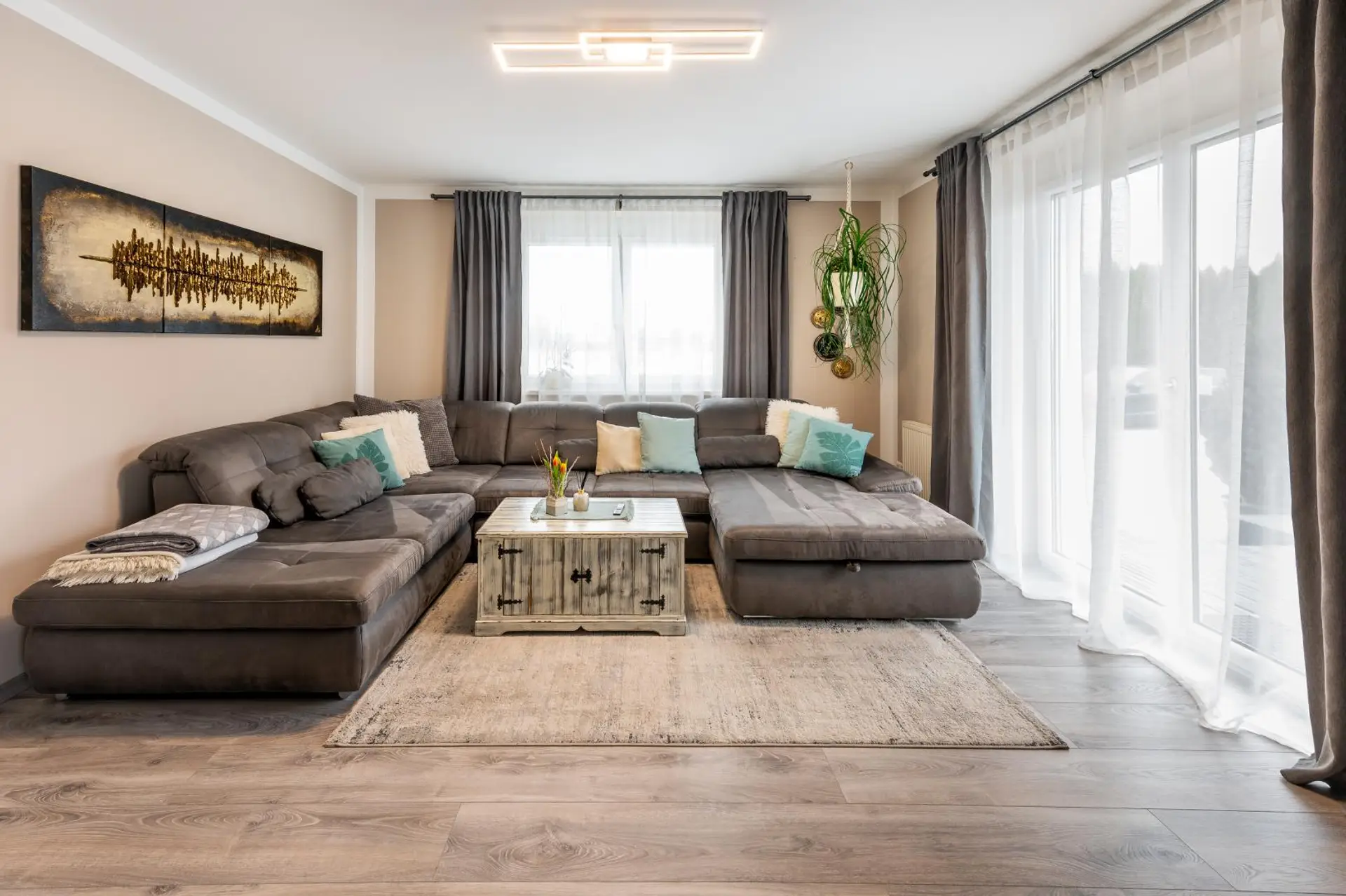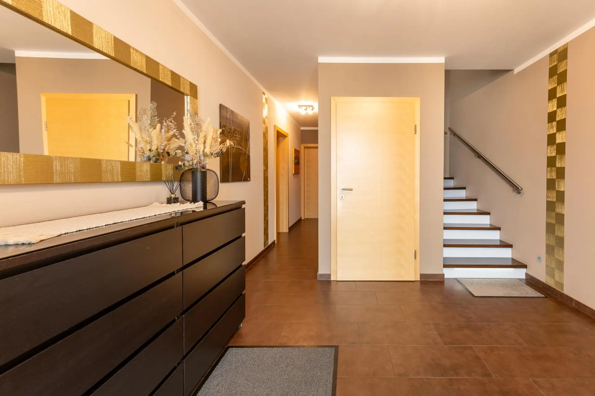 Das Erdgeschoss bietet auf ca. 117,81 m² ein einladendes Wohnambiente mit großzügigem Wohn- und Essbereich inkl. Küche und Speis, ein Gästezimmer sowie Bad mit WC.