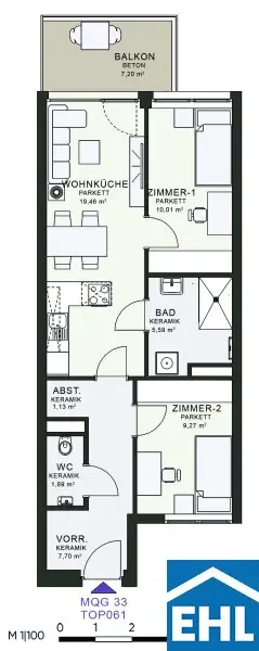 Ausstattung: Barrierefrei Boden Fahrstuhl Wohnküche / offene Küche Bad Fahrradraum Abstellraum Fußbodenheizung Balkon