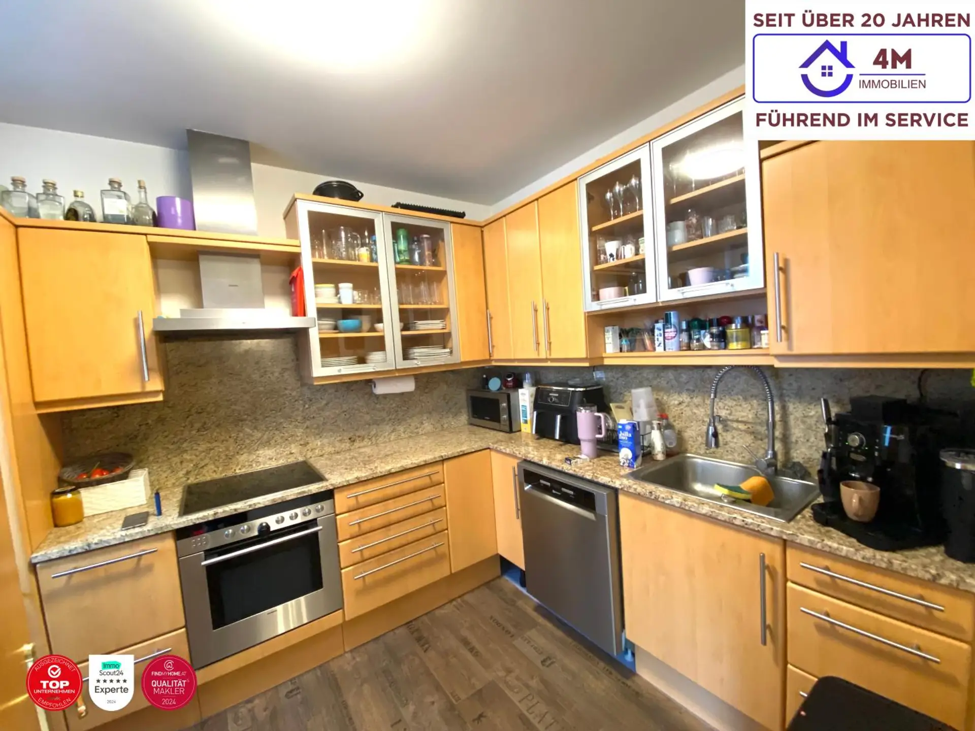 Die Küche ist kein weißer 08/15-Küchenblock, sondern eine hochwertige DAN-Küche in warmen Naturtönen mit griffigen Metallgriffen, echtem Granit und bodentiefe Fenster, das die Fläche mit Tageslicht flutet.