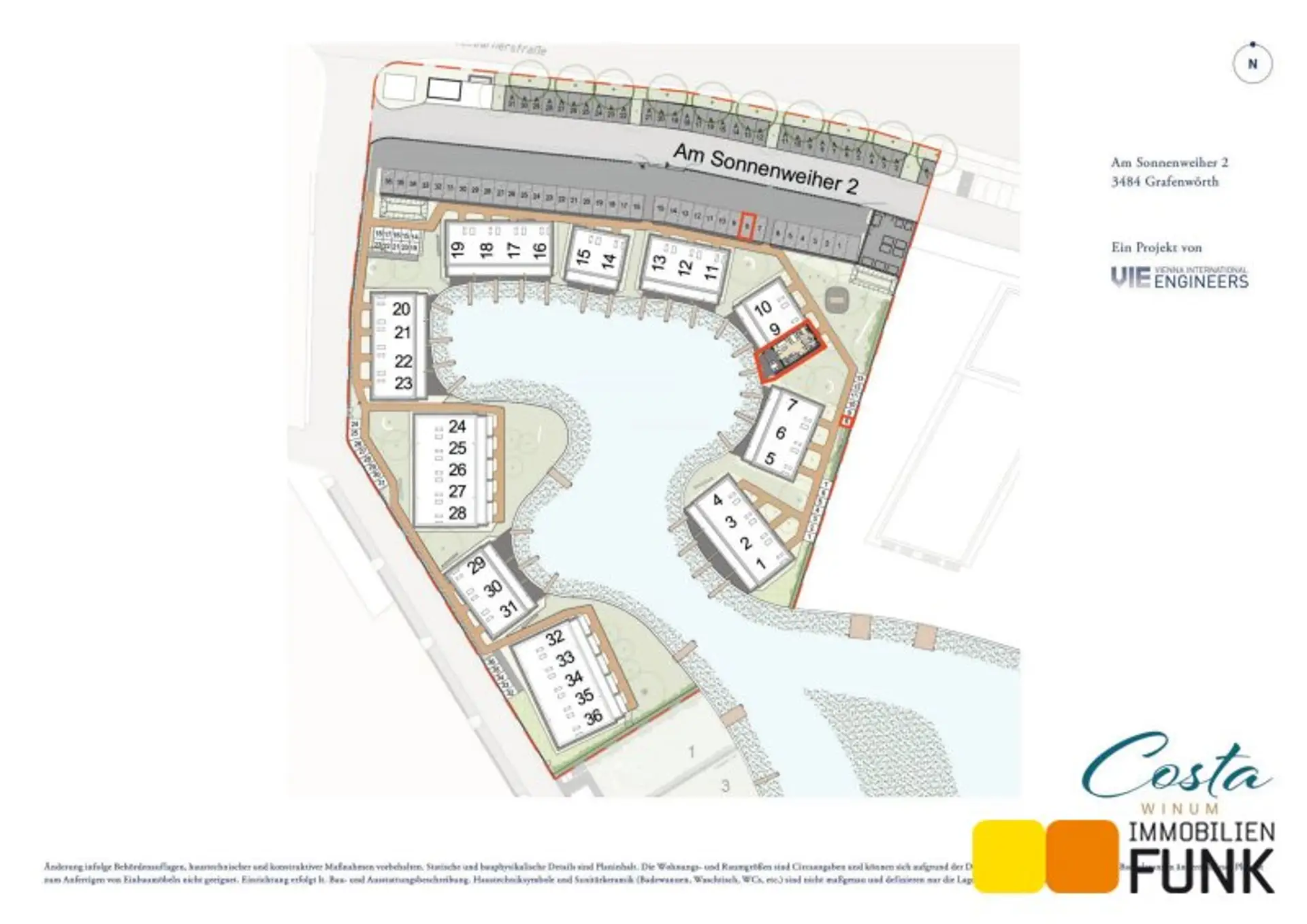Sich den Traum vom Haus am See erfüllen und 365 Tage Urlaubsfeeling genießen. Das ist möglich im Sonnenweiher Grafenwörth, ca. 30 Fahrminuten von der Stadtgrenze Wiens entfernt, im Herzen der Region Wagram zwischen Wien und der Wachau. Ein nachhaltiges, gut durchdachtes Gesamtkonzept, erstklassige Architektur, hochwertige Ausstattung und viel Grünraum fördern das besondere Lebensgefühl am Sonnenweiher. Die Verkehrsanbindung Richtung Wien und Krems (S5, Stockerauer Schnellstraße) sowie nach St. Pölten (S33) ist ausgezeichnet. In der Gemeinde Grafenwörth gibt es ausreichend Einkaufsmöglichkeiten für Güter des täglichen Bedarfs, Kinderbetreuungseinrichtungen und Schulen. In diesem wunderbaren, regionalen Umfeld eingebettet, entstehen an einem mäanderförmig angelegten, ca. 36.000 m² großen See in mehreren Bauabschnitten insges. 170 Wohnimmobilien in Form von Einfamilien-, Doppel- u. Reihenhäusern im Eigentum sowie 36 kleine Seehäuser im Wohnungseigentum.