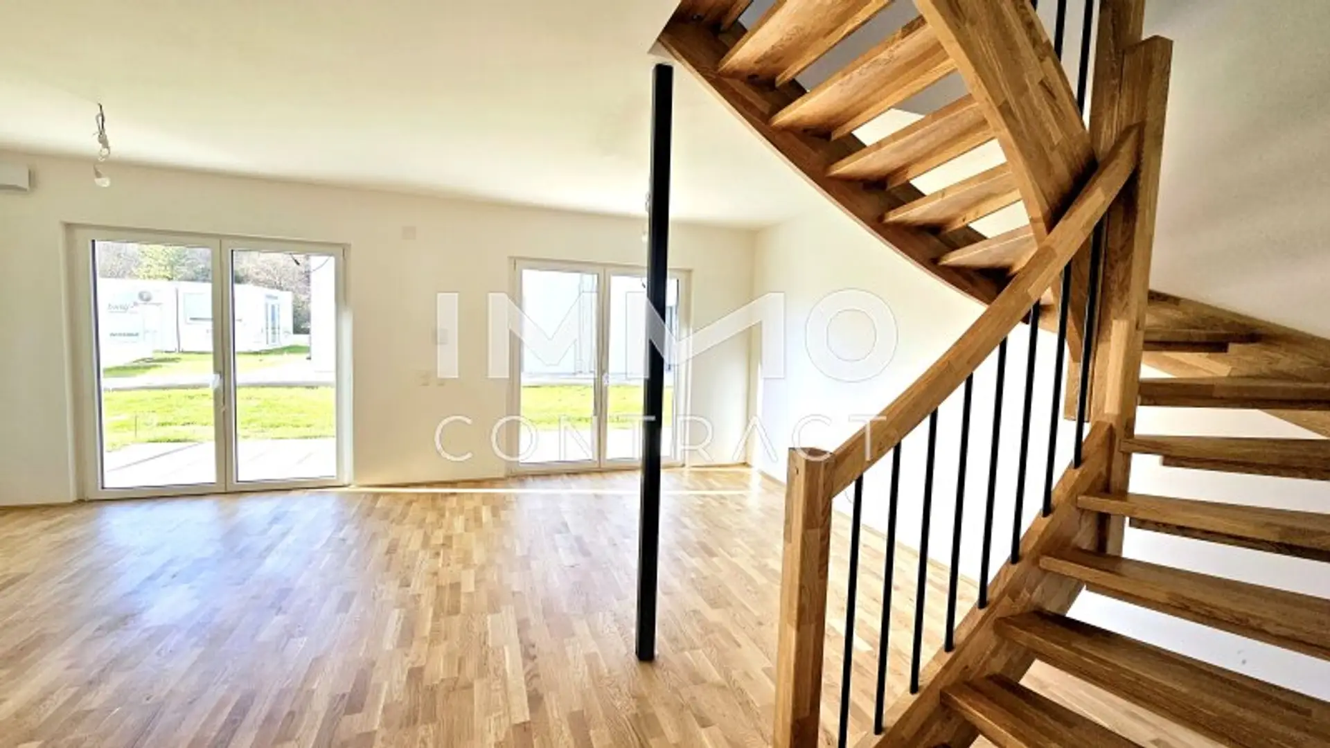 Das Erdgeschoß besteht aus einem großen Wohn-/Esszimmer mit integrierter Küche, Gäste-/Arbeitszimmer, Technikraum, Vorzimmer und WC. Die Küche ist nicht möbliert - so haben Sie die Möglichkeit, Ihre eigenen Einrichtungsideen umzusetzen.