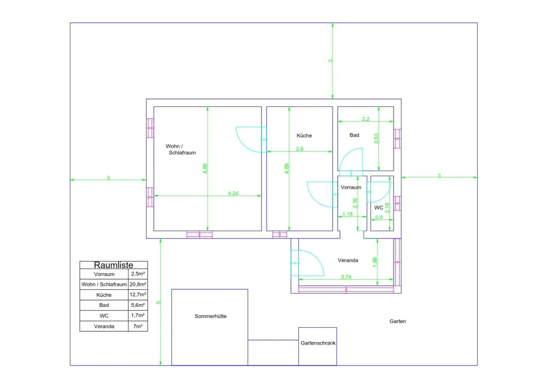 Veranda, Wohnküche, Wohn-/Schlafraum, Bad mit Badewanne und Duschwand, separate Toilette.
