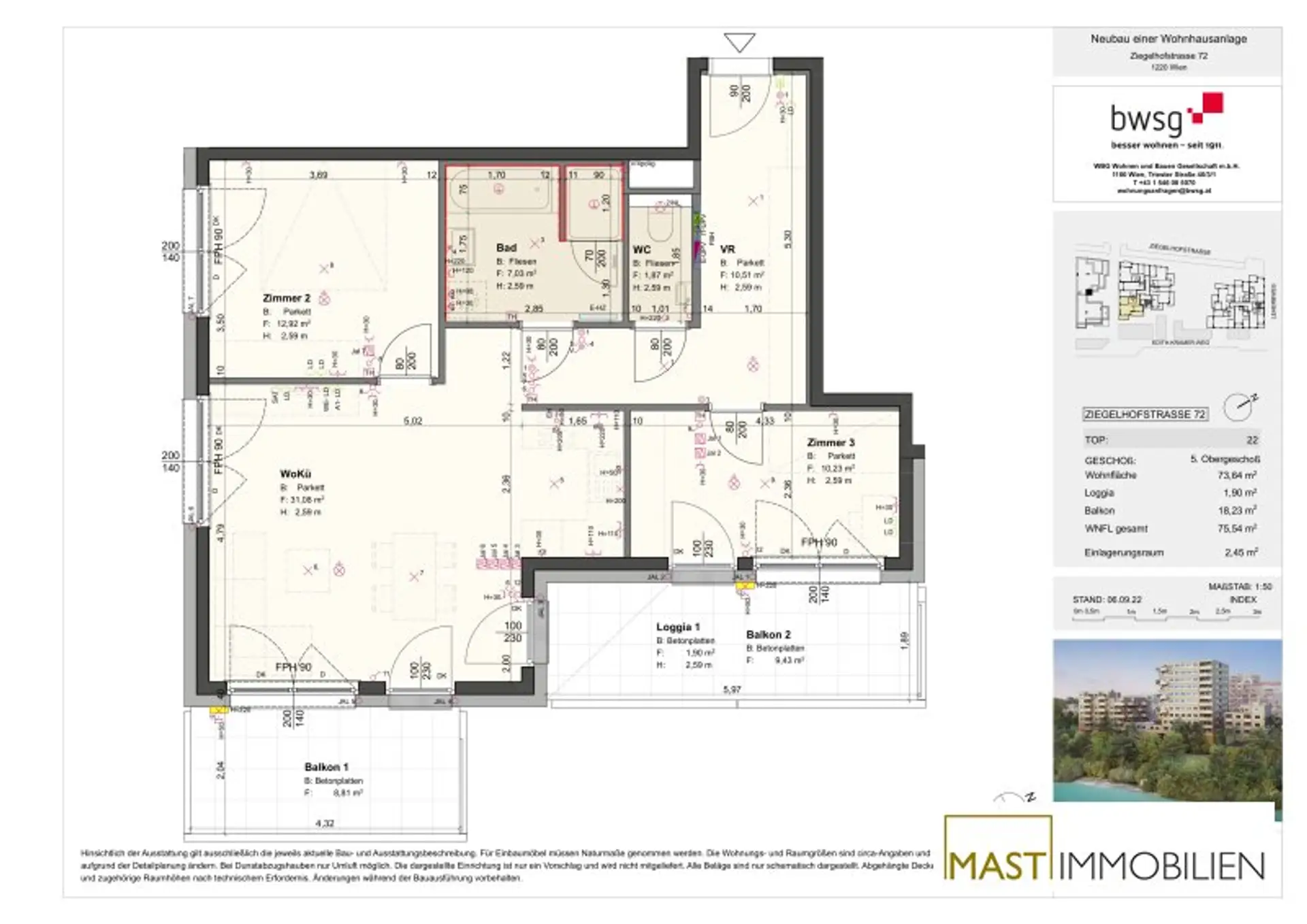 Die Wohnung befindet sich im 5. Obergeschoss und verfügt über 73,64 m² Wohnfläche + einen 8,81 m² großen Balkon und einen zweiten 11,33 m² großen Balkon/Loggia.