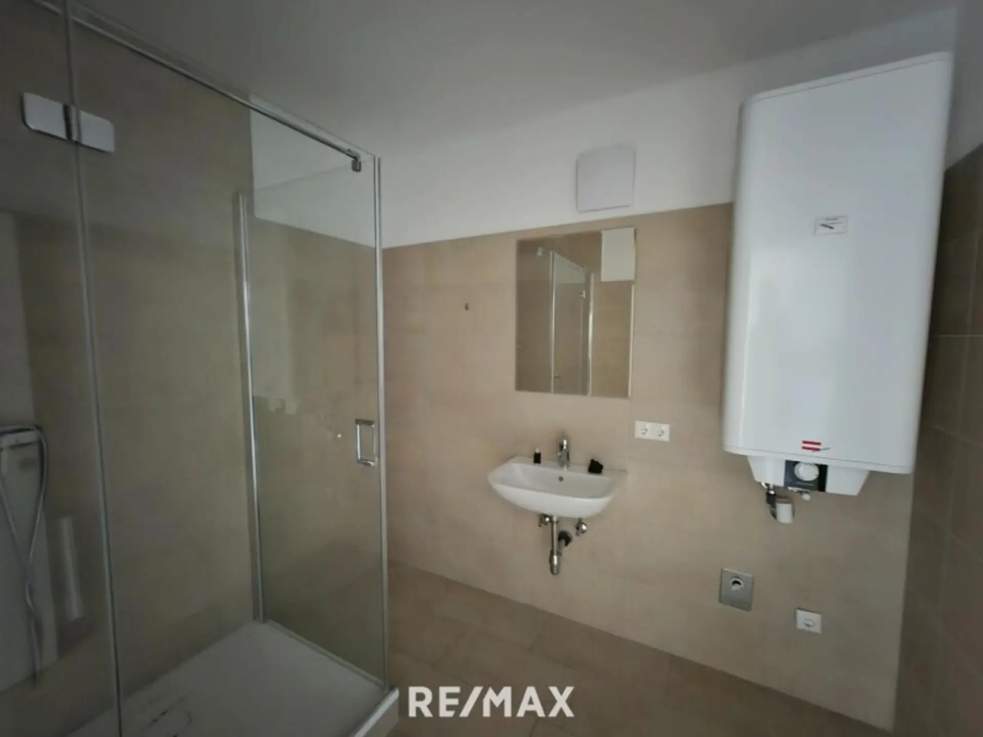 Das Badezimmer ist mit einer großzügigen Dusche sowie einem Waschtisch ausgestattet, der Komfort und Eleganz vereint.
