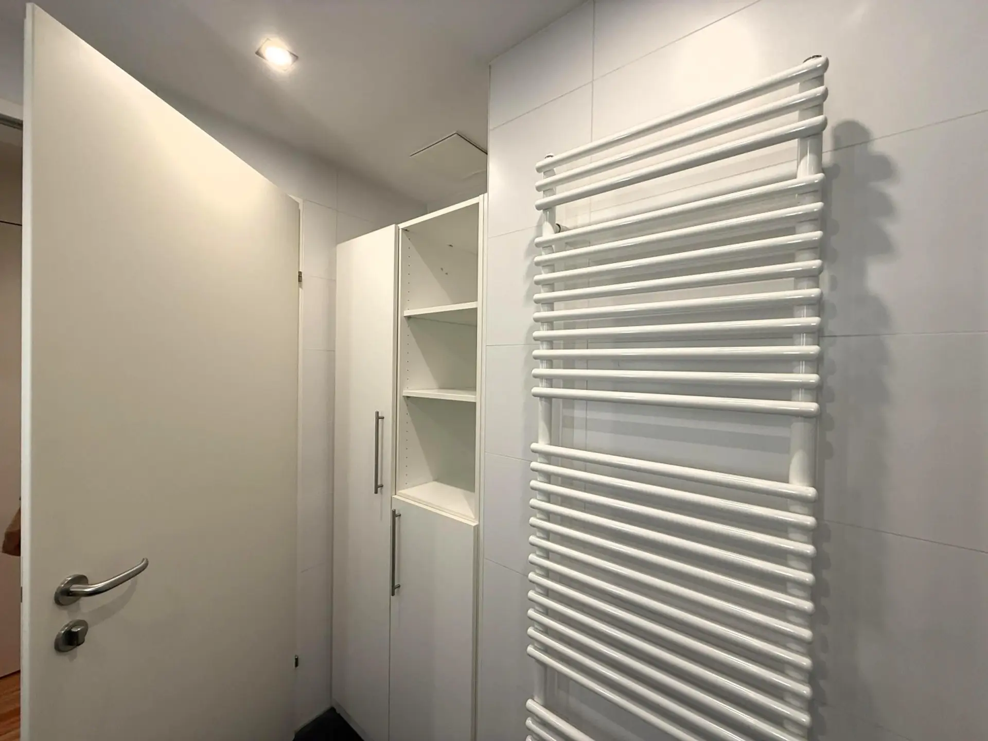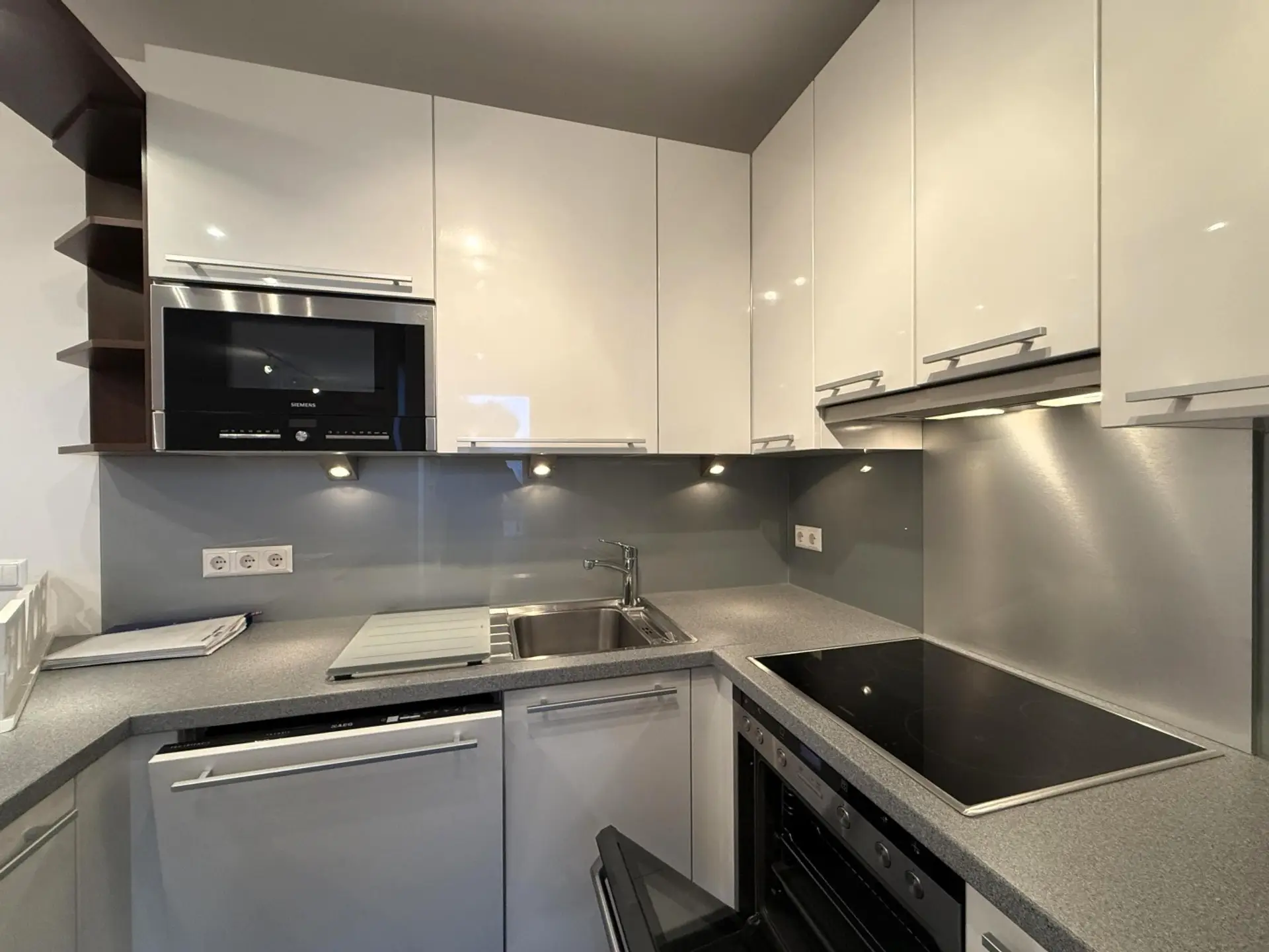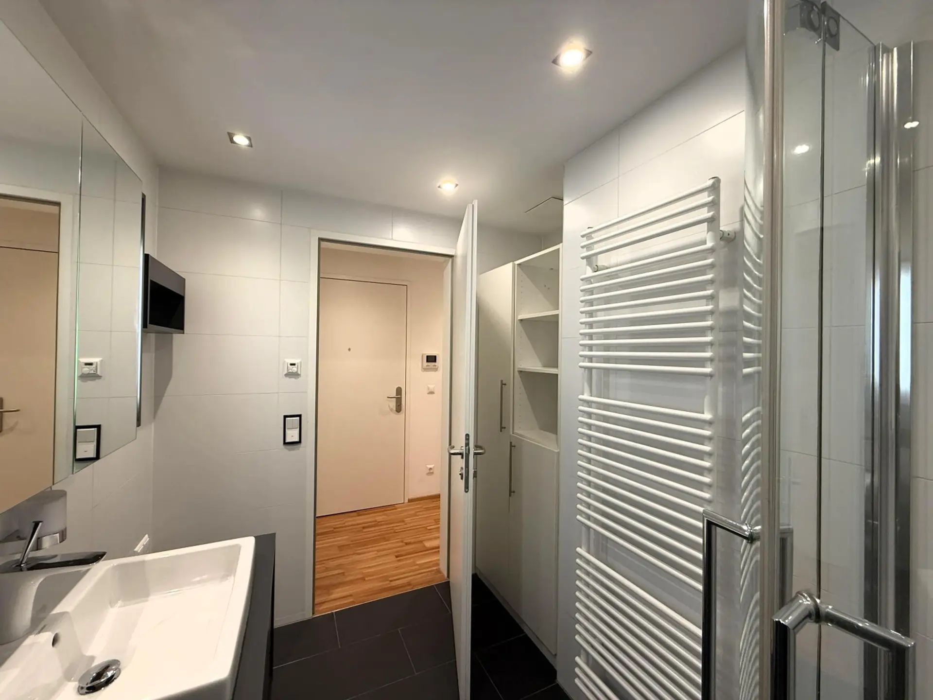 is bright and has a very efficient, modern layout. It is 51.53 m² in size and has a tiled bathroom with shower, sink, and washing machine/dryer connection, a separate fully automated toilet with a small hand basin, and a 25.68 m² living room/kitchen with a custom-made kitchen with brand-name appliances, which is connected to a 7.19 m² outdoor area/balcony.