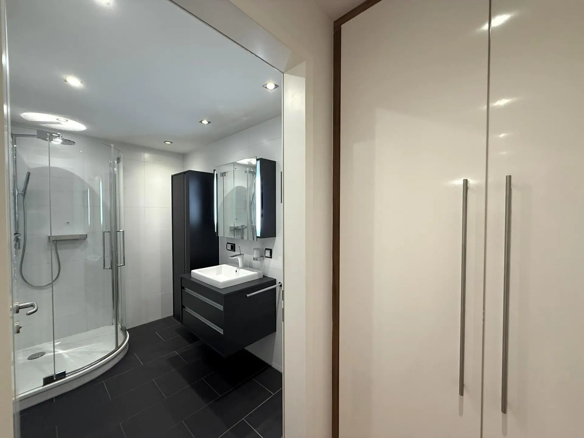 Waschbeckenunter- und verspiegelter Oberbauschrank / Spiegelschrank, Handtuchhalter, Dusche, Duschtrennwand, Handtuchtrockner, Regendusche, Einbauschrank, Hochschrank, Deckenbeleuchtung Einbauspots