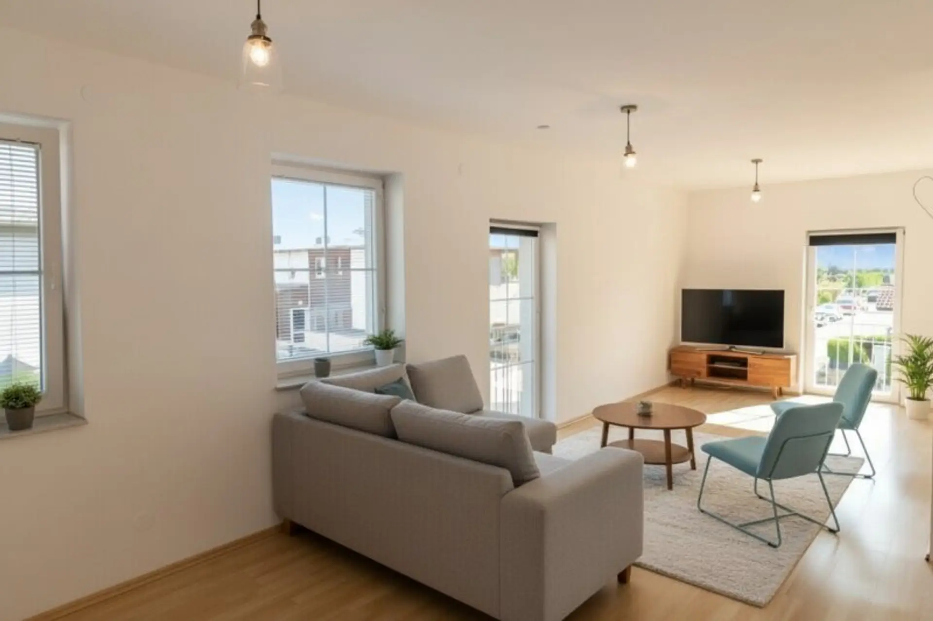 „Die dargestellten Möbel und Einrichtungsgegenstände dienen der besseren räumlichen Vorstellung und wurden mittels KI visualisiert. Sie sind nicht Bestandteil der tatsächlichen Ausstattung der Immobilie.“