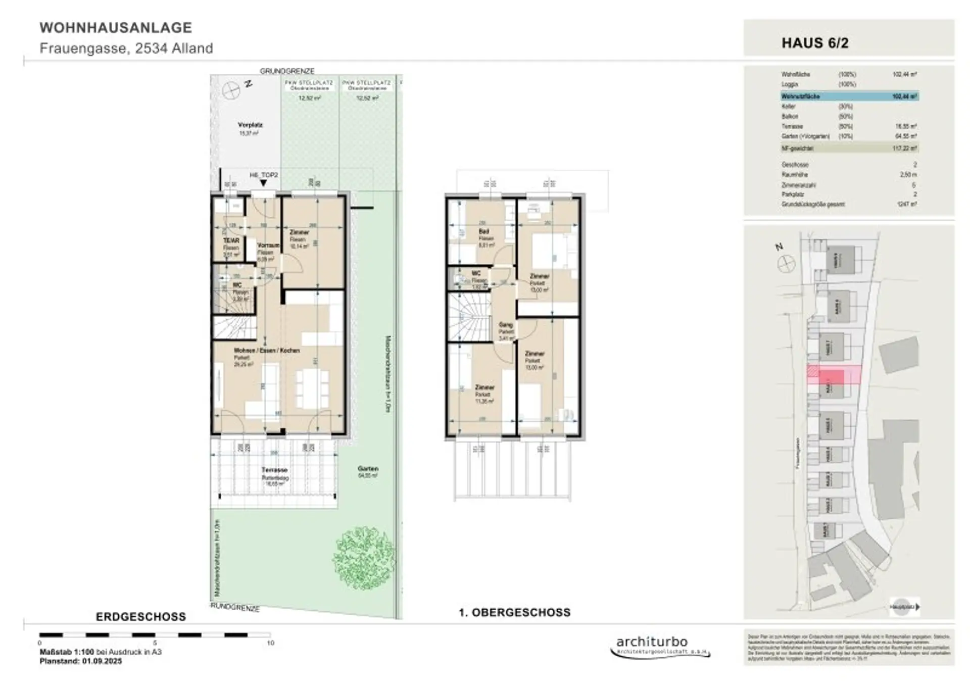 Im Erdgeschoß sind jeweils Vorraum, WC, Technik- und Abstellraum, ein Zimmer sowie eine große Wohnküche mit Ausgang auf die Terrasse und den Garten angeordnet. Im Obergeschoß finden Sie 3 Schlafzimmer sowie ein großzügiges Badezimmer mit extra WC.
